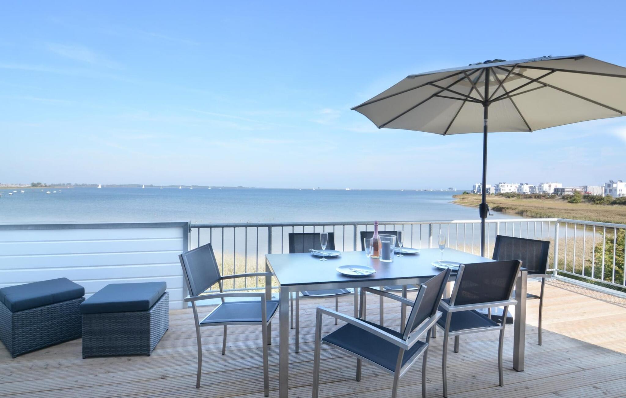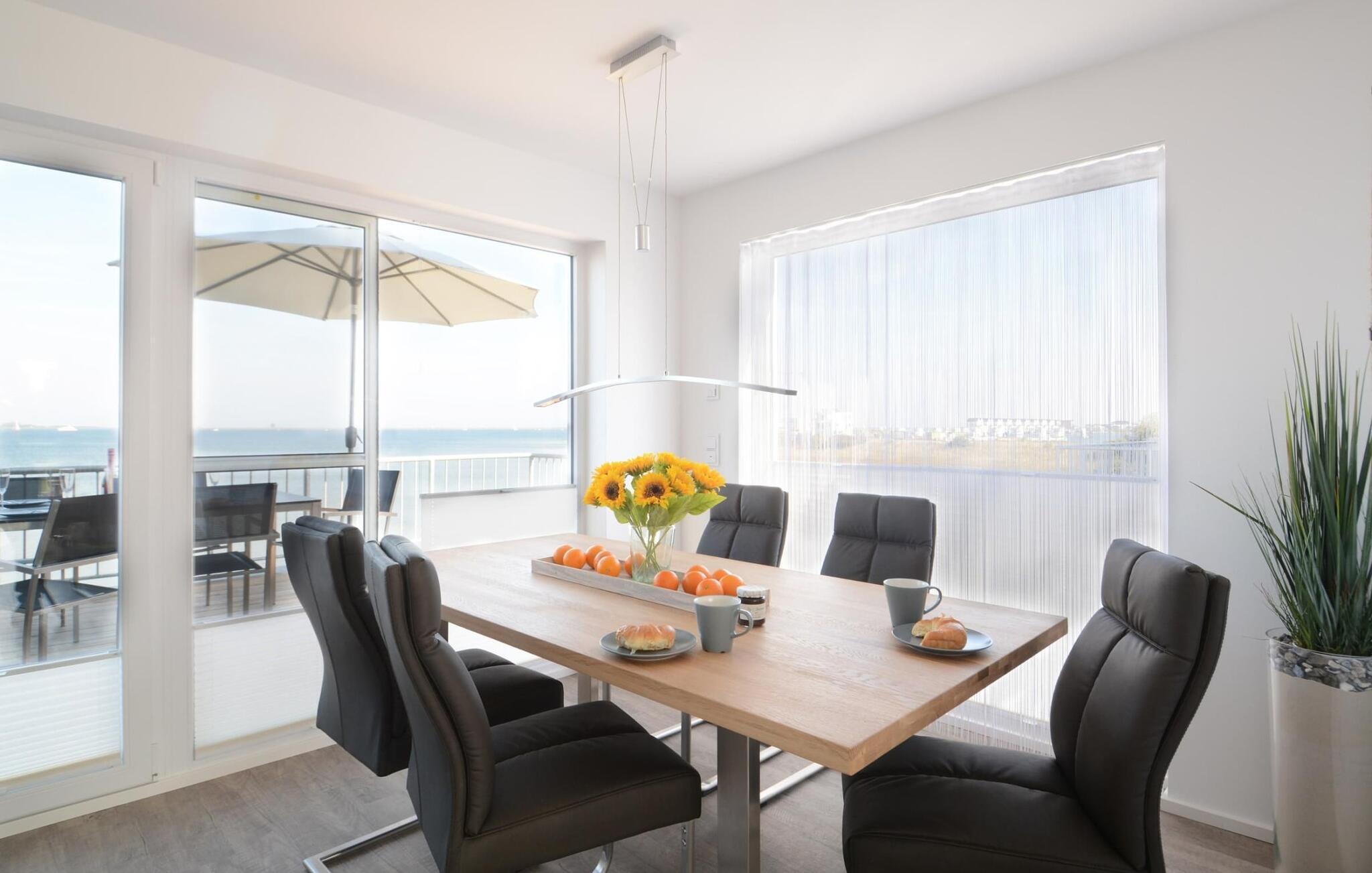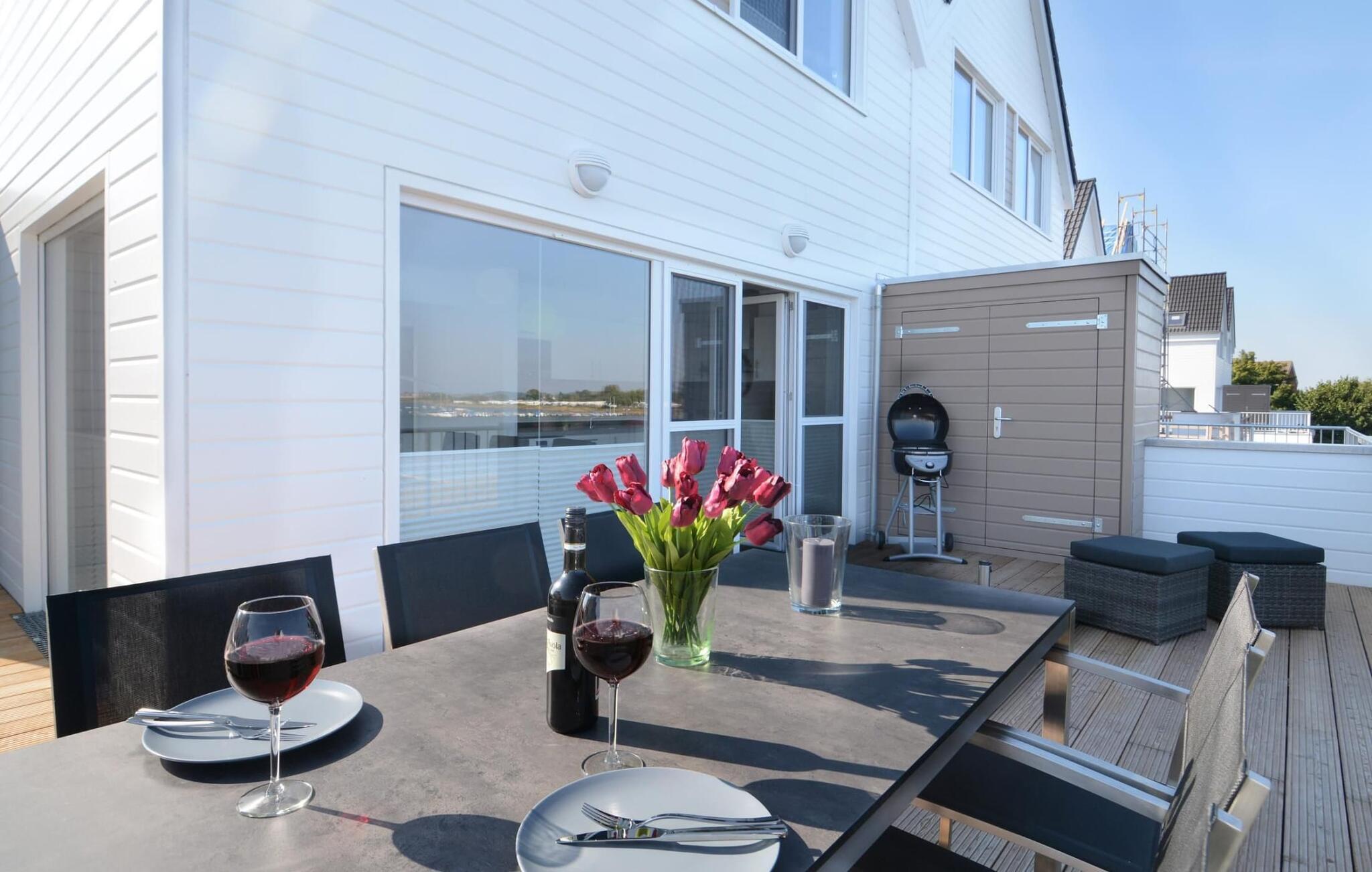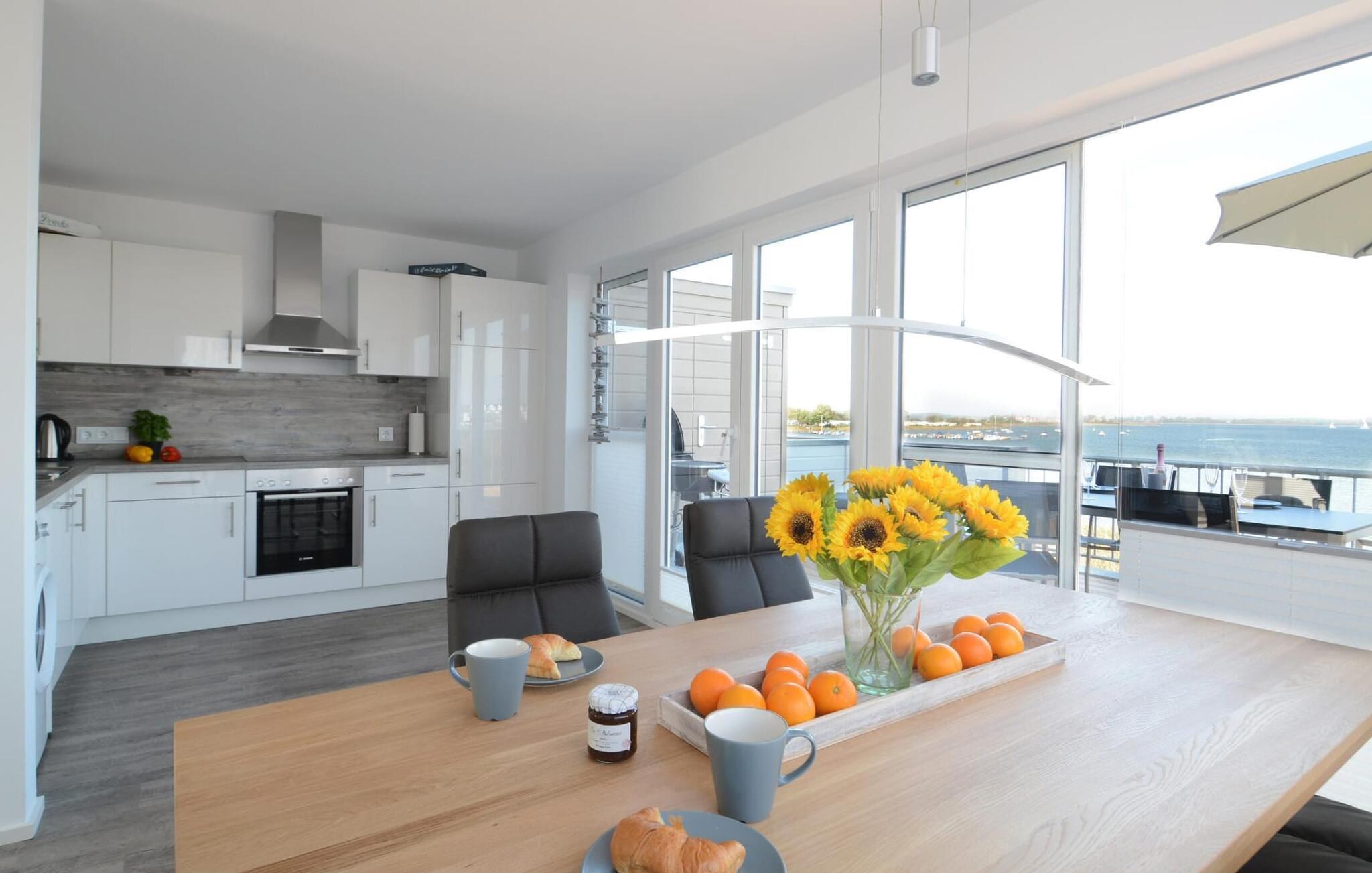 Lichtdurchflutet gestaltet sich der Wohn- /Essbereich der Ferienwohnung mit bodentiefen Fensterfronten zu den anliegenden Terrassen auf beiden Seiten. Traumhafte Aussichten eröffnen sich auf der an den Essbereich angrenzenden Terrasse mit Blick über die weite Schlei. Vorbeifahrende Segelschiffe sorgen während einer geselligen Grillrunde oder eines romantischen Candle-Light-Dinners für Unterhaltung.