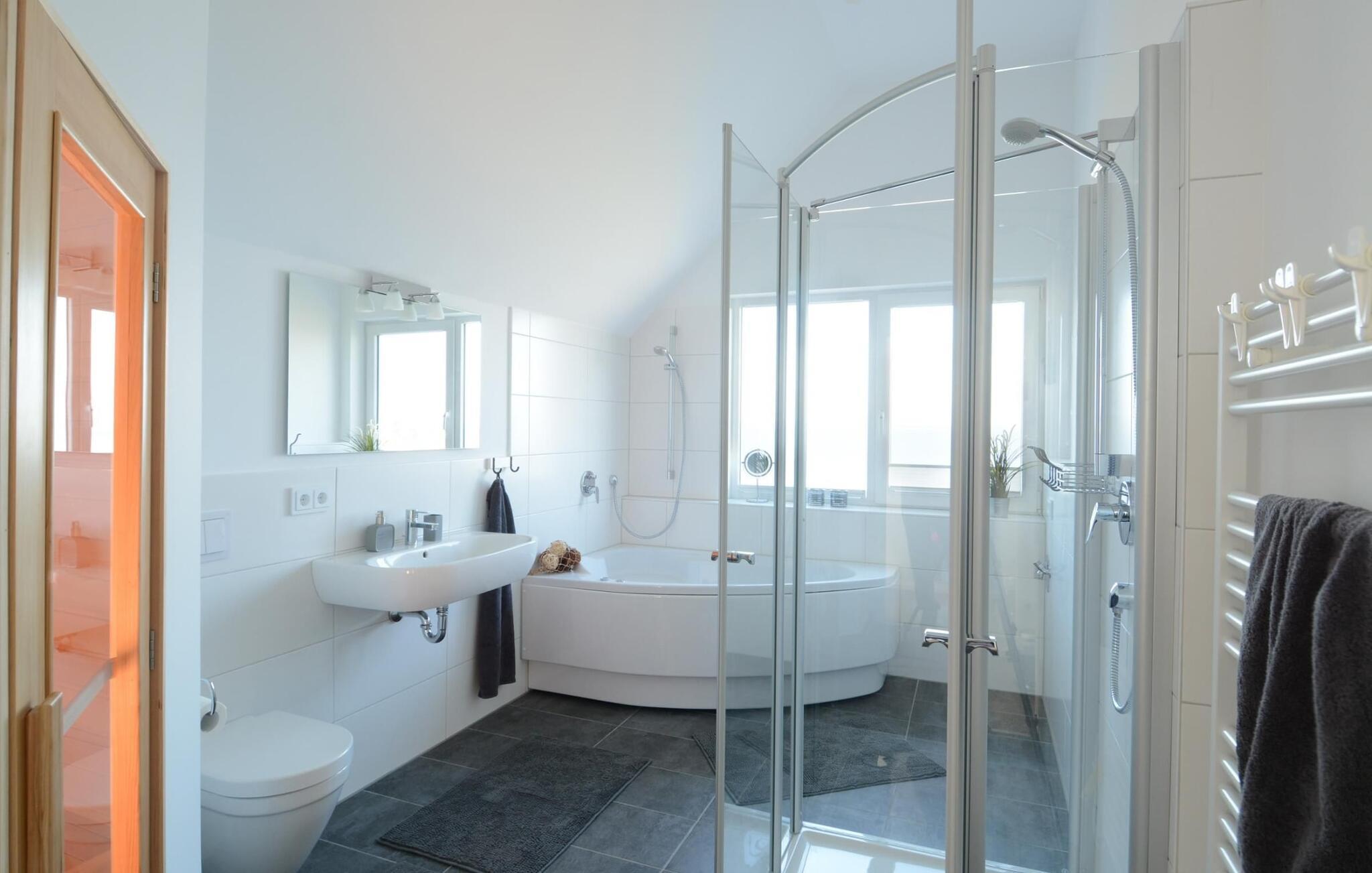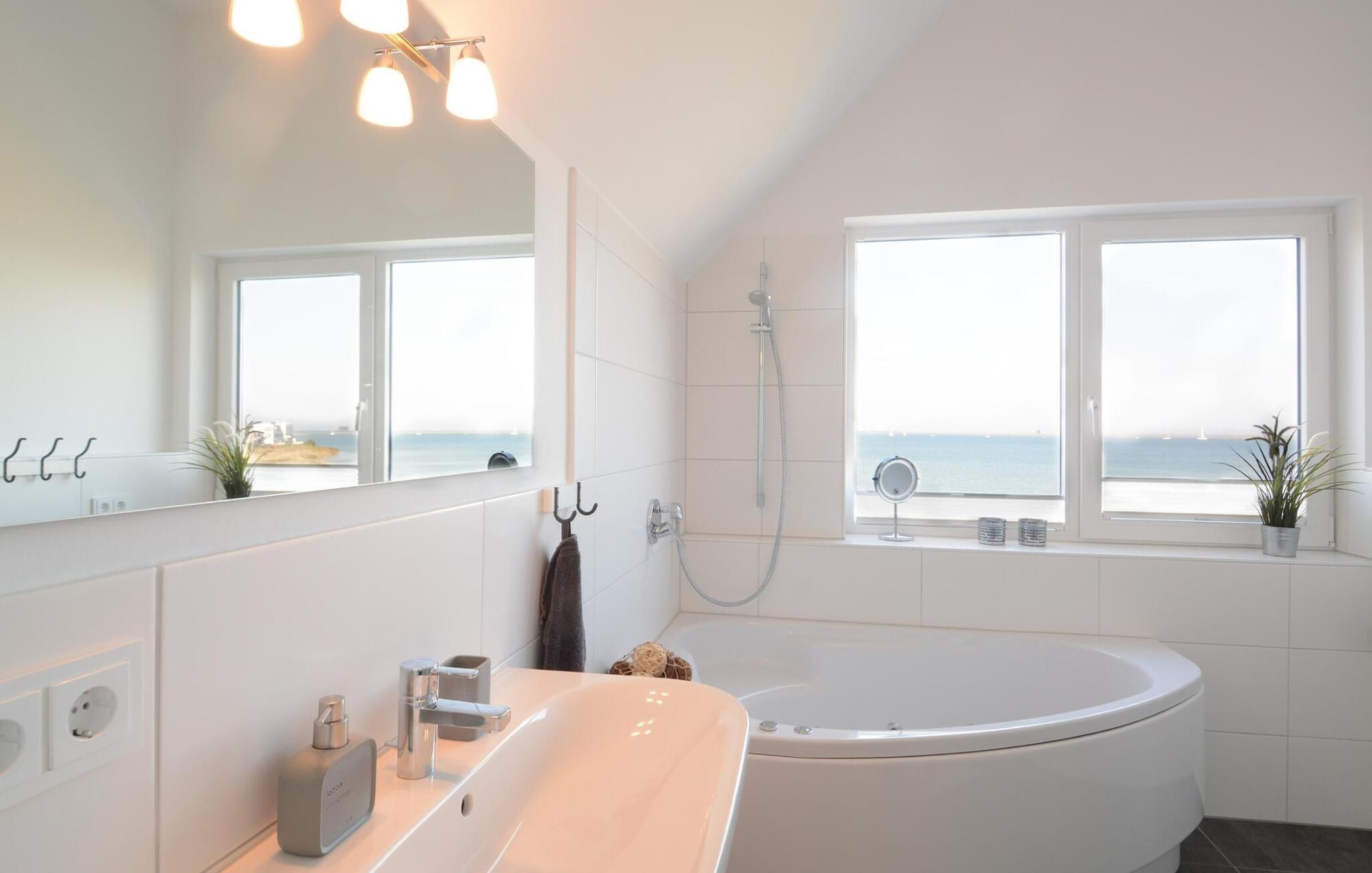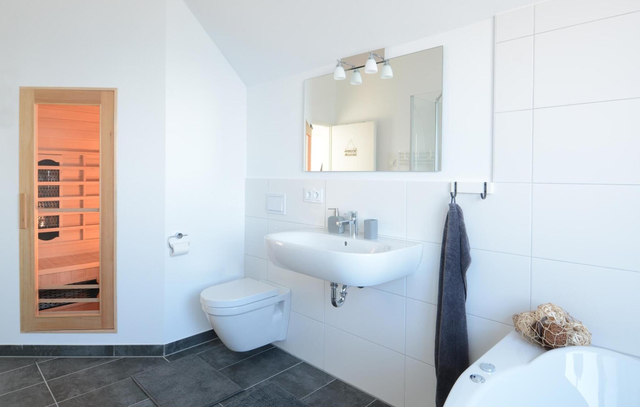 Die Ferienwohnung Wilbur punktet außerdem mit einem privaten Wellnessbereich: Eine Infrarot Wärmekabine mit Hifi-Sound-System und LED-Farblichttherapie sowie eine große Relax-Whirlwanne mit Wasserblick stehen nach dem Strandspaziergang zum Tiefenentspannen bereit. Auch eine bodengleiche Dusche mit Wasserblick befindet sich im Hauptbadezimmer.