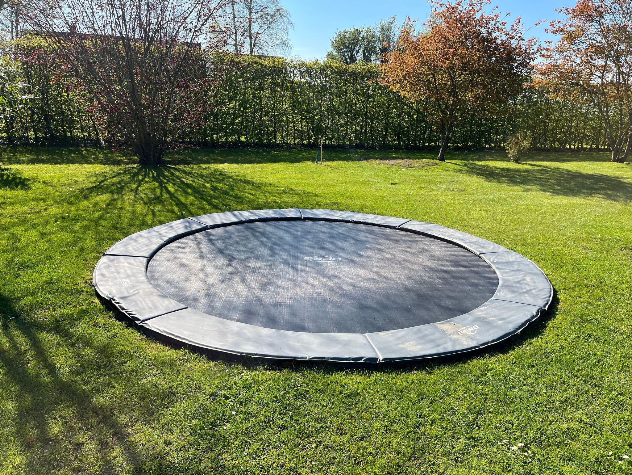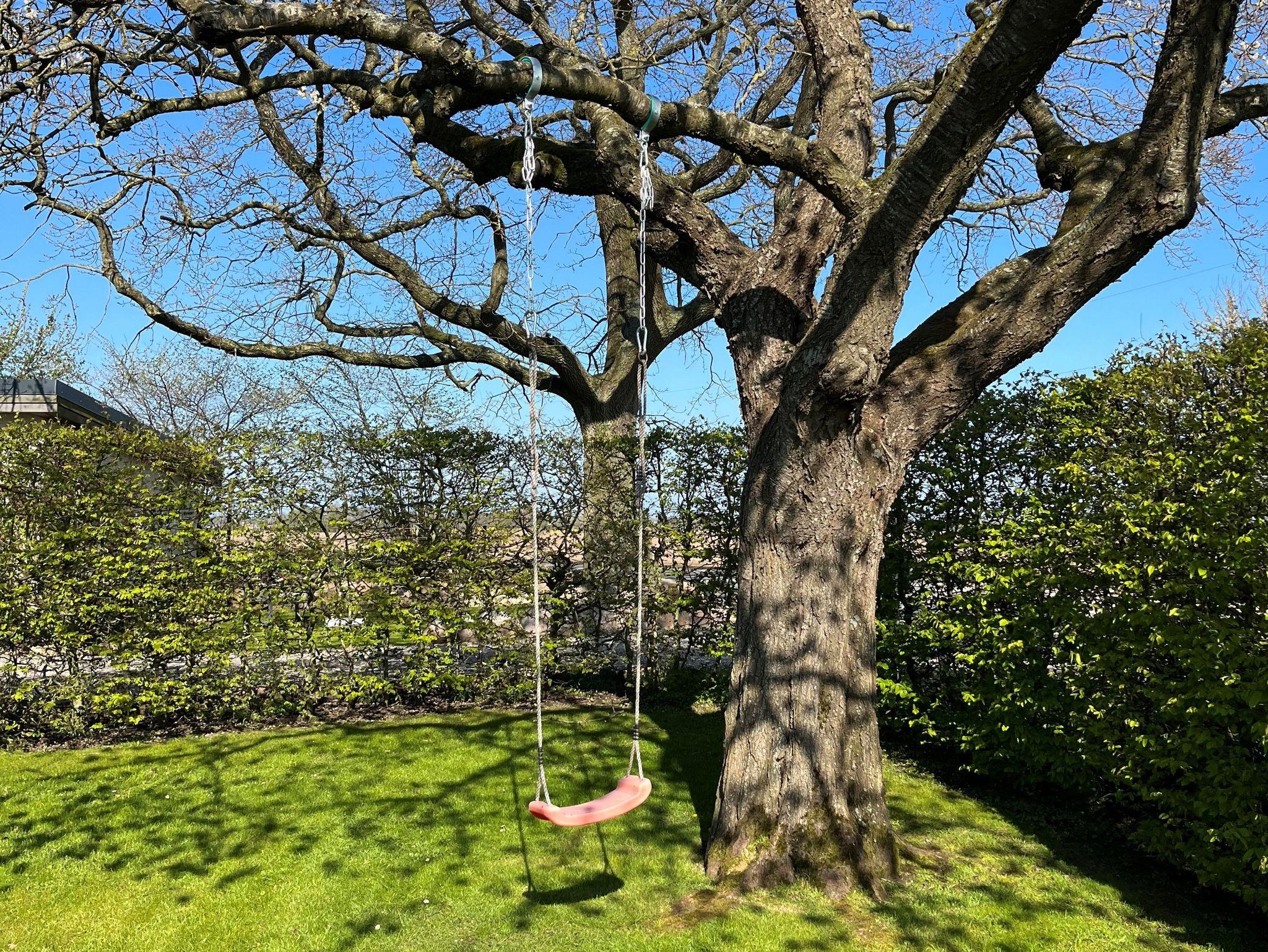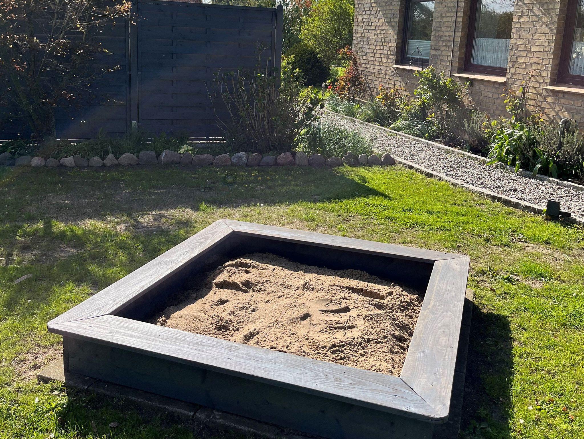 Außenbereich: eingezäunter Garten mit Sandkiste, Schaukel und Trampolin, möblierte Terrasse (Sonnenschirm vorhanden), Parkplatz, Garage mit Lademöglichkeit für Elektrofahrzeuge (gegen Gebühr; eigenes Ladekabel erforderlich)