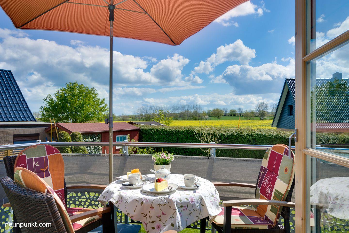 Ein sonniger Süd-Balkon mit Gartenmöbeln und Blick in die Ferne rundet den Wohnkomfort ab.