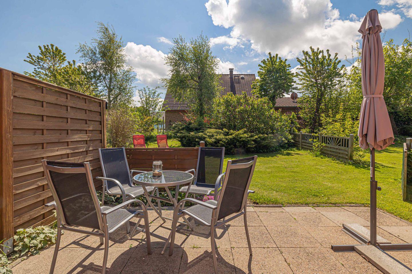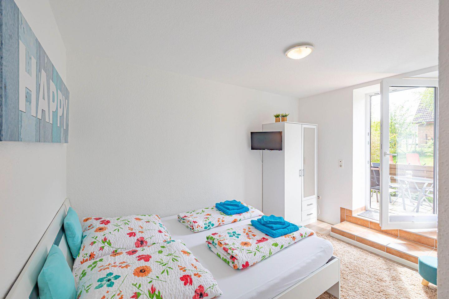 Über das Schlafzimmer, welches mit einem Bett der Maße 160x200 cm, einem Kleiderschrank und einen Fernseher ausgestattet ist, gelangen Sie zur möblierten Terrasse (Gartenmöbel, Sonnenschirm, Sonnenliegen und Holzkohlegrill) und dem eingezäunten Gartenbereich.
