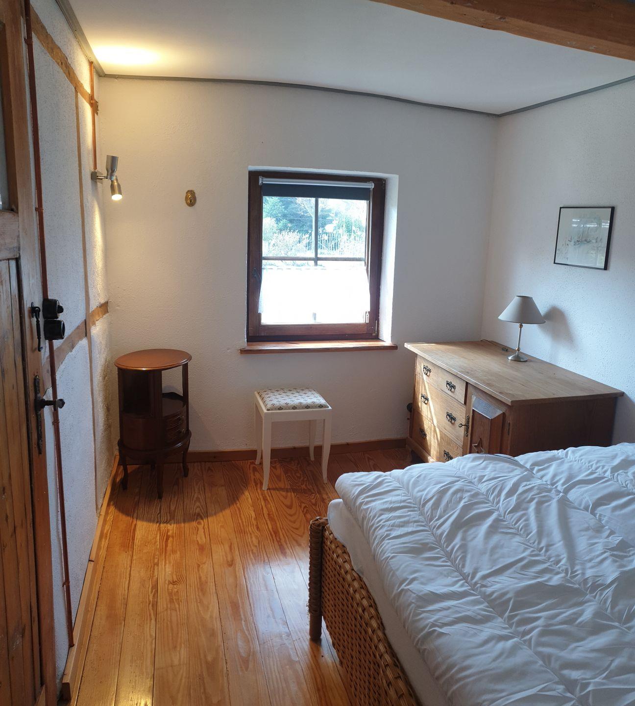 Die beiden Schlafzimmer sind liebevoll eingerichtet und bieten erholsame Nächte. Im ersten Schlafzimmer erwartet Sie ein kleines Doppelbett (140x200 cm) mit offener Fußende, einer Kommode und praktischen Kleiderhaken. Das zweite Schlafzimmer verfügt über zwei Einzelbetten (je 90x200 cm) sowie einen Kleiderschrank – beide Räume sind mit Verdunklungsmöglichkeiten ausgestattet.