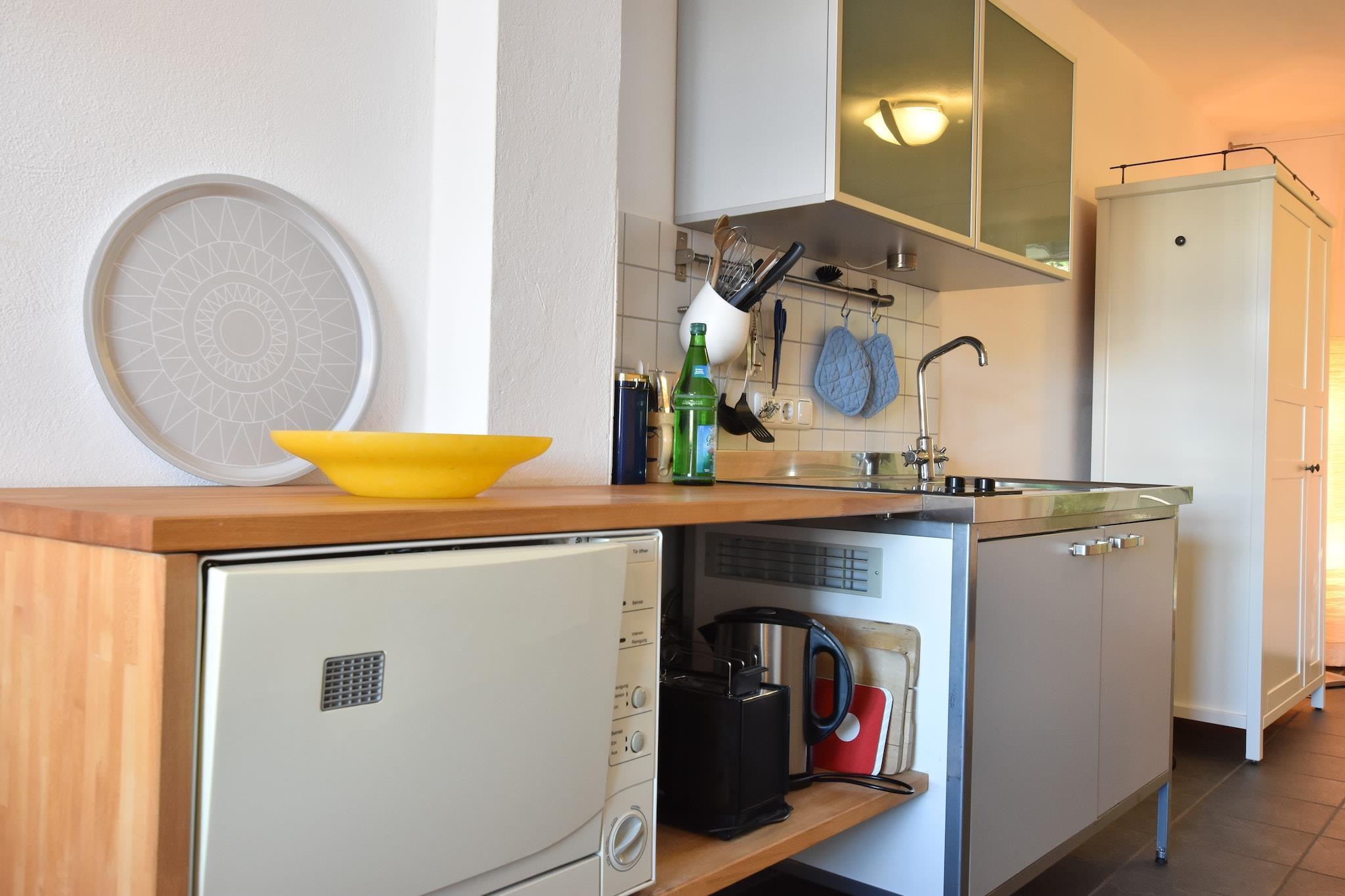 Parterre: (Kochnische(Esstisch(4 Personen), Wasserkocher, Toaster, Kochherd(2 Kochplatten), Spülmaschine, Kühlschrank(+ Gefrierfach)), Wohn-/Schlafzimmer(Doppelbett, Doppelschlafcouch, TV(Satellit)), Badezimmer(Dusche, Waschbecken, Toilette), Heizung) Terrasse, Garten, Gartenmöbel, Grill, Fahrräder verfügbar