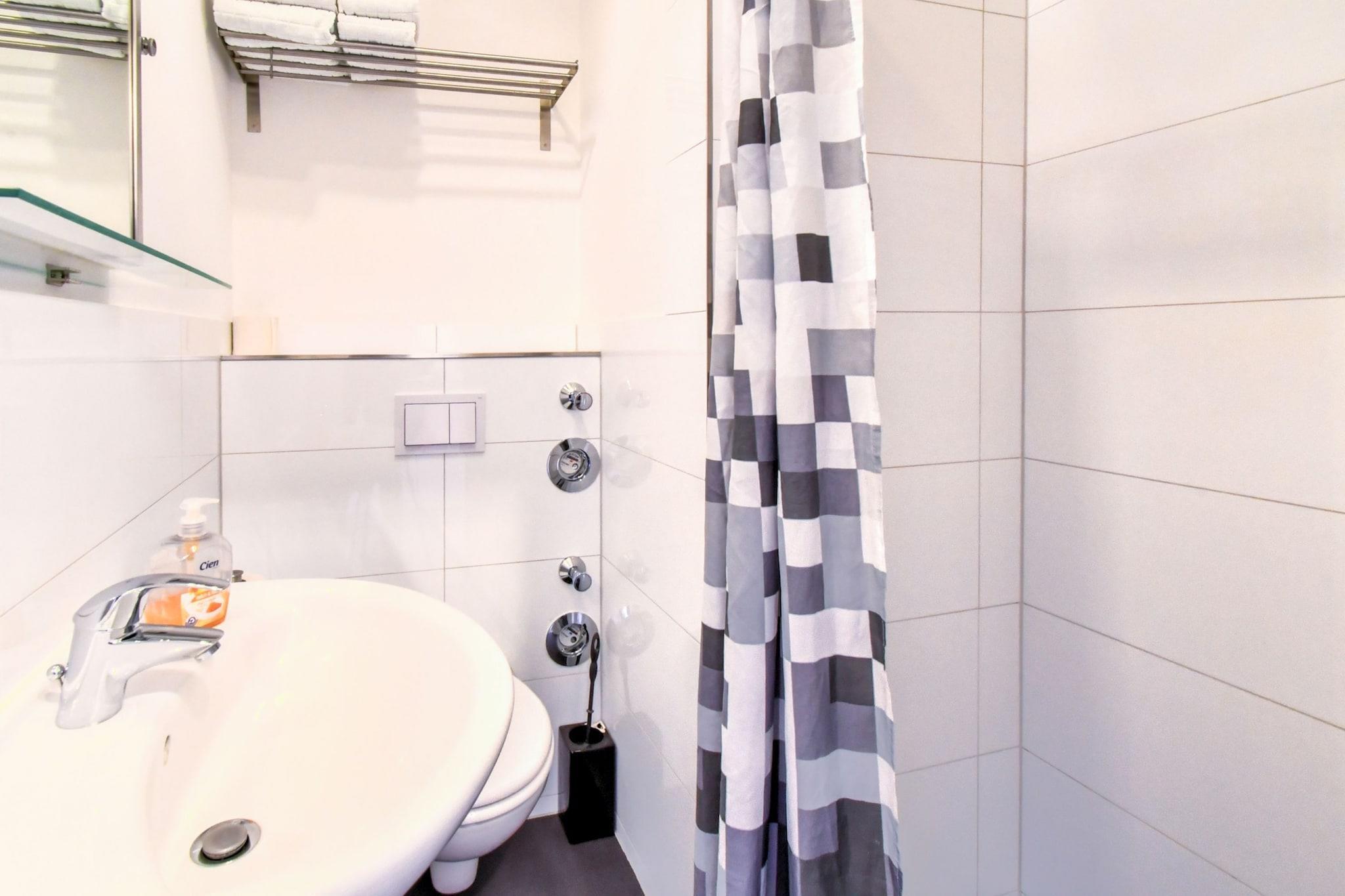Zwischengeschoss: (offene Küche(Wasserkocher, Kochherd(2 Kochplatten, Ceranfeld), Dunstabzugshaube, Kaffeemaschine, Backofen, Mikrowelle, Kühlschrank(+ Gefrierfach)), Wohn-/Schlafzimmer(Doppelschlafcouch, TV(Flatscreen), Sitzecke), Schlafzimmer(Doppelbett), Badezimmer(Dusche, Waschbecken, Toilette)) Trockner(gegen Gebühr), Waschmaschine(gegen Gebühr), Terrasse(alleinige Nutzung), Fahrradabstellraum, Gartenmöbel, Fahrräder verfügbar(gegen Gebühr)