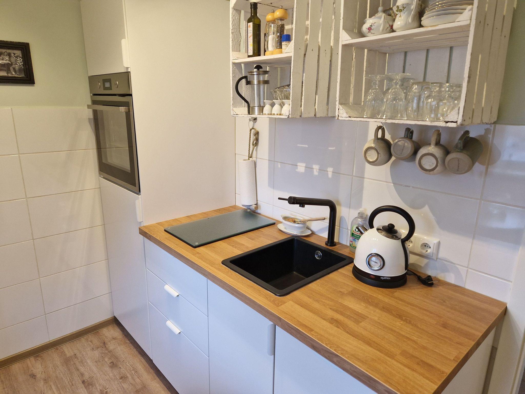 Küche vollausgestattet mit Küchenzeile und Essbereich für 2 Personen