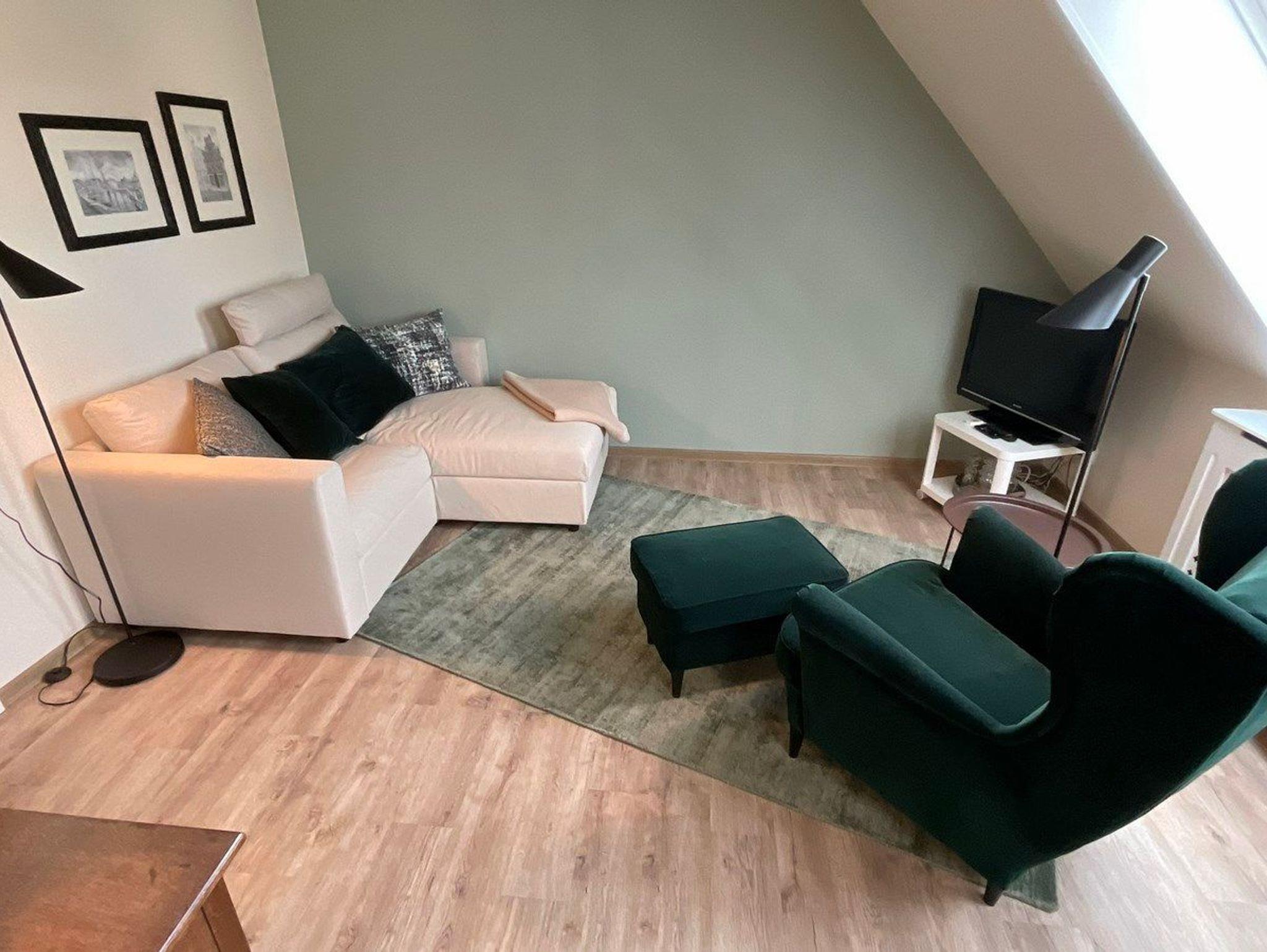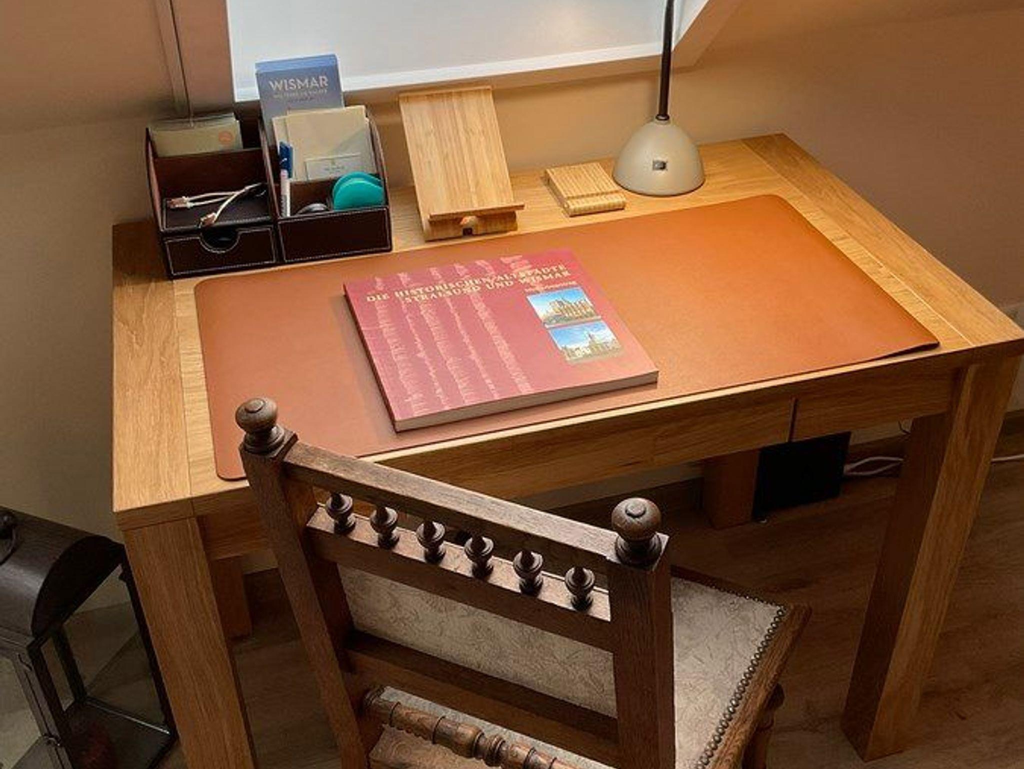 Mittelpunkt ist das große Dachzimmer, räumlich in Wohn- und Schlafraum unterteilt. Mit Blick in den Himmel und auf die Wismarer Hinterhöfe (mit Hühnern) können Sie hier auf der bequemen Coach entspannen, den Schreibtisch für Ihre Urlaubspost nutzen, lesen, ausschlafen, Ausflüge planen..