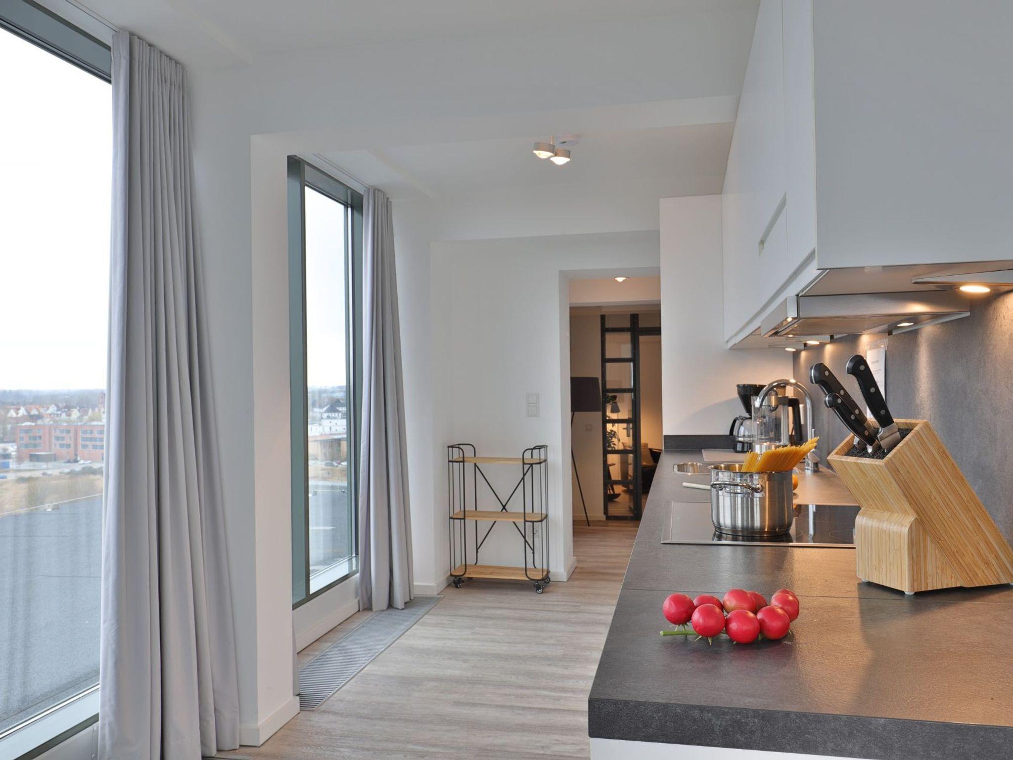 Appartementhaus mit 48 Appartements. Das exklusiv eingerichtete 3-Zimmer-Apppartement bietet 85m² Wohnfläche für 2 Personen. Hier residieren Sie in der 8.Etage. Sie ist durch den Lift problemlos zu erreichen. Der geschmackvoll eingerichtete Wohnbereich ist mit einem Sofa, einem TV- Gerät und einer Essecke ausgestattet. Von dort gelangen Sie zur Dachterrasse und genießen einen unbeschreiblich traumhaften Ausblick. Die geschickt integrierte Küche (Glaskeramik-Kochfeld, Backofen, Kühlschrank mit Gefrierteil, Geschirrspüler...) lässt keine Wünsche offen. Das moderne Schlafzimmer mit Doppelbett und einem weiteren TV-Gerät, hat einen großen begehbaren Kleiderschrank und einen direkten Zugang zum großzügigen Badezimmer. Gerne können Sie hier mit Ihrem Haustier Ihren unvergesslichen Urlaub verbringen. Bei Anreise sind die Betten bezogen und Handtücher liegen für Sie bereit. WLAN steht Ihnen kostenfrei zur Verfügung. In unmittelbarer Nähe sind öffentliche Parkplätze vorhanden