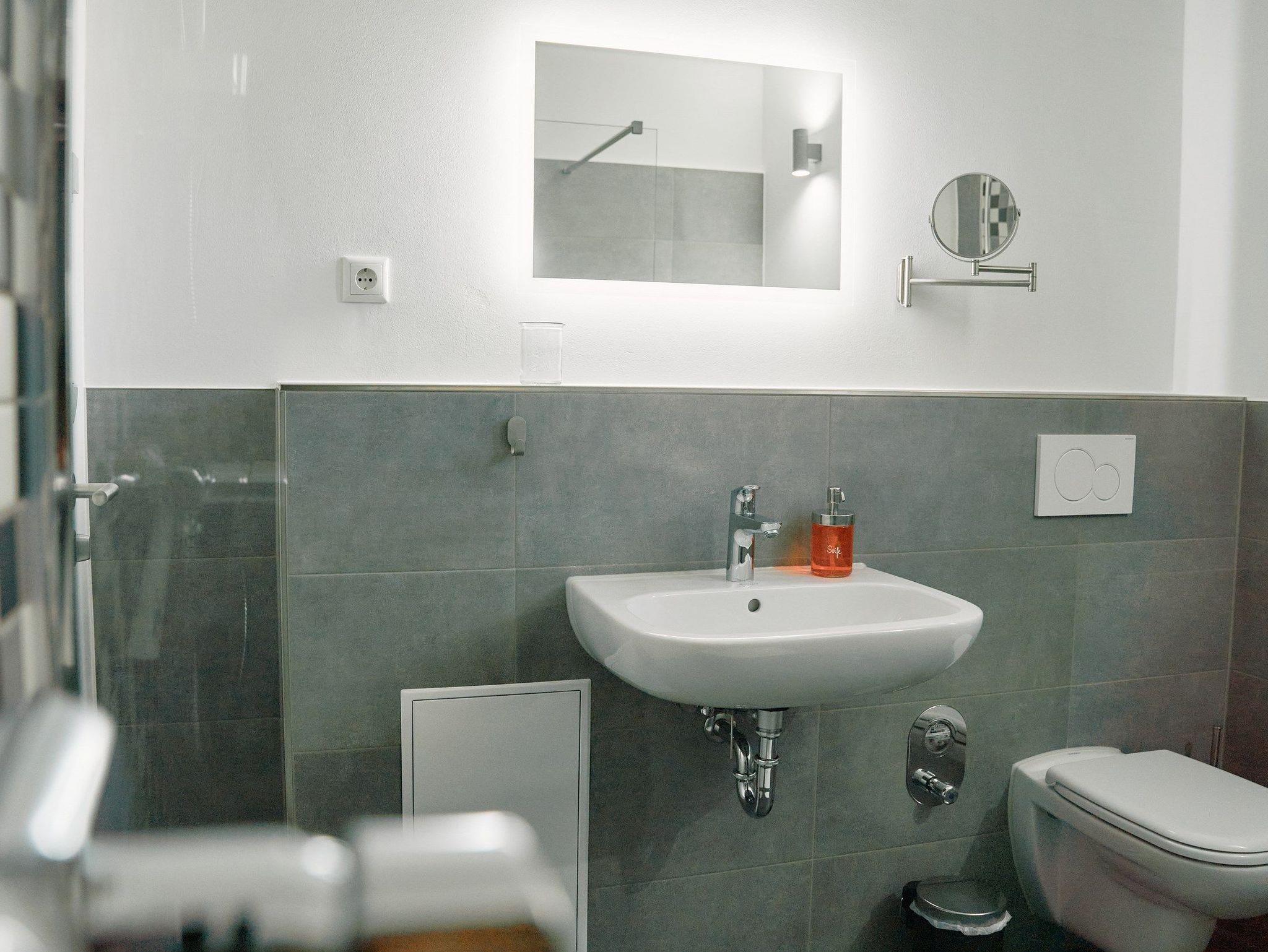 - bodenebene Dusche (90 x 1,20m), WC, Spiegel, Kosmetikspiegel und Ablage