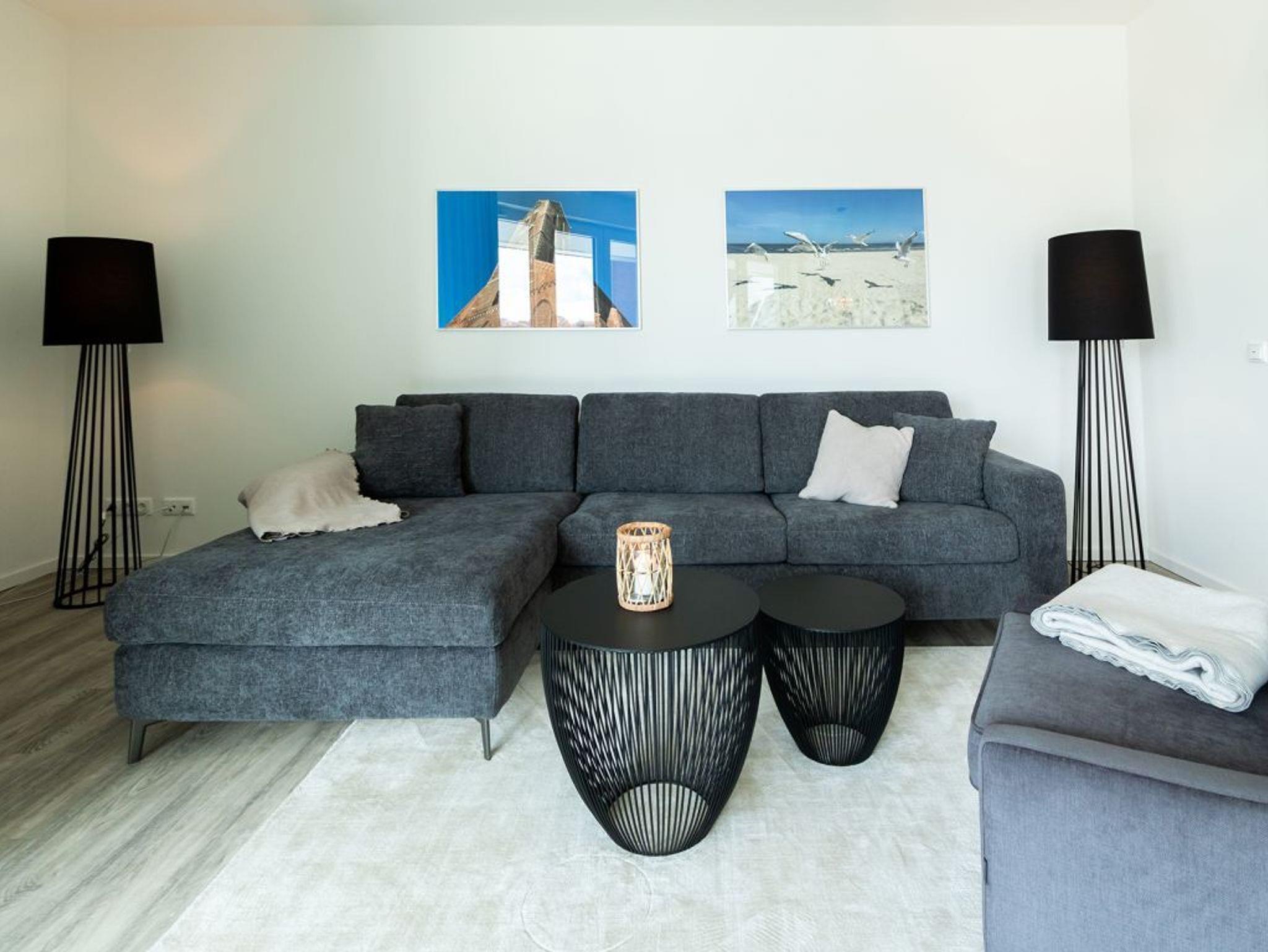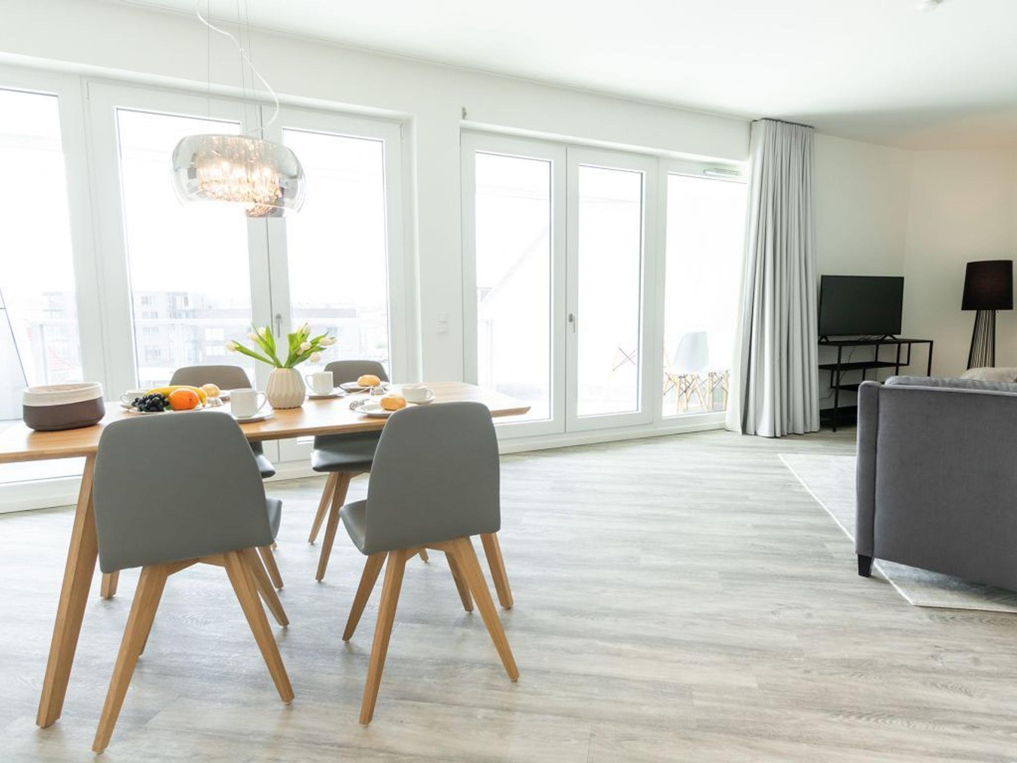 Hier empfängt die traumhaft schöne 2-Zimmer-Ferienwohnung in der Hafenspitze 38 den anspruchsvollen Gast. Es begrüßt Sie eine großzügige Wohneinheit mit einer Wohnfläche von 75qm sowie einer zugehörigen 20qm Loggia mit Hafenblick. Die im 3. Obergeschoss liegende Wohneinheit ist für eine Belegung mit maximal 4 Personen eingerichtet. Im attraktiv möblierten Wohn-Essbereich bietet ein ausklappbares Sofa zwei zusätzliche Schlafgelegenheiten.