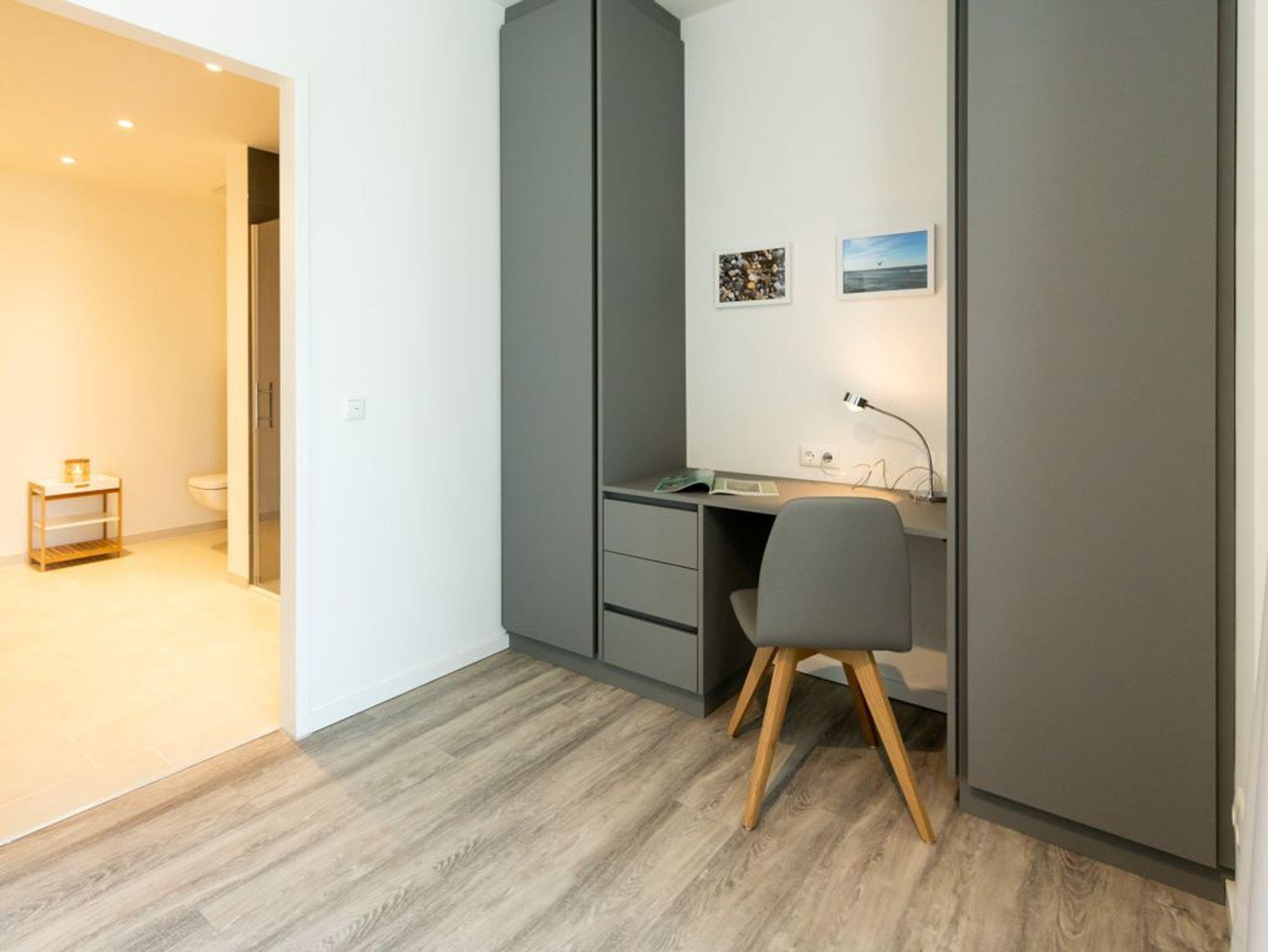 Angenehme Nächte verbringen Sie in dem separaten Schlafzimmer mit Doppelbett, Kleiderschrank sowie Zugang zu einem Badezimmer mit Dusche und WC. Das Ferienappartement besitzt zudem ein zweites, innenliegendes Gäste-WC. Die Wohnräume sind mit elektrisch bedienbaren Außenrollos ausgestattet und im gesamten Domizil sorgt eine Fußbodenheizung für ein angenehmes Raumklima.