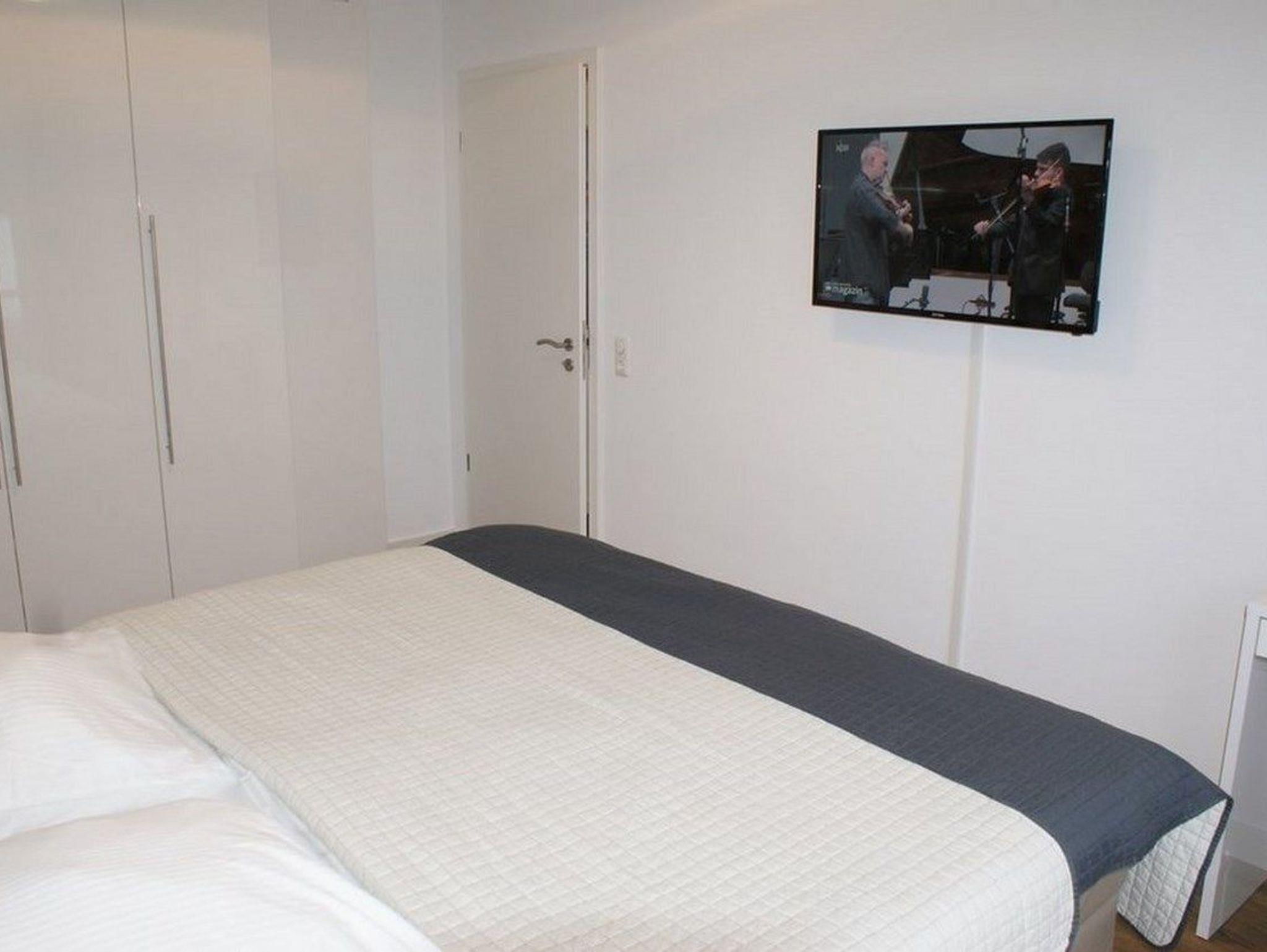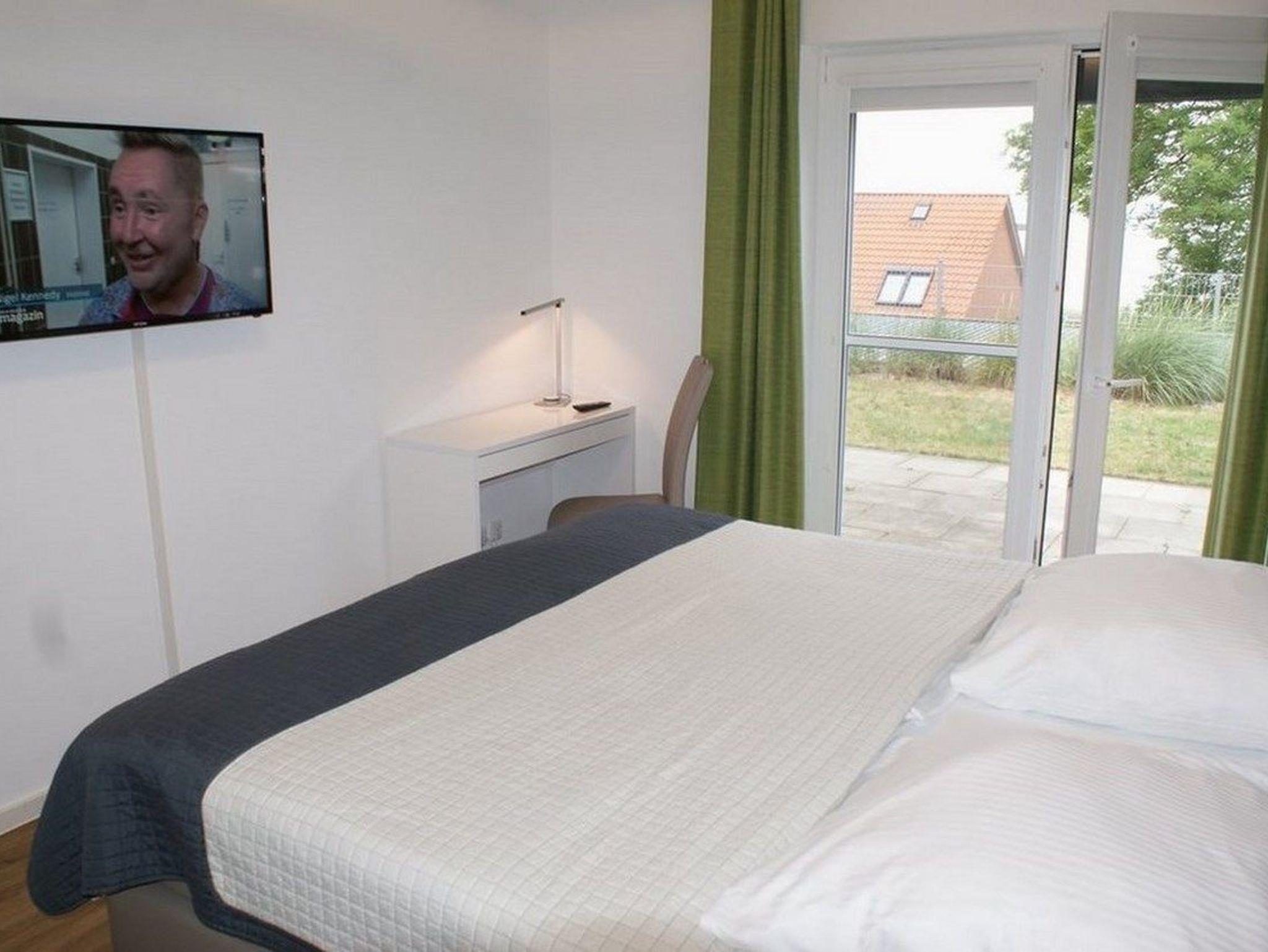 - getrenntes Schlafzimmer mit großem Doppelbett (Boxspringbett), Flat-TV, Kleiderschrank, Zugang zur Terrasse und Blick auf Wismarer Bucht