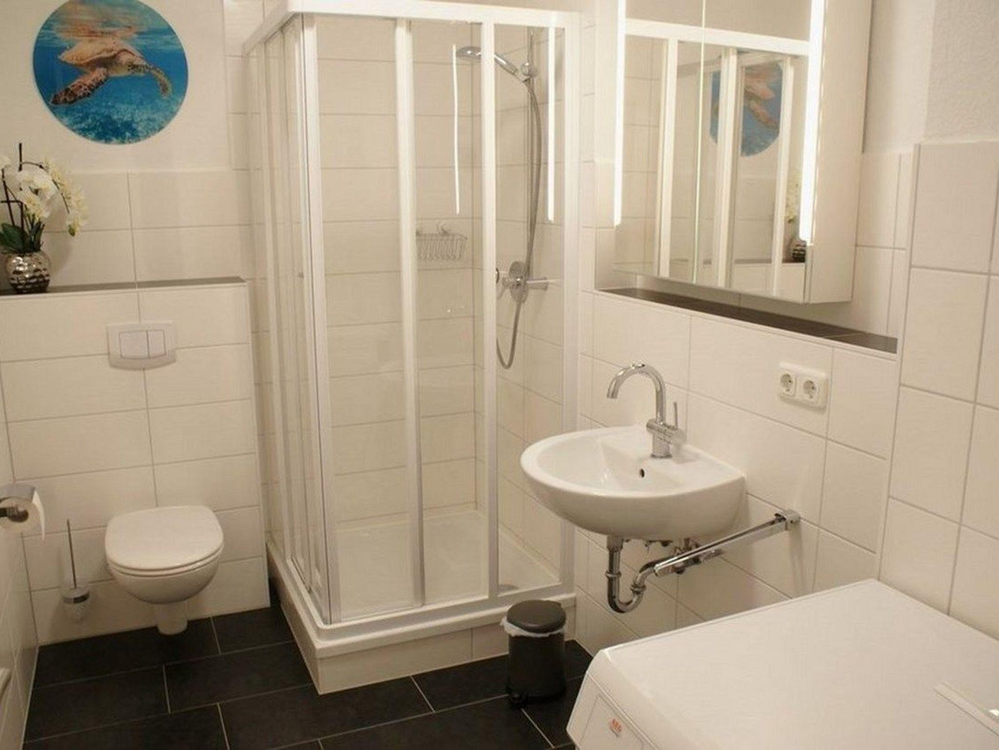 - Badezimmer mit Dusche, WC, Spiegel und Waschmaschine