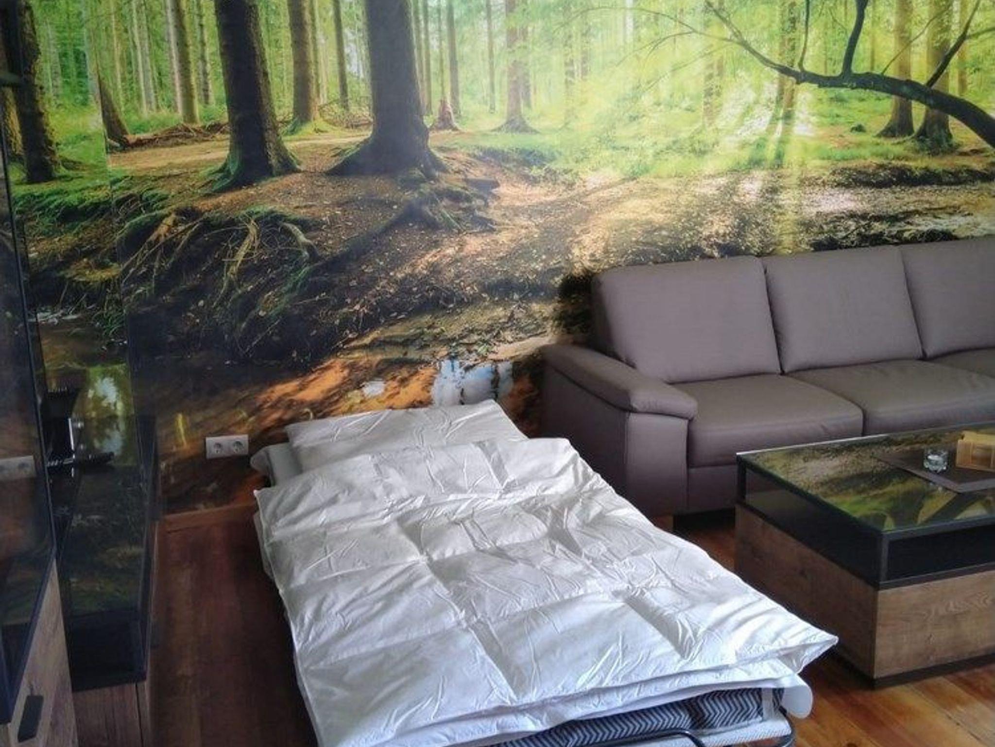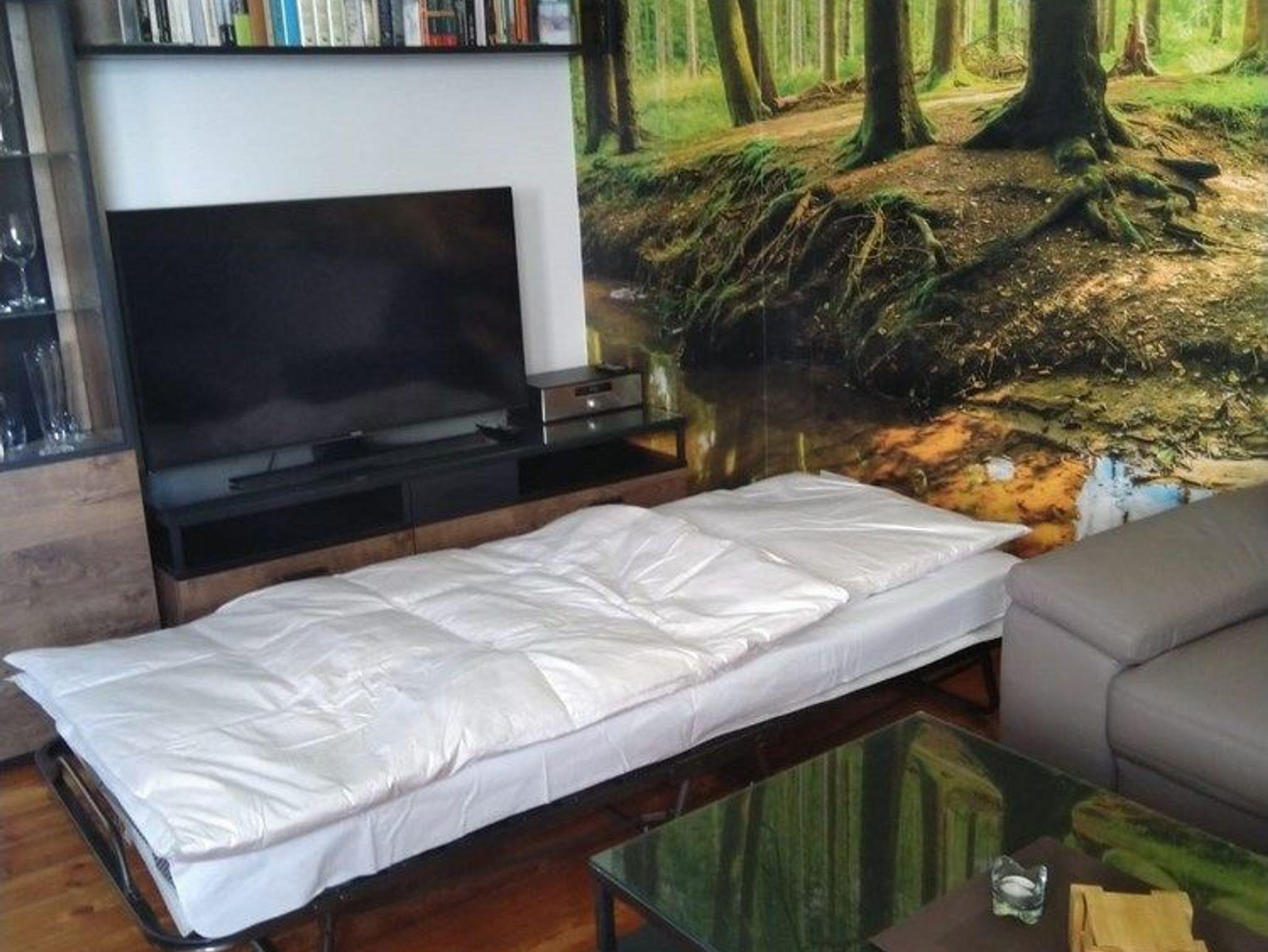 - Wohnzimmer mit großem Sofa, Flat-TV, Essbereich, beleuchtetes Board, zusätzliches Gästebett (ausklappbar)