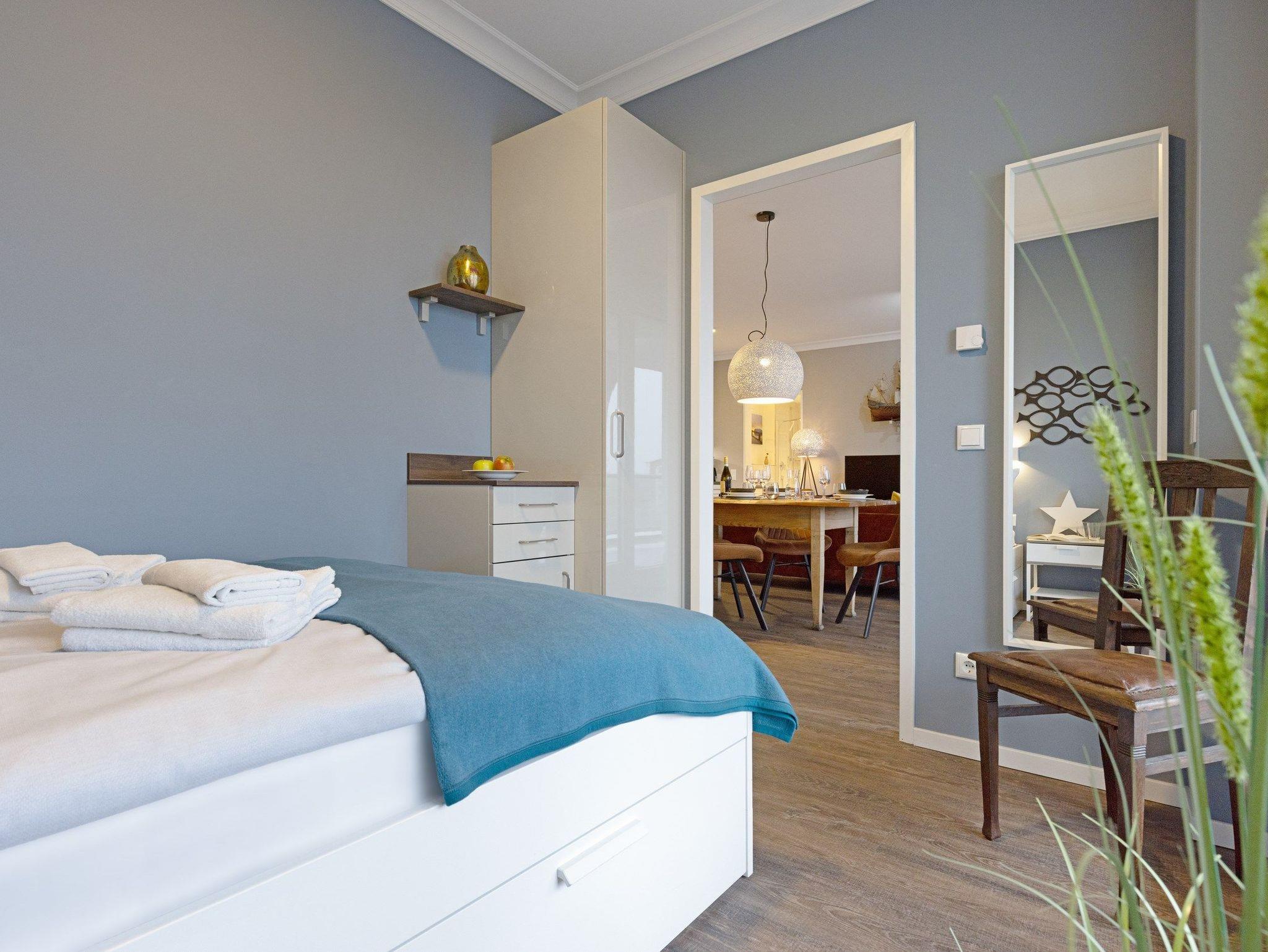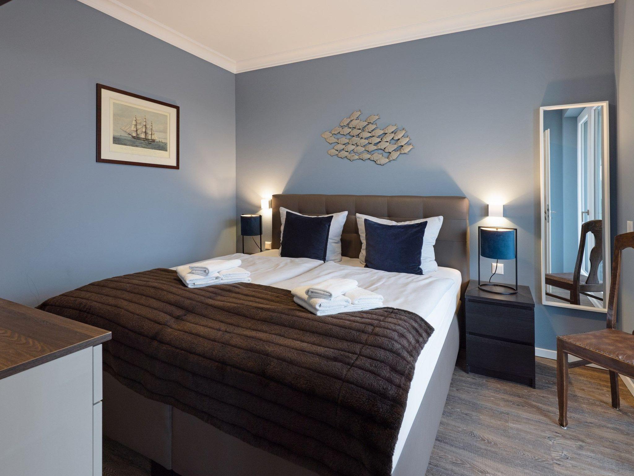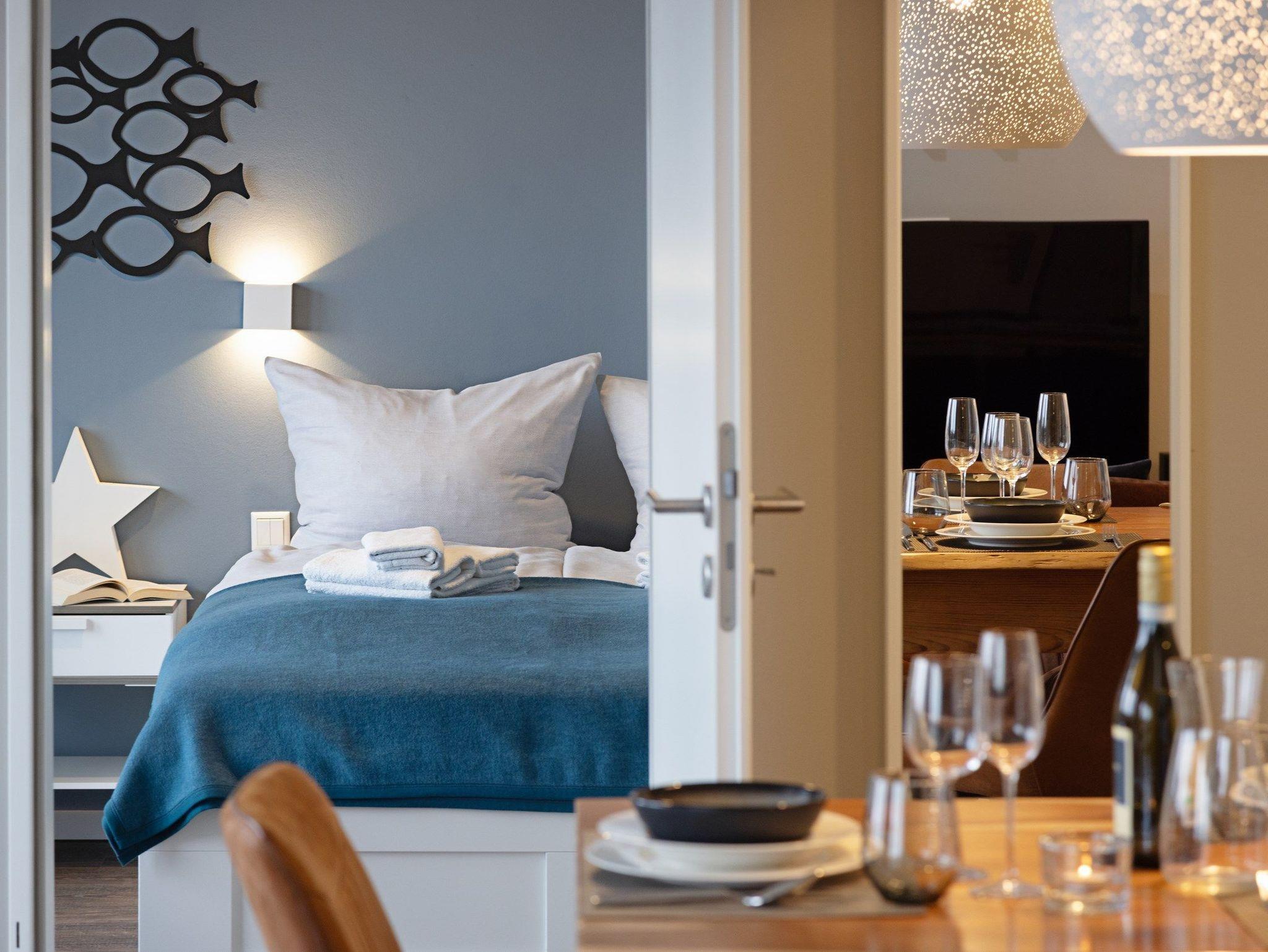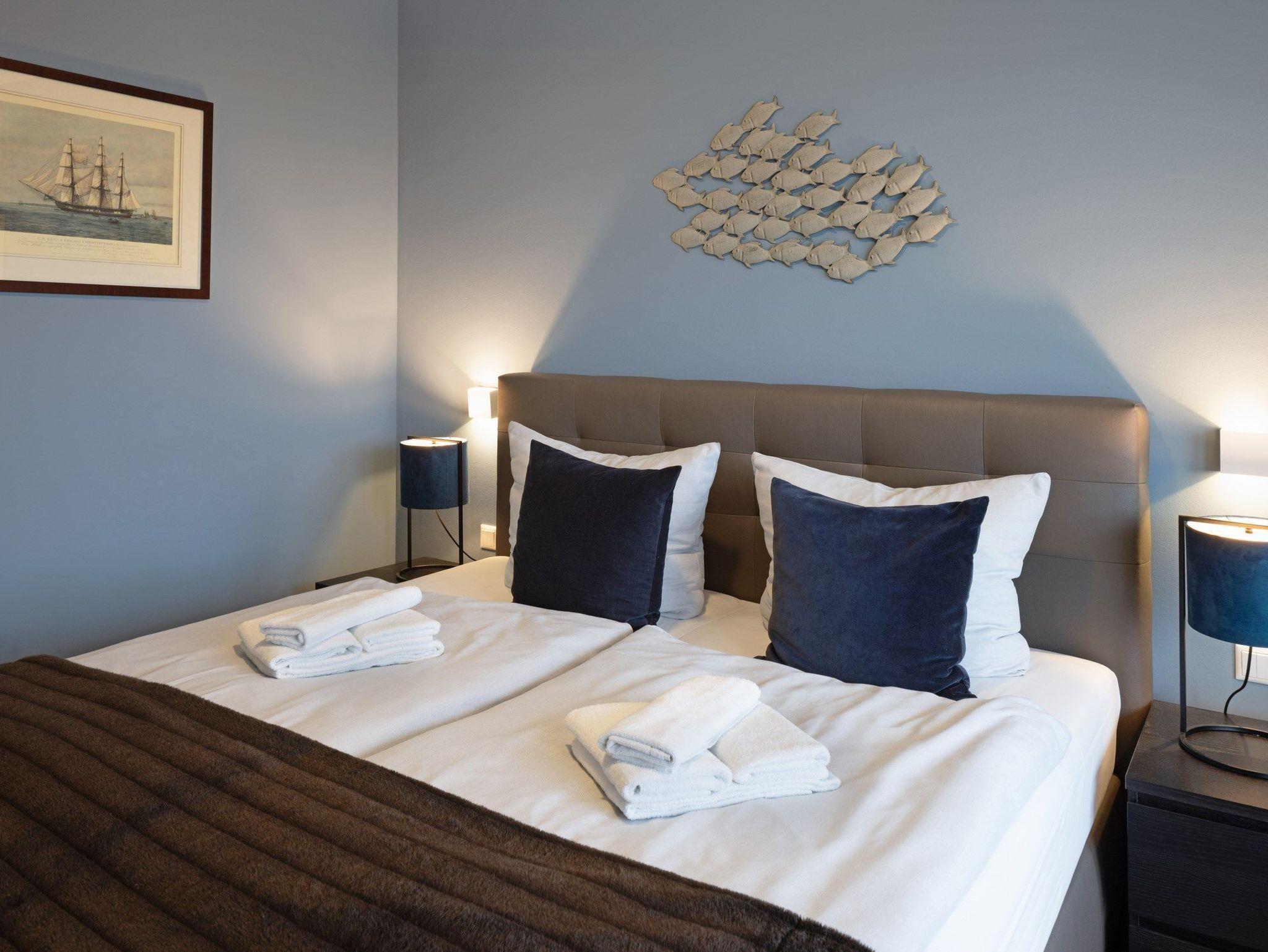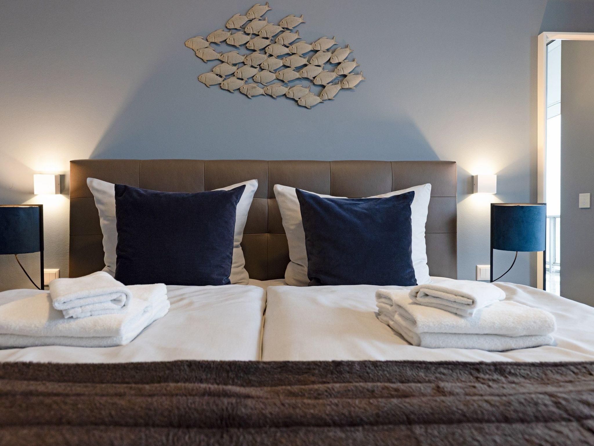 Die beiden separaten komfortablen Schlafra?ume sind mit hochwertigen bequemen Boxspring-Doppelbetten (1,80 m x 2,00 m sowie 1,40 m x 2,00 m) sowie maßgefertigten Kleiderschra?nken und großzu?gigen Ablagemo?glichkeiten ausgestattet. Fu?r Ihren ruhigen und ungesto?rten Schlaf sind alle Wohn- und Schlafra?ume mit komplett verdunkelnden elektrisch gefu?hrten Aluminiumrollla?den ausgestattet. Wir wu?nschen Ihnen erholsame Tra?ume an diesem idealem Ru?ckzugsort. Zum unkomplizierten und zentralen Laden Ihrer Mobilgera?te sind dort zusa?tzliche Multimedia-Steckdosen mit jeweils drei USB-Ports sowie einem Typ-C Port mit Kindersicherung vorhanden. Die Betten haben wir fu?r Sie bereits bezogen und Handtu?cher liegen schon bereit.