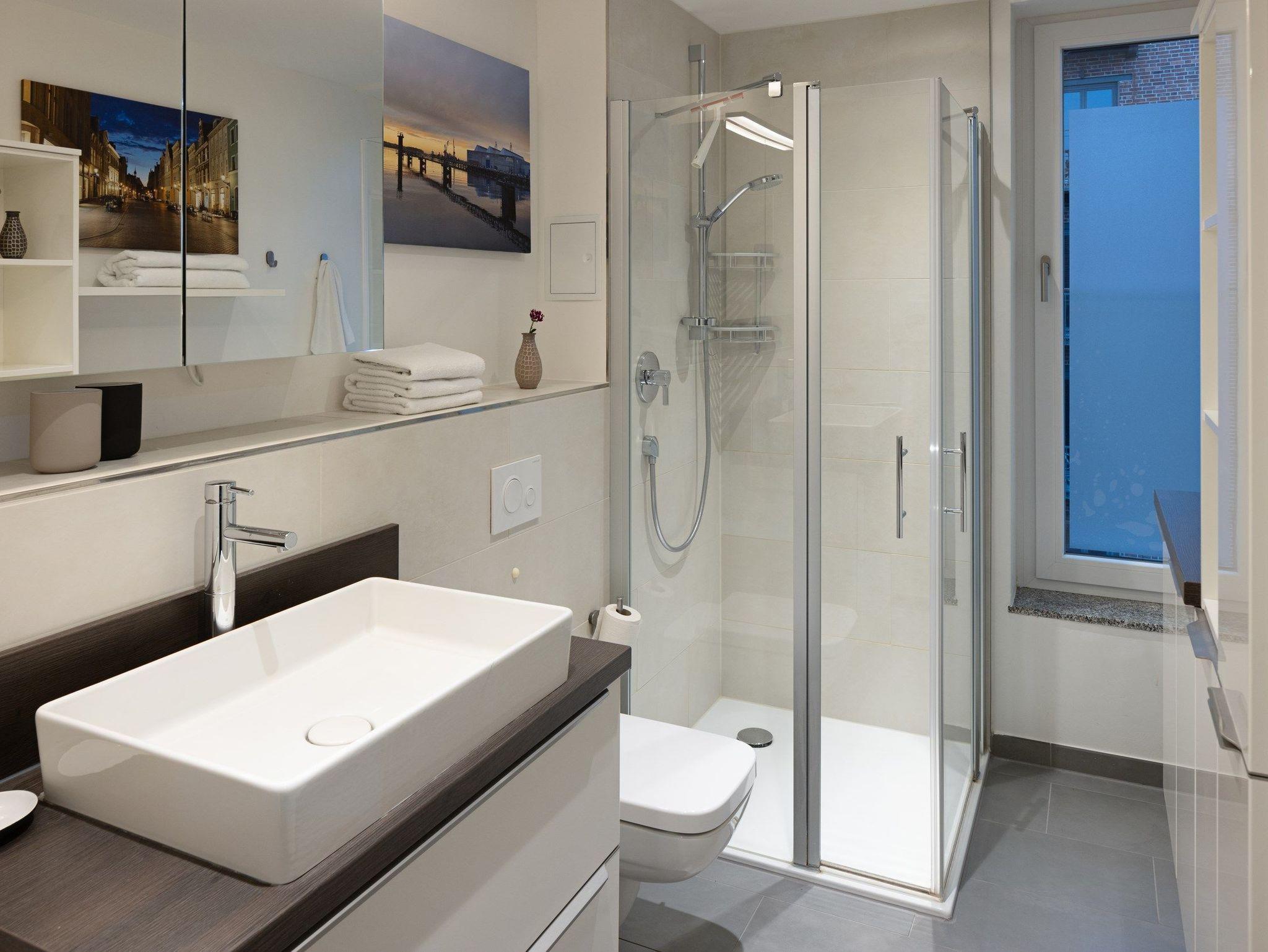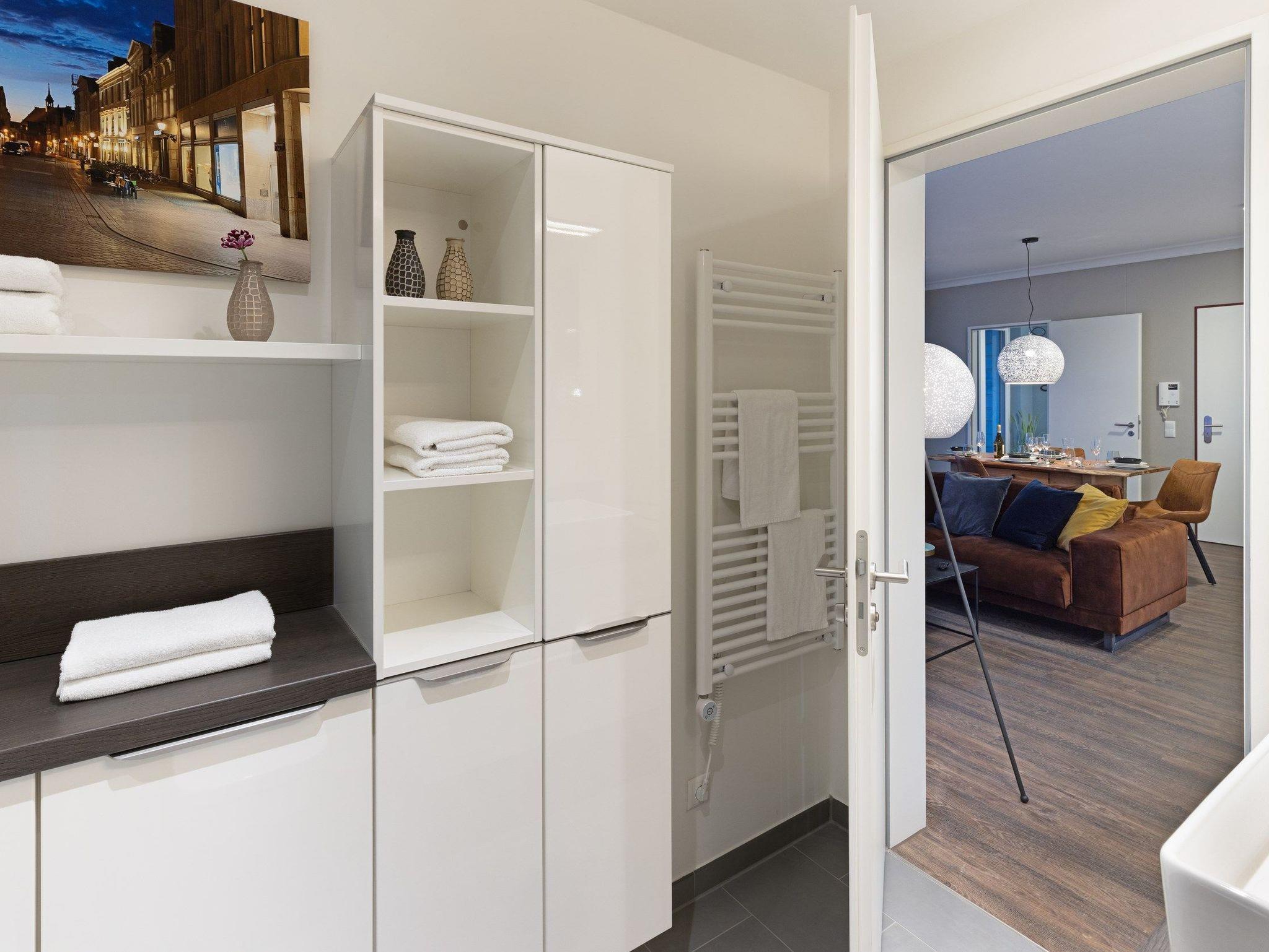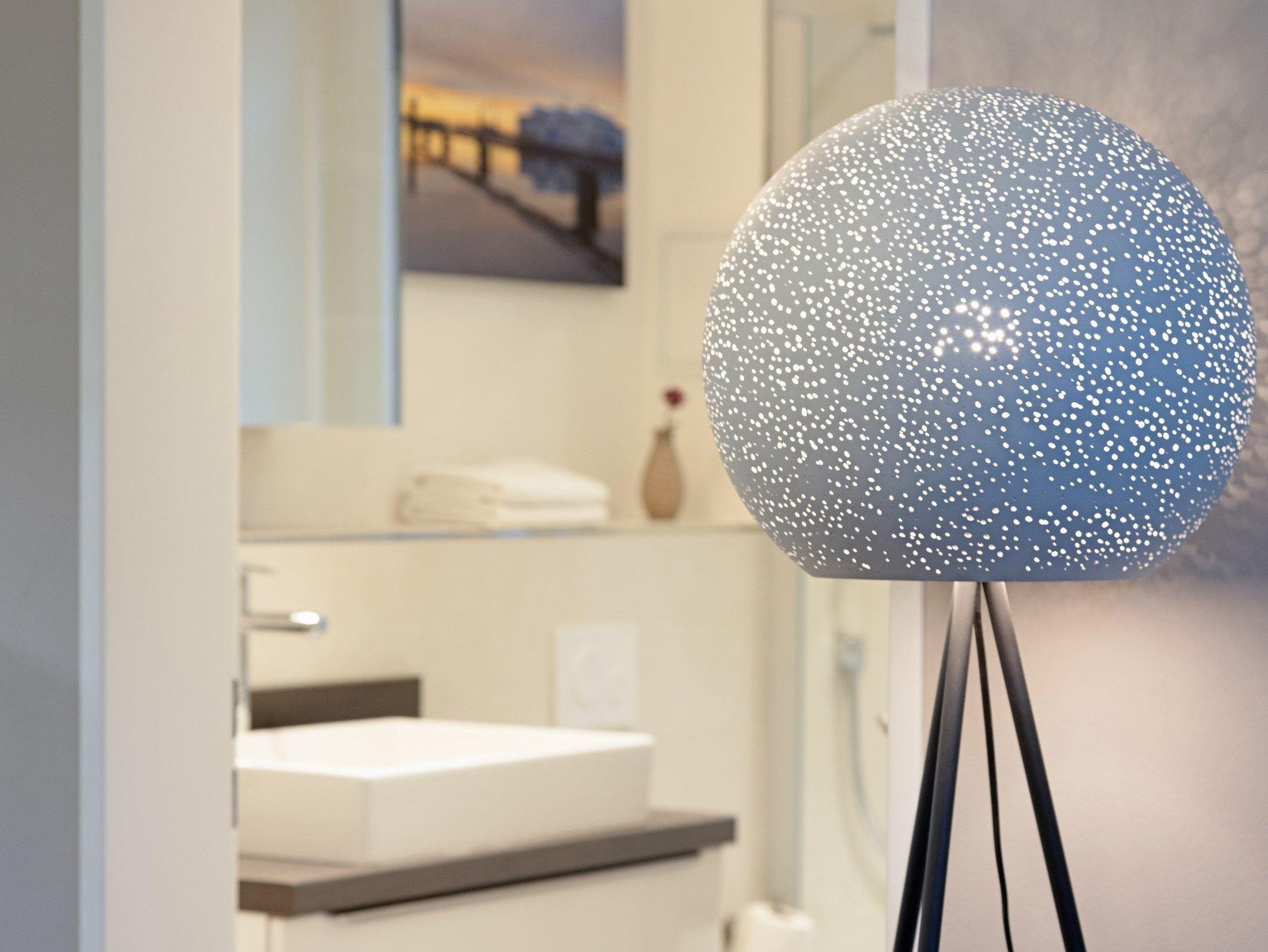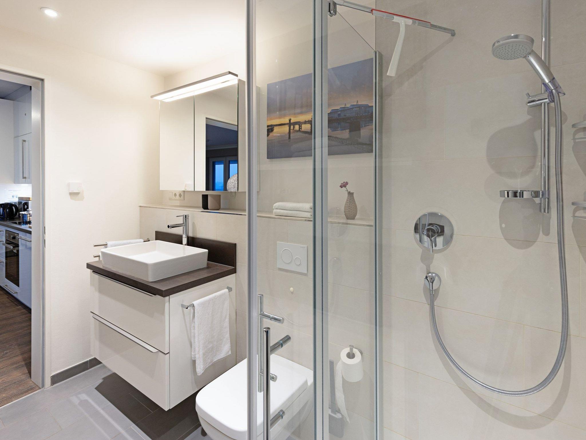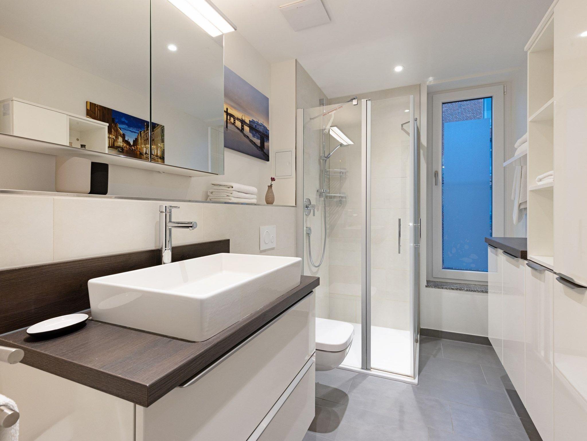 Beginnen Sie Ihren Urlaubstag aktiv im stilvollen Tageslichtbad. Dieses verfu?gt u?ber ein WC, eine stylische ebenerdige Dusche mit Seifen- und Shampoo-Ablagefla?chen, einen Marken-Waschtisch mit Schubladen-Unterschrank, einen gera?umigen Spiegelschrank mit Zahnputzbechern, Seifenspender, Fo?hn u. v. m. sowie einen elektrisch beheizten Design-Handtuchwa?rmeko?rper. Fu?r Kulturbeutel, Kleidung und Handtu?cher sind maßgefertigte Schra?nke sowie reichlich Ablage- und Aufha?ngemo?glichkeiten vorgesehen.