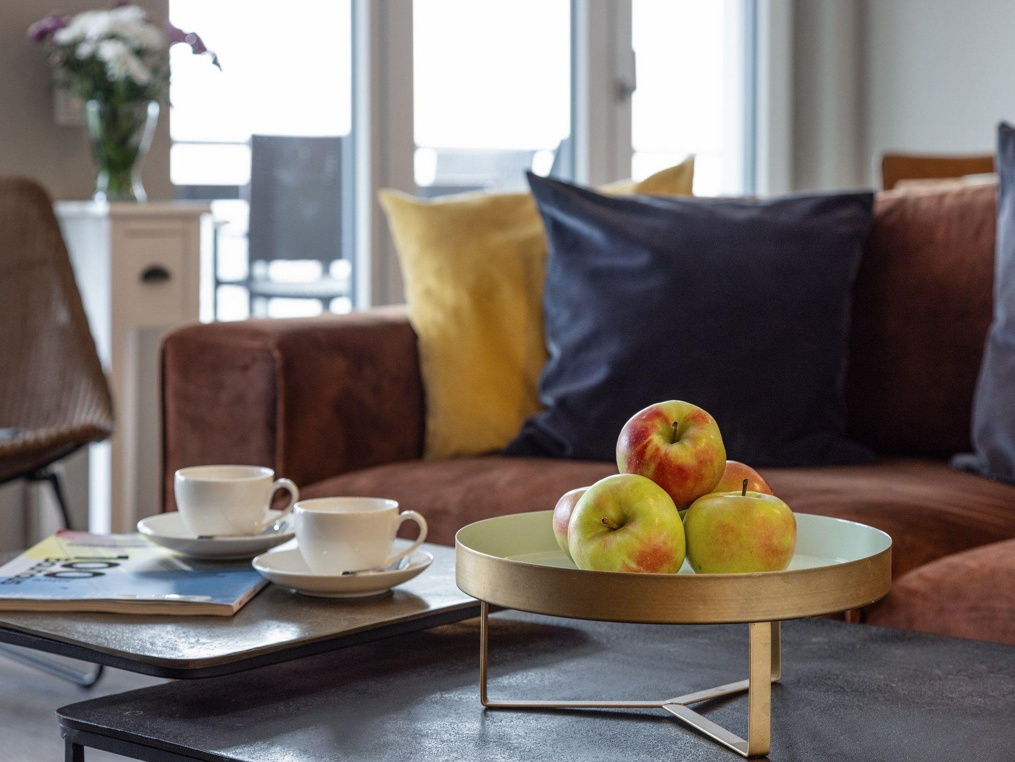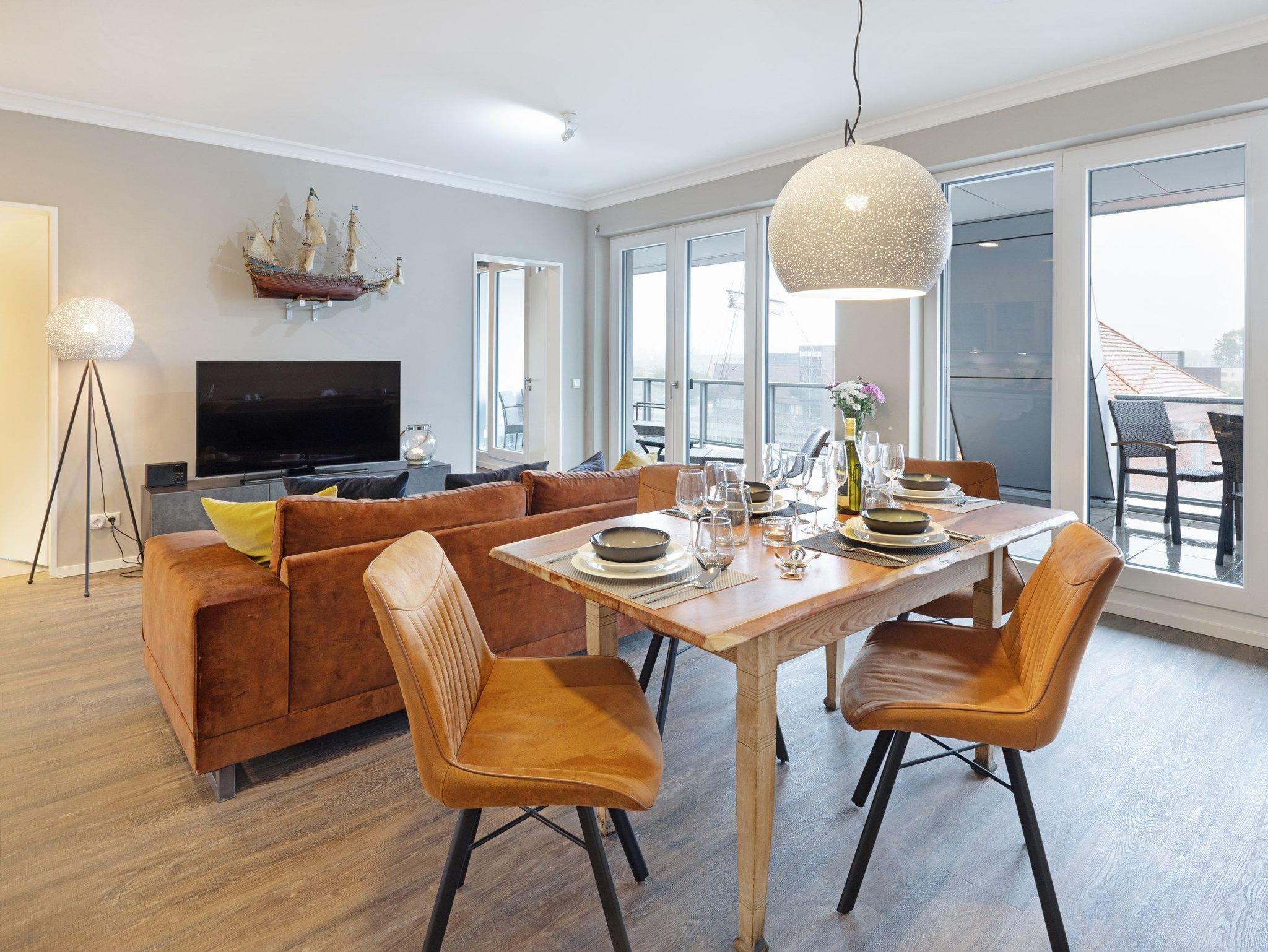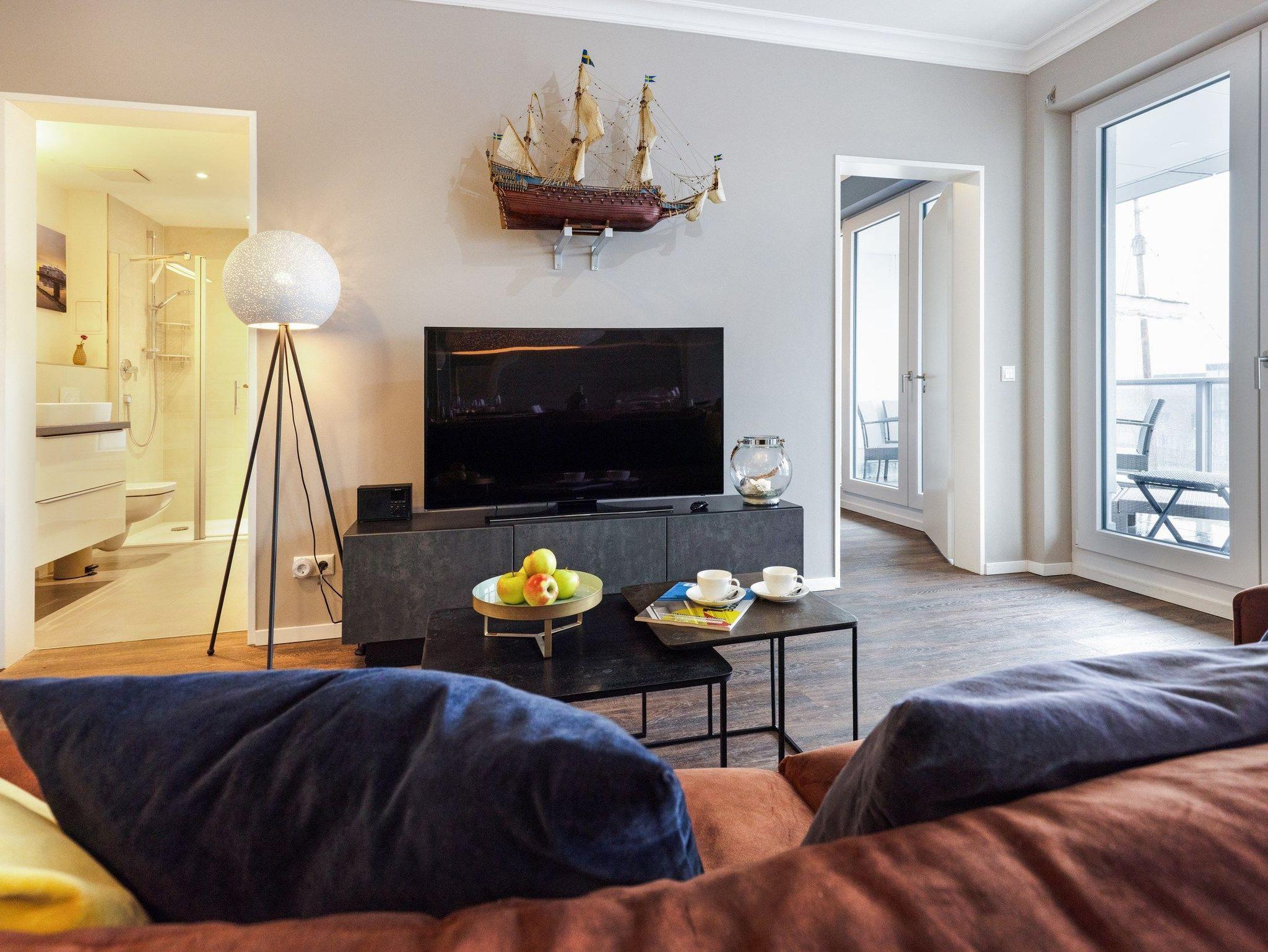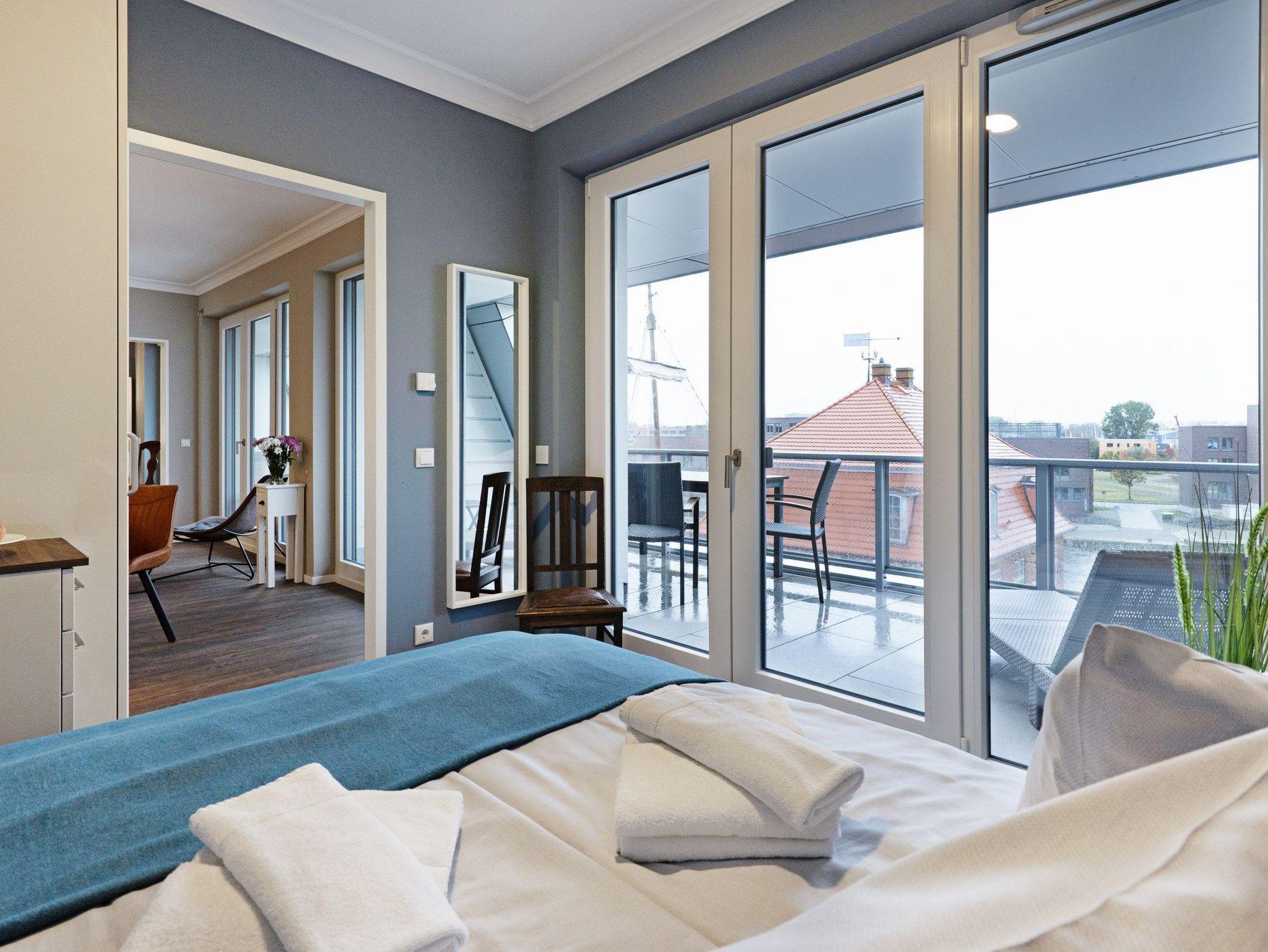 Es empfa?ngt Sie der mit viel Liebe zum Detail ausgestattete lichtdurchflutete und luftige Wohnbereich mit zwei bodentiefen Doppelflu?gel- Fenstertu?ren zur Dachterrasse (Ausfu?hrung „Stulp“, d. h. vollfla?chig zu o?ffnen ohne Mittelpfosten). Auch aus den Schlafzimmern gelangen Sie u?ber die Doppelflu?geltu?ren direkt auf Ihre sichtgeschu?tzte Sonnenterrasse in Su?d-West-Lage. Die saisonal mit Lounge-Mo?beln, bequemen Liegen und einem Esstisch mit vier Stu?hlen mo?blierte Loggia la?dt Sie zum chilligen Ausspannen ein. Freuen Sie sich auf kulinarische Genu?sse unter freiem Himmel, genießen Sie den lauen Sommerabend mit spektakula?rer Aussicht bei einer sanften Brise und einem ku?hlen Getra?nk. Da Sie direkt im Alten Hafen logieren, ko?nnen Sie auf der Terrasse je nach Windrichtung dem Rauschen des Meeres lauschen. Riechen und schmecken Sie unsere wohltuende Meeresbrise. Das Terrassenmobiliar inklusive passender Auflagen steht Ihnen ganzja?hrig zur Verfu?gung.