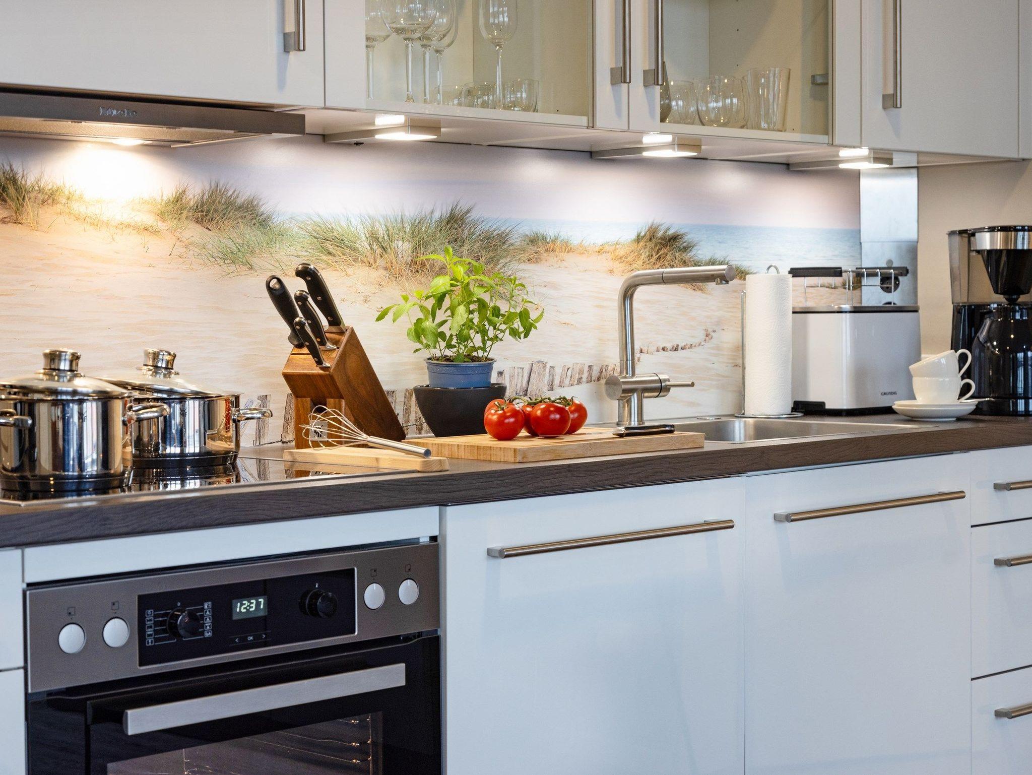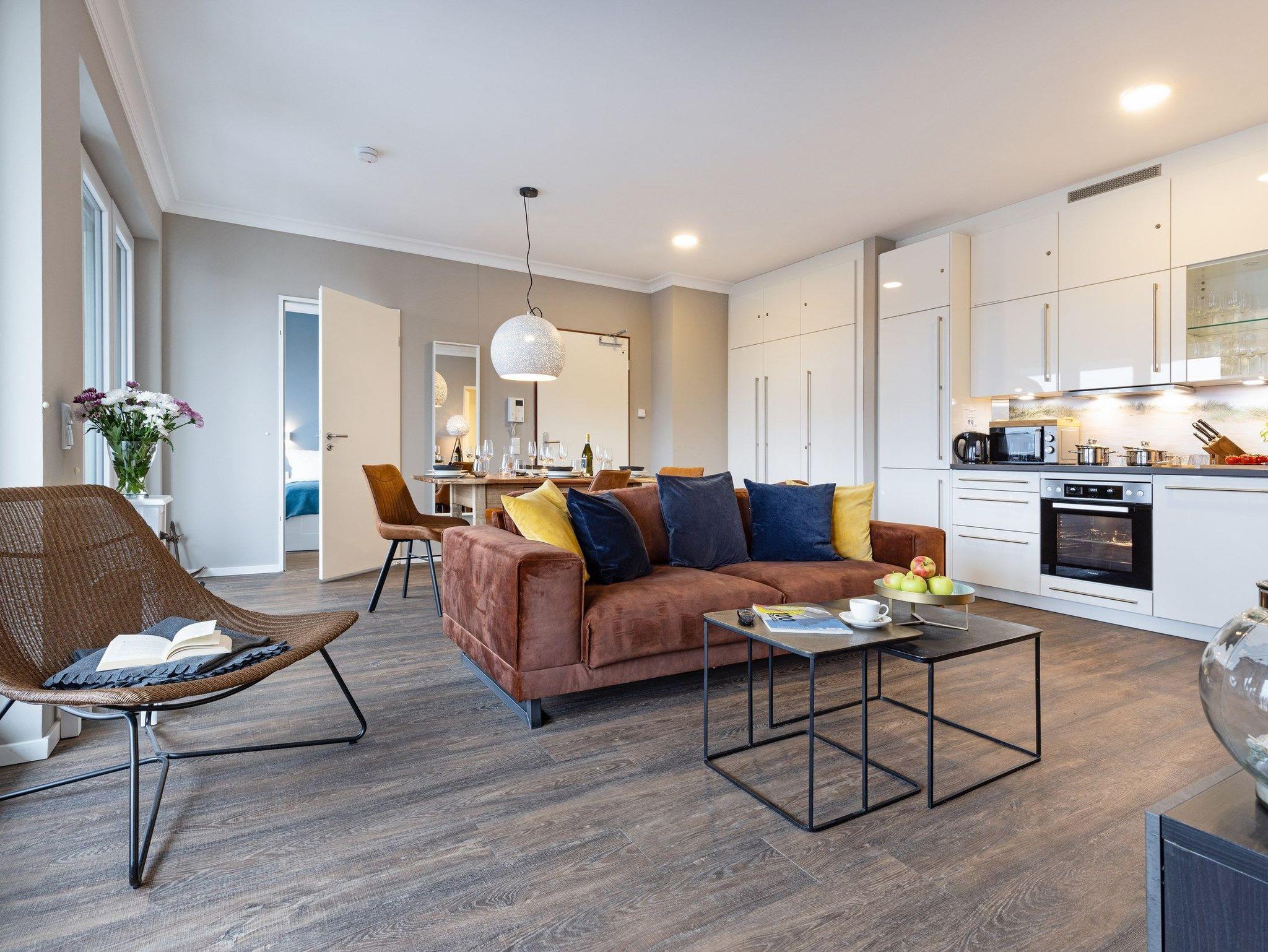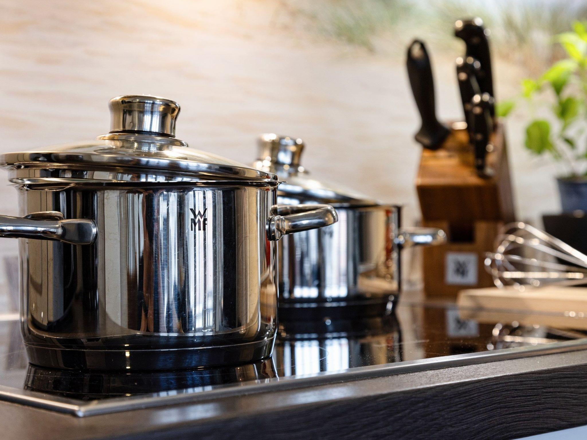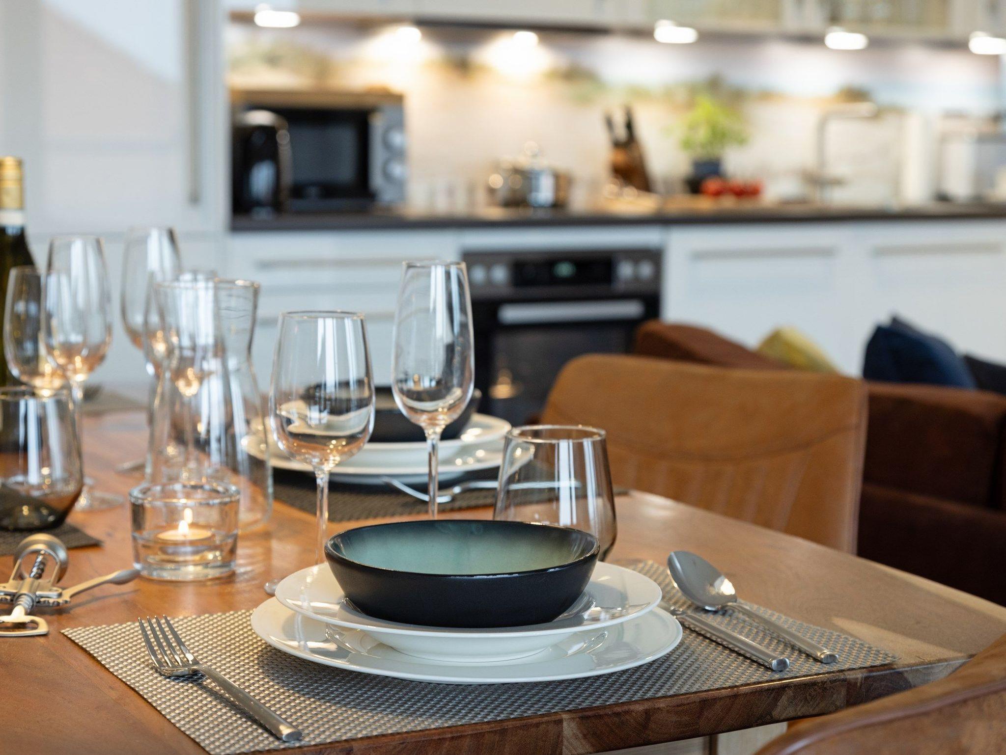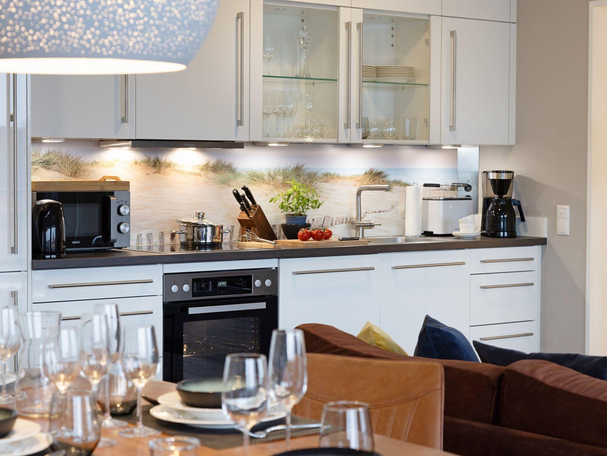 Ein weiteres Highlight der Wohnung ist der mit einer hochwertigen Marken-Komfortku?che ausgestattete offene Wohn-/Essbereich. Hier ko?nnen Sie jederzeit gemeinsam etwas Feines zubereiten. Die hochwertige hochgla?nzende Weißlack-Ku?che verfu?gt u?ber einen programmierbaren Backofen, eine Mikrowelle, einen Herd mit vier Ceran-Kochfeldern, großvolumige Mu?lltrennungs-Schubfa?cher unter der Design-Spu?le, eine Spu?lmaschine mit Timerfunktion, einen gera?umigen Ku?hlschrank sowie einen separaten 68l Gefrierschrank fu?r Ihre Tiefku?hlvorra?te (Markengera?te). Kaffeetrinker ko?nnen zwischen einer TASSIMO-Kapselmaschine, einer Filterkaffeemaschine oder einer Handkaffeemaschine (French Press) wa?hlen. Zur Vollausstattung geho?ren zudem folgende Gera?te: Milchaufscha?umer, Handru?hrgera?t, Stabmixer, WMF-Messerblock, Wasserkocher, WMF-Toaster, Eierkocher, RO?SLE-Salatschleuder, Design-Nussknacker, Knoblauchpresse, Kartoffelpresse, WMF-Korkenzieher und vieles mehr. Fu?r Ihren leckeren selbst gebackenen Kuchen stehen Ihnen Backformen, Kuchengeschirr mit passendem Besteck sowie Schaber, Mixer und weitere Utensilien zur Verfu?gung. Hochwertige Gla?ser, edles Geschirr von Villeroy [&] Boch, WMF-Kochmesser und WMF-Besteck, alles ausreichend bemessen fu?r einen gleichzeitigen Spu?lmaschinenbetrieb, runden das exkusive Angebot ab.