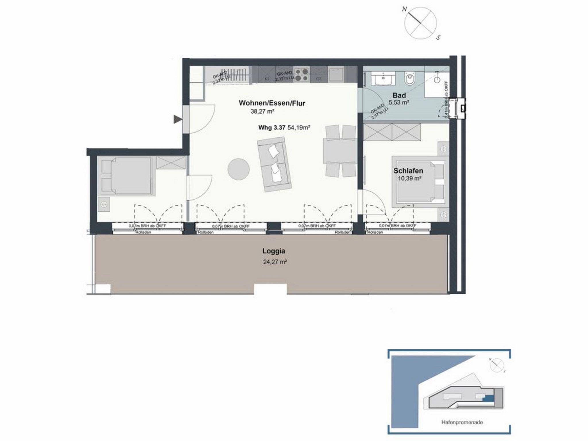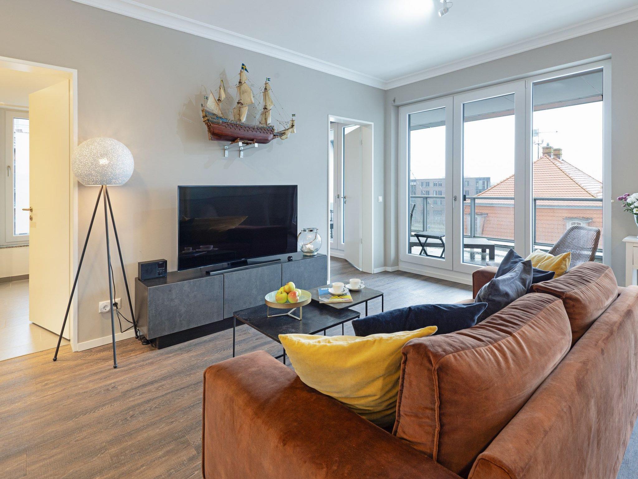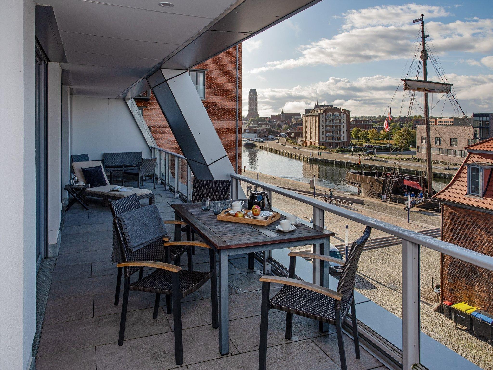Es empfa?ngt Sie der mit viel Liebe zum Detail ausgestattete lichtdurchflutete und luftige Wohnbereich mit zwei bodentiefen Doppelflu?gel- Fenstertu?ren zur Dachterrasse (Ausfu?hrung Stulp, d. h. vollfla?chig zu o?ffnen ohne Mittelpfosten). Auch aus den Schlafzimmern gelangen Sie u?ber die Doppelflu?geltu?ren direkt auf Ihre sichtgeschu?tzte Sonnenterrasse in Su?d-West-Lage. Die saisonal mit Lounge-Mo?beln, bequemen Liegen und einem Esstisch mit vier Stu?hlen mo?blierte Loggia la?dt Sie zum chilligen Ausspannen ein. Freuen Sie sich auf kulinarische Genu?sse unter freiem Himmel, genießen Sie den lauen Sommerabend mit spektakula?rer Aussicht bei einer sanften Brise und einem ku?hlen Getra?nk. Da Sie direkt im Alten Hafen logieren, ko?nnen Sie auf der Terrasse je nach Windrichtung dem Rauschen des Meeres lauschen. Riechen und schmecken Sie unsere wohltuende Meeresbrise. Das Terrassenmobiliar inklusive passender Auflagen steht Ihnen ganzja?hrig zur Verfu?gung.