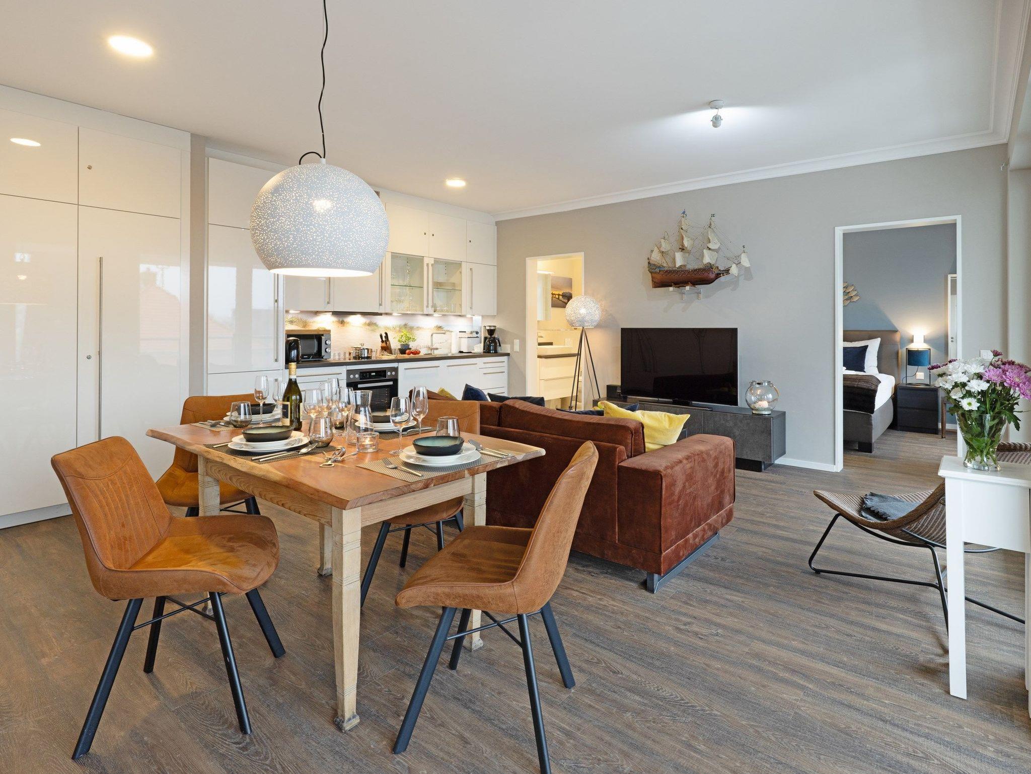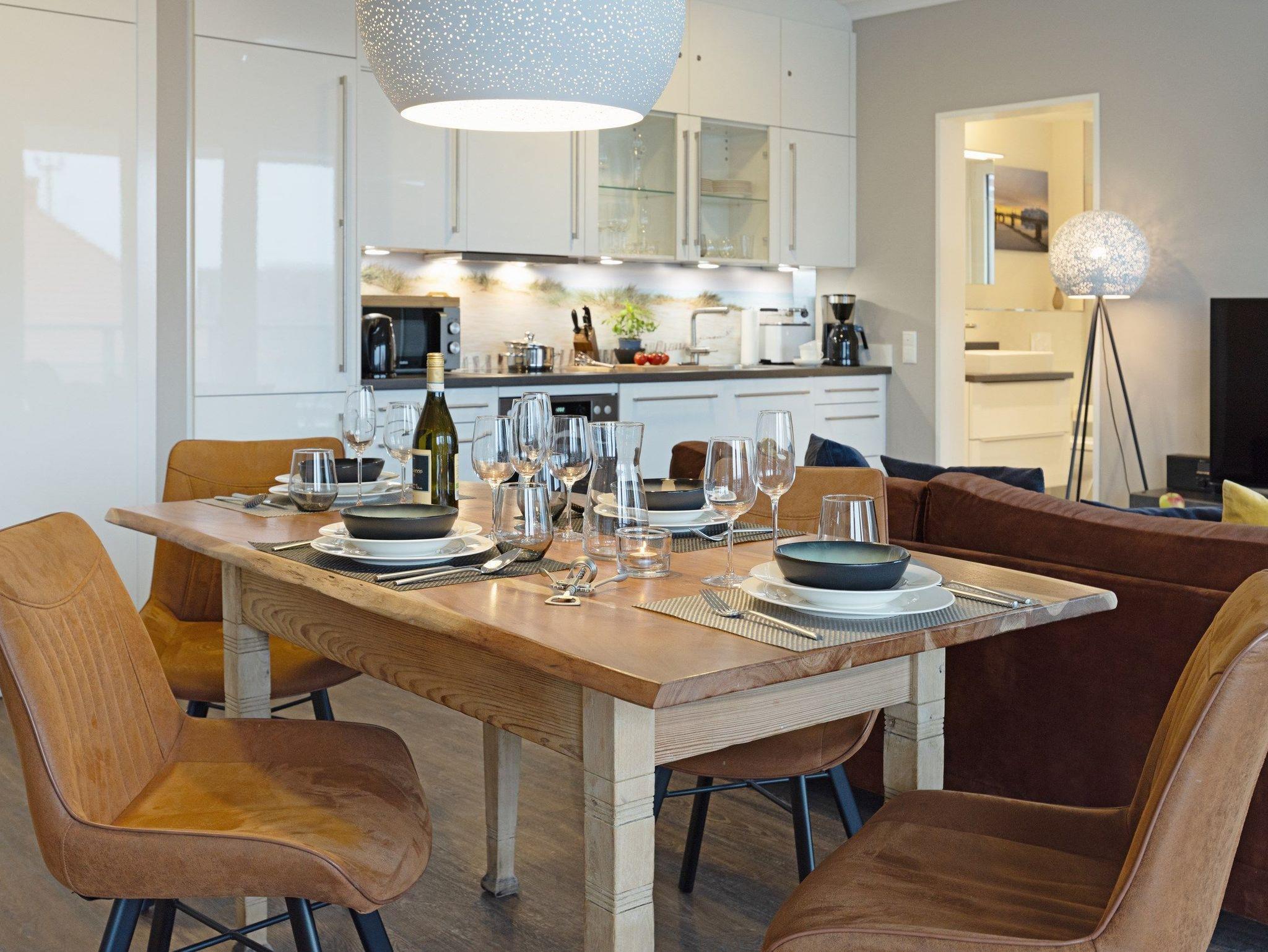 Am urigen Esstisch aus massivem Naturholz ko?nnen bis zu sechs Personen beisammen sitzen, essen, trinken, spielen, schnacken. Der charmante Wohnbereich besticht durch das großvolumige Relax-Sofa und la?dt zum la?ssigen Verweilen im geselligen Kreis von Freunden und Familie ein. Dort sorgt ein hochwertiges 55 Zoll-Smart-TV (SAMSUNG) fu?r Information und Unterhaltung. Fu?r ein kabelloses Klangerlebnis nutzen Sie die Bluetooth- Music-Box. Genießen Sie unser kostenfreies WLAN-Internet und loggen Sie sich wie zu Hause jederzeit in Ihre bevorzugten Streaming-Portale von Prime, Sky, Netflix usw. ein.