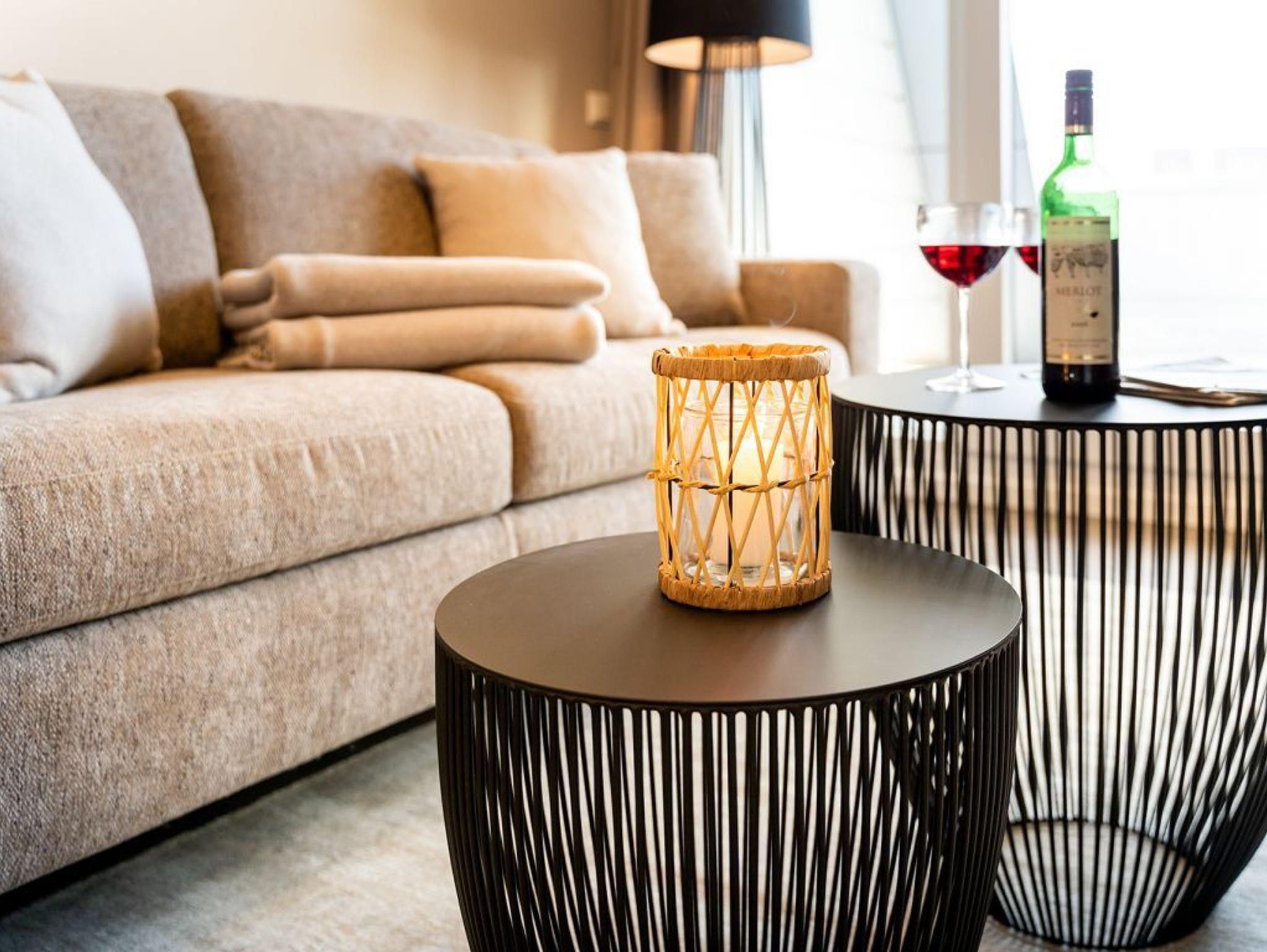 In dem exklusiv möblierten Ferienappartement Hafenspitze 13 genießen Sie einen Aufenthalt der Extraklasse. Mit dem Fahrstuhl gelangen Sie in die 1. Etage des Hauses. Es empfängt Sie ein modernes Appartement mit einer Wohnfläche von 58 qm, die für bis zu 4 Personen bestens geeignet ist. Von der sonnigen Dachterrasse schauen Sie direkt auf das maritime Hafenumfeld und auch auf die Ostsee. Bodentiefe Fenster lassen den Wohn-Essbereich mit Tageslicht fluten und selbstverständlich wurde elektrisch schaltbarer Sonnenschutz integriert. Zudem sind im Wohn-Esszimmer ein schickes Sofa sowie ein Esstisch. Internet Fernseher mit Hotelmodus und Internetradio sind ebenfalls vorhanden. Die Internetnutzung über WLAN erfolgt kostenfrei.