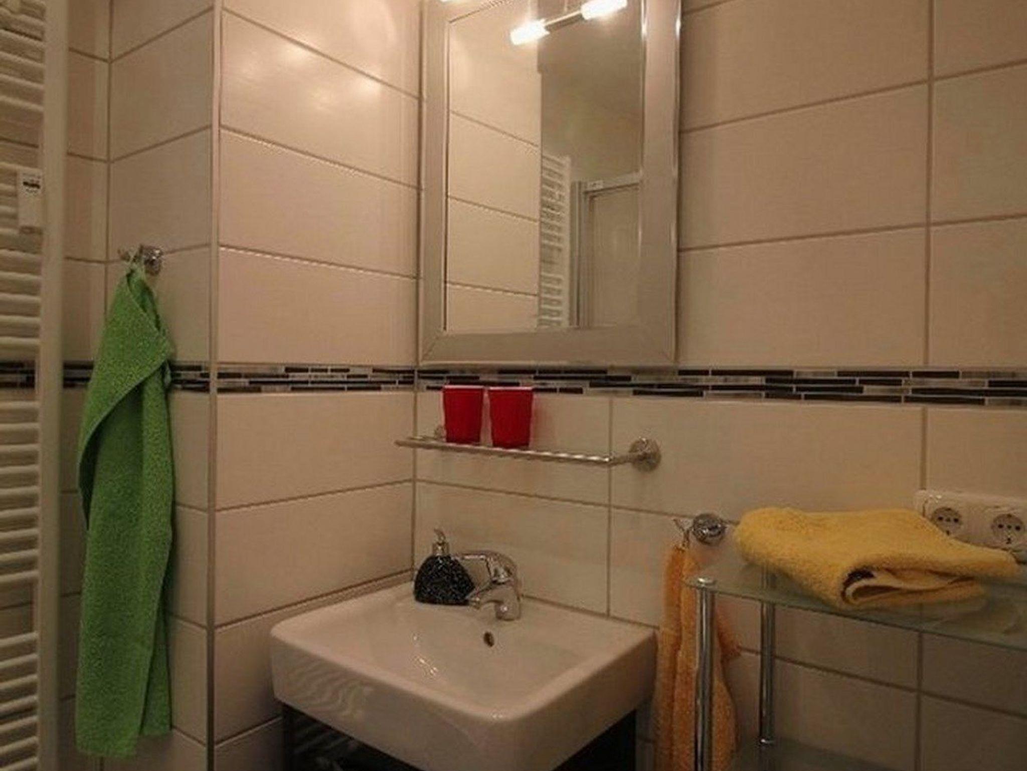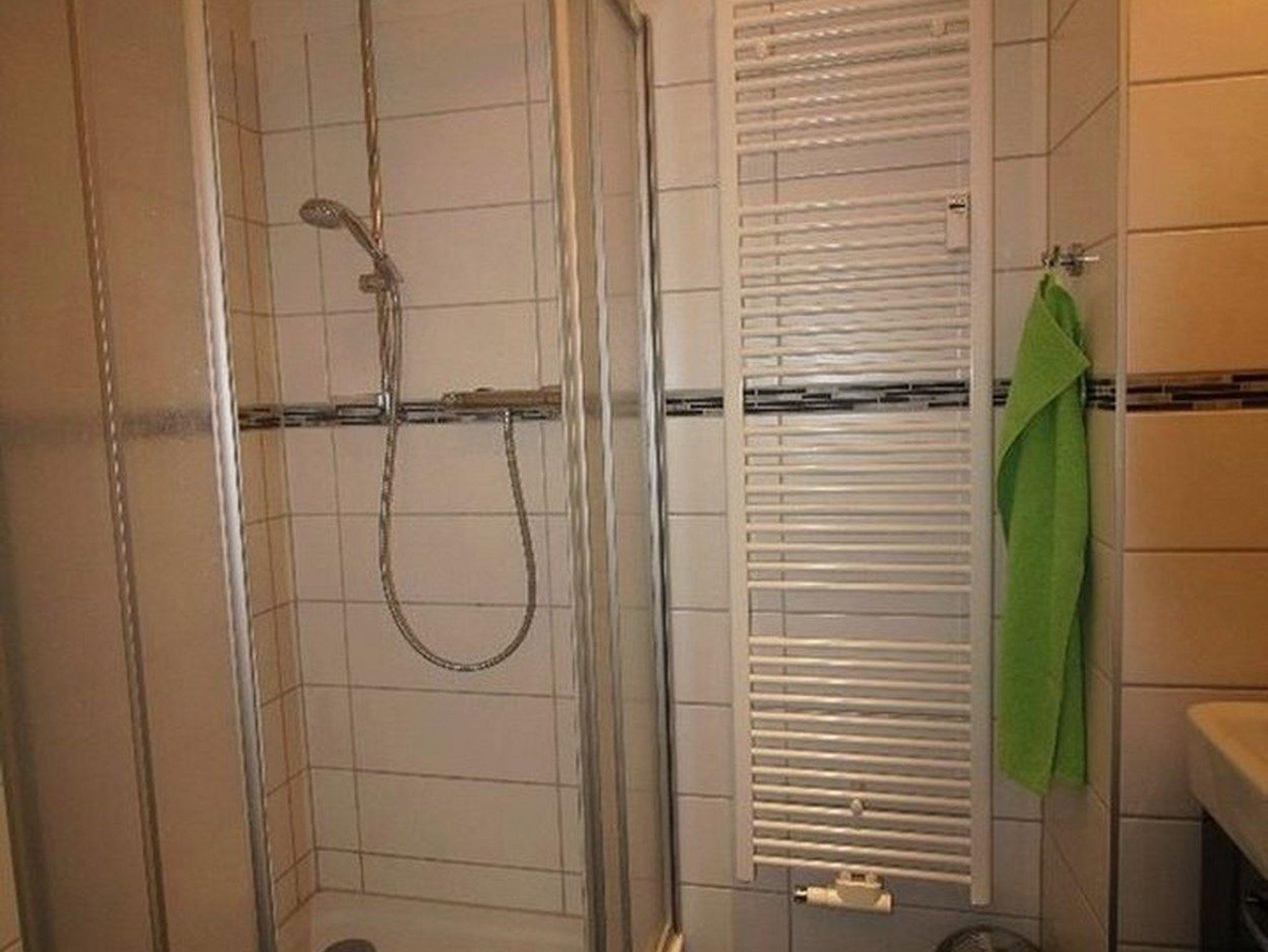 ? Badezimmer mit Dusche, WC, Spiegel, Waschbecken, Schrank, Handtuchregal, Fön, Handtuchheizkörper,