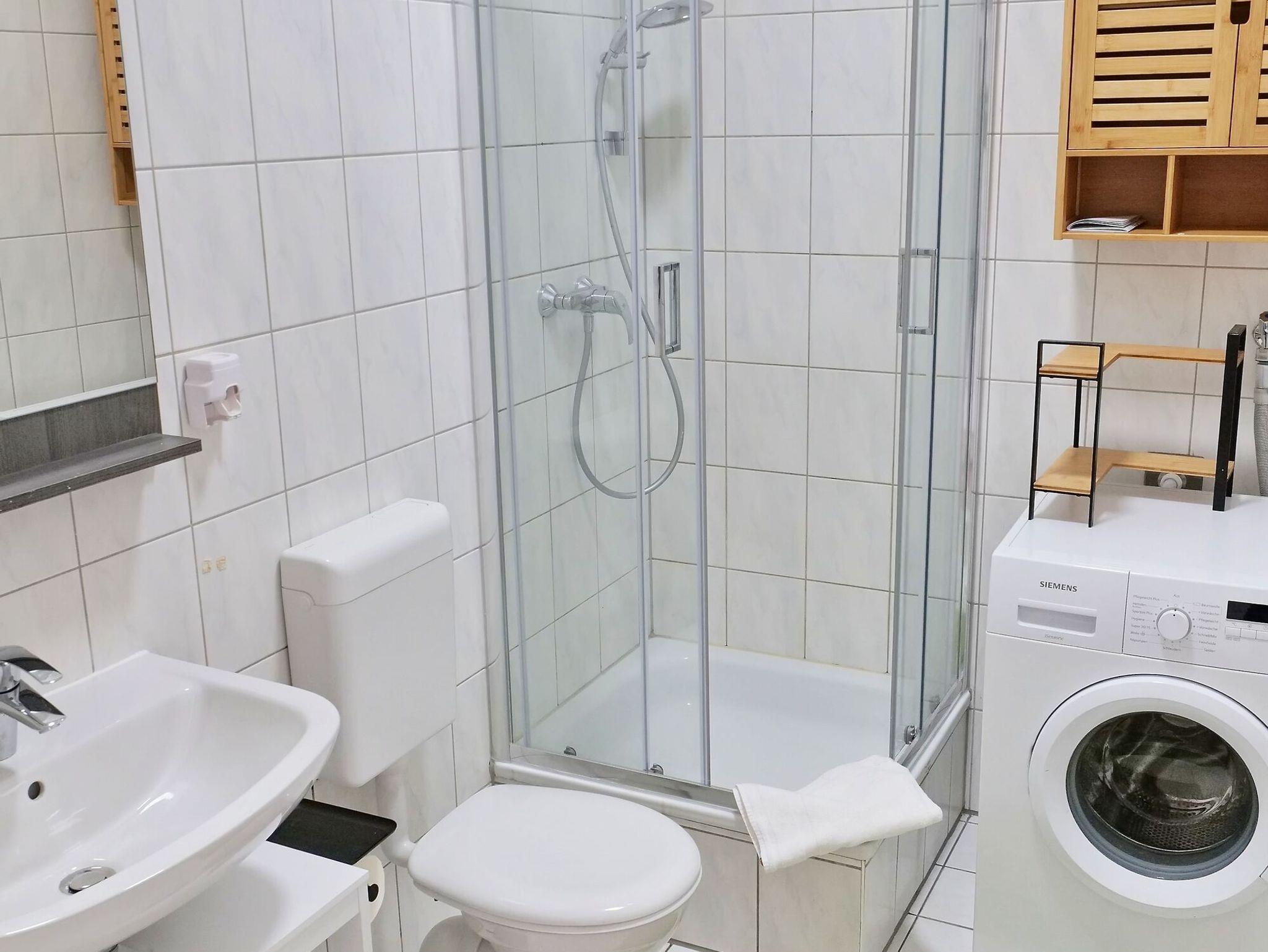 - Badezimmer mit Dusche/WC, Spiegel, Waschmaschine, Spiegel und Ablage, Wäscheständer