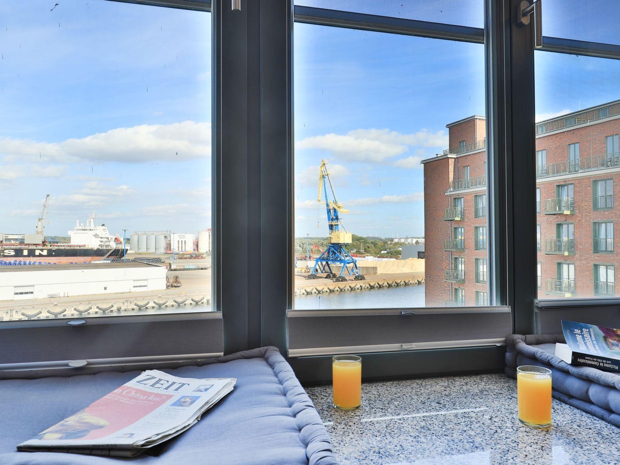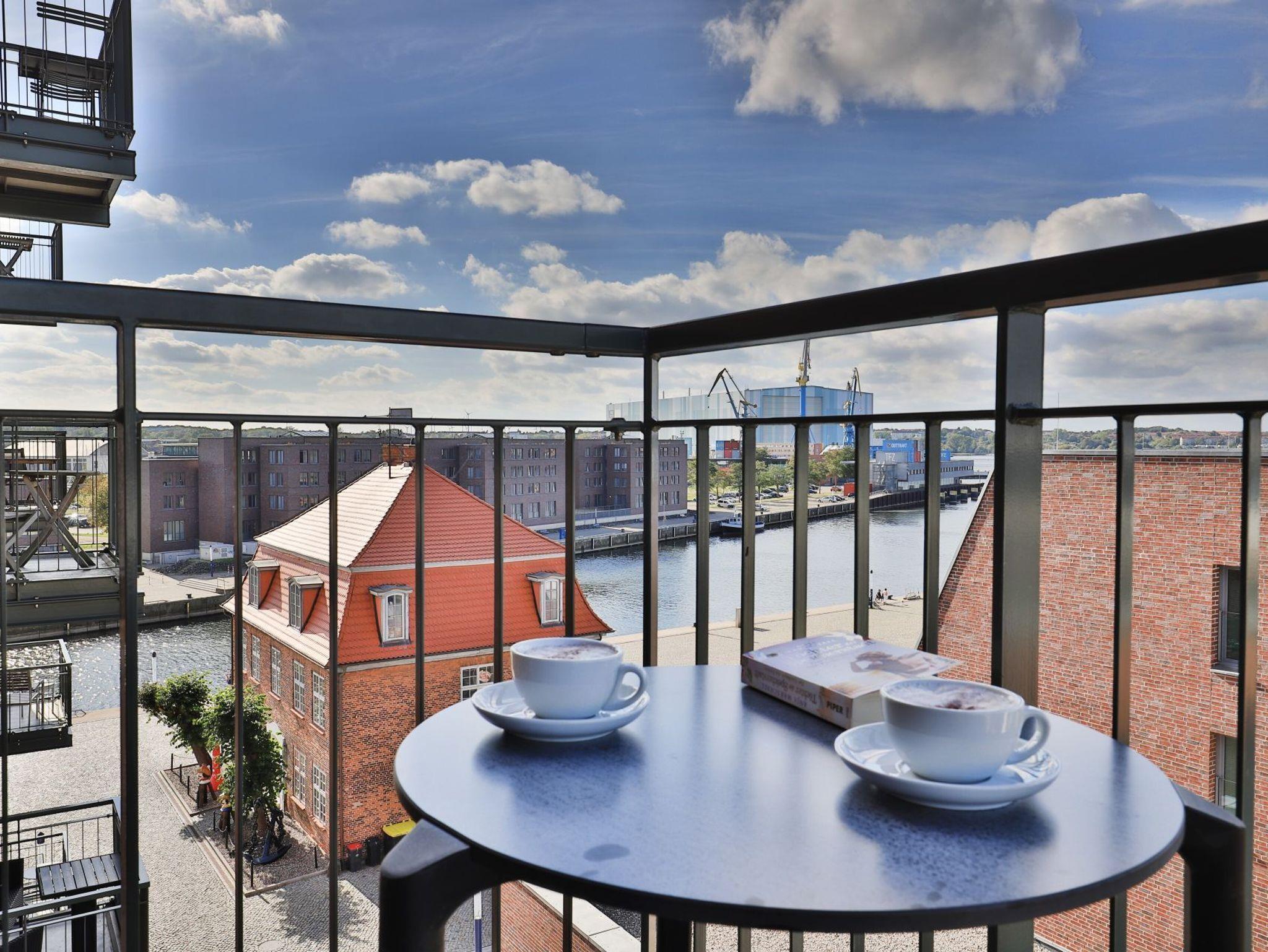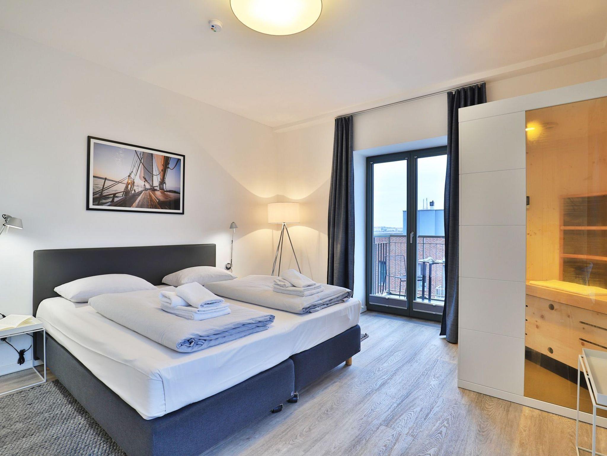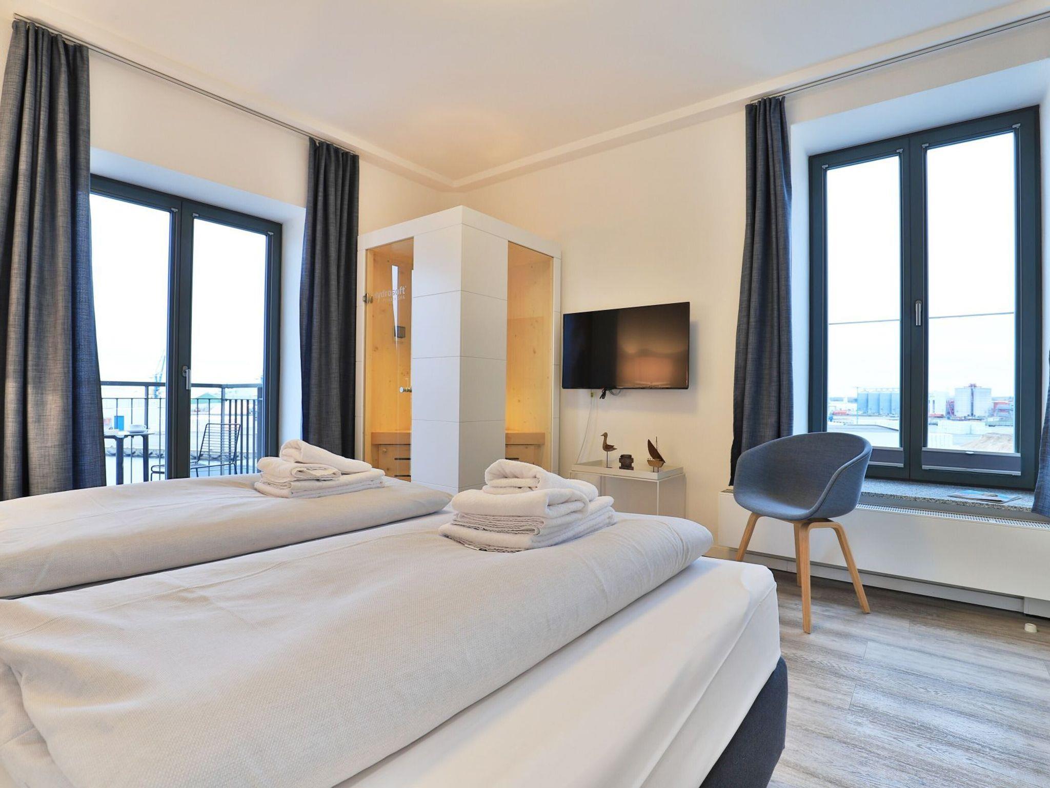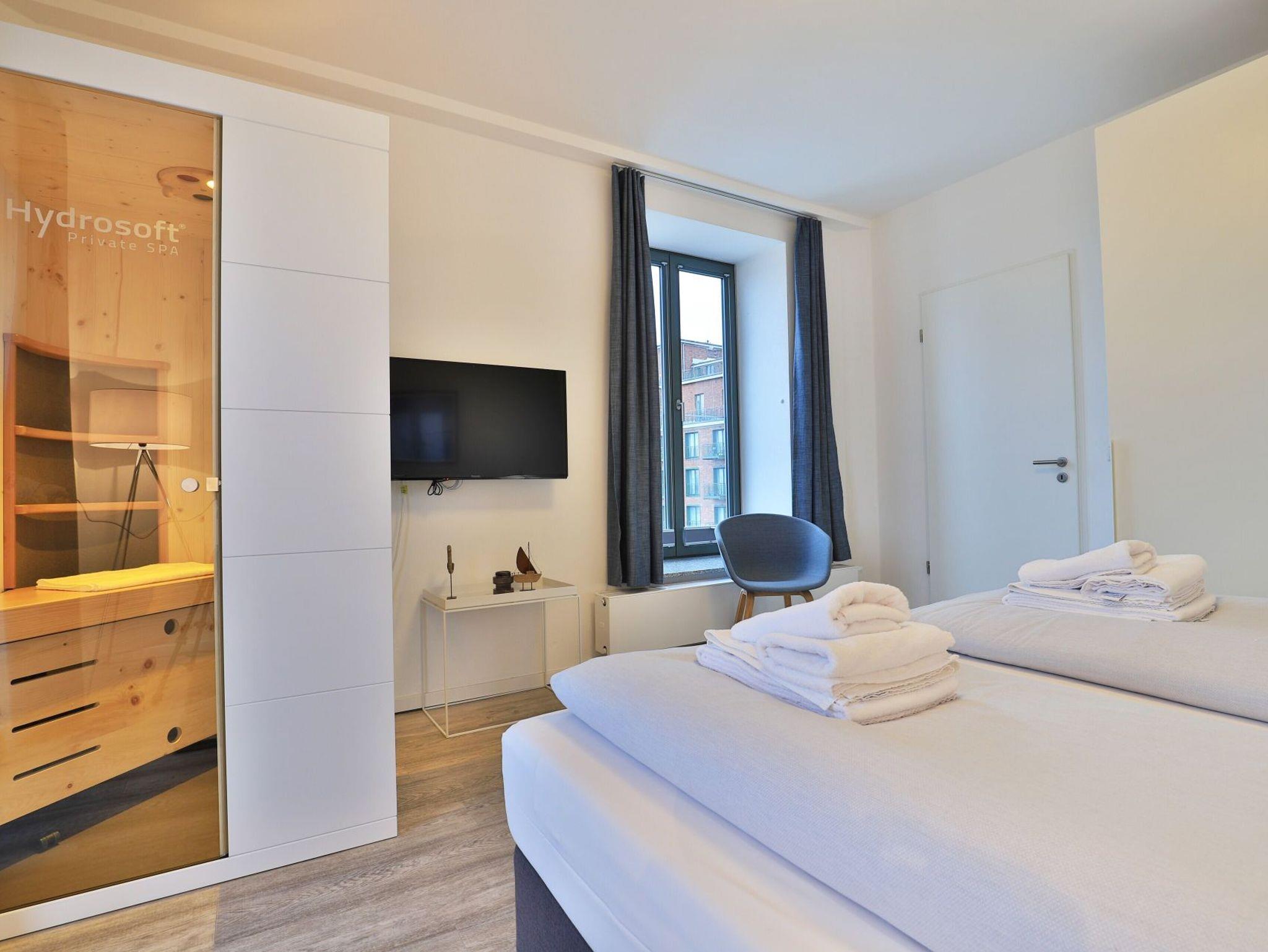Modernes 2-Zimmer-Appartement im Ohlerich Speicher mit spektakulärer Hafenaussicht und Hydrosoft-Infrarotsauna.