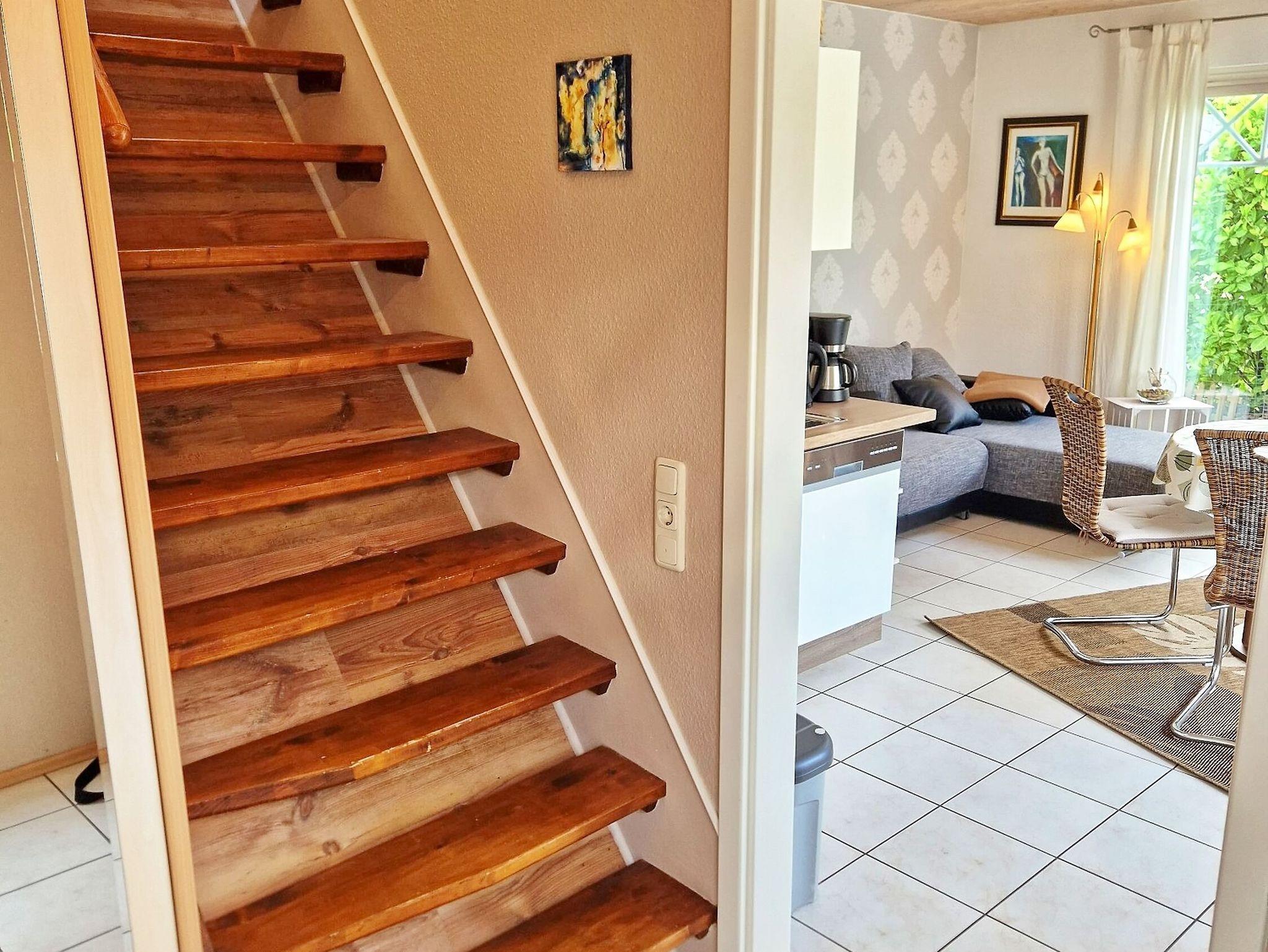 Exklusive Ferienwohnung mit separatem Eingang im neuwertigen Holzhaus; Eingangsflur mit Garderobe, ein kombinierter Ess-/Wohnraum mit Küchenzeile, Esstisch, Couch, TV; modernes Bad mit Dusche, das stilvolle Schlafzimmer mit Doppelbett im Obergeschoss ist über eine Treppe (steil) räumlich getrennt, eigene Terrasse mit Gartenmöbel, Parkplatz. Aufbettung im Wohnraum (Couch) und Reisebett auf Anfrage möglich. Die Räume verfügen über einen Sichtschutz (Plissee), sind aber nicht vollständig zu verdunkeln.