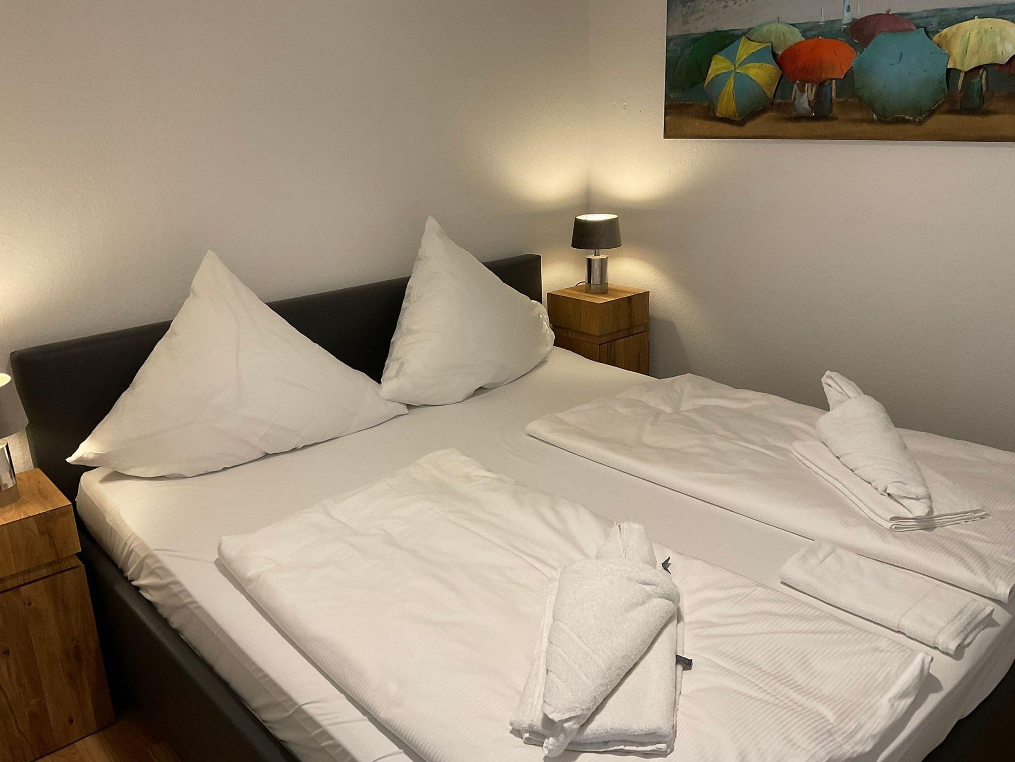 • 1 Schlafzimmer getrennt durch große Tür vom Wohnzimmer mit großem Boxspringbett (1,80 x 2,00 m), sowie ausreichend Stauraum für Ihre Kleidung. Hochwertige Biobettdecken und Kopfkissen allergikergeeignet.