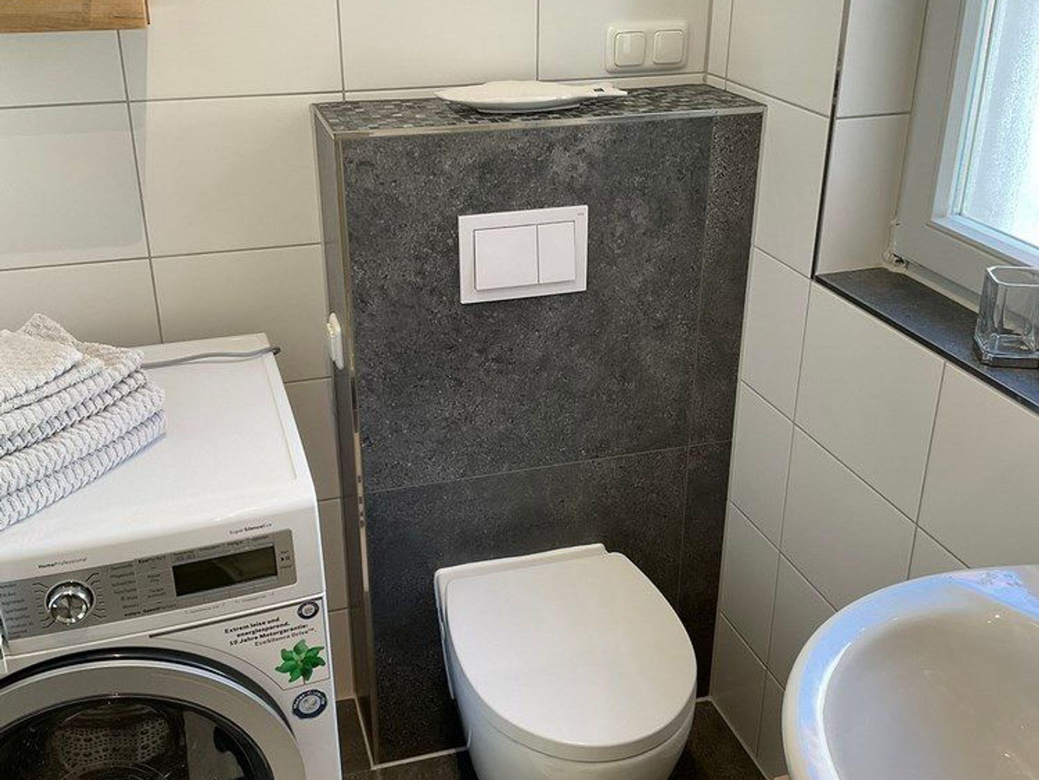 • Schickes Badezimmer mit Dusche, WC, Spiegel und ausreichend Ablagefläche für Ihre Beautyutensilien. Eine Waschmaschine und ein Wäscheständer sind vorhanden.