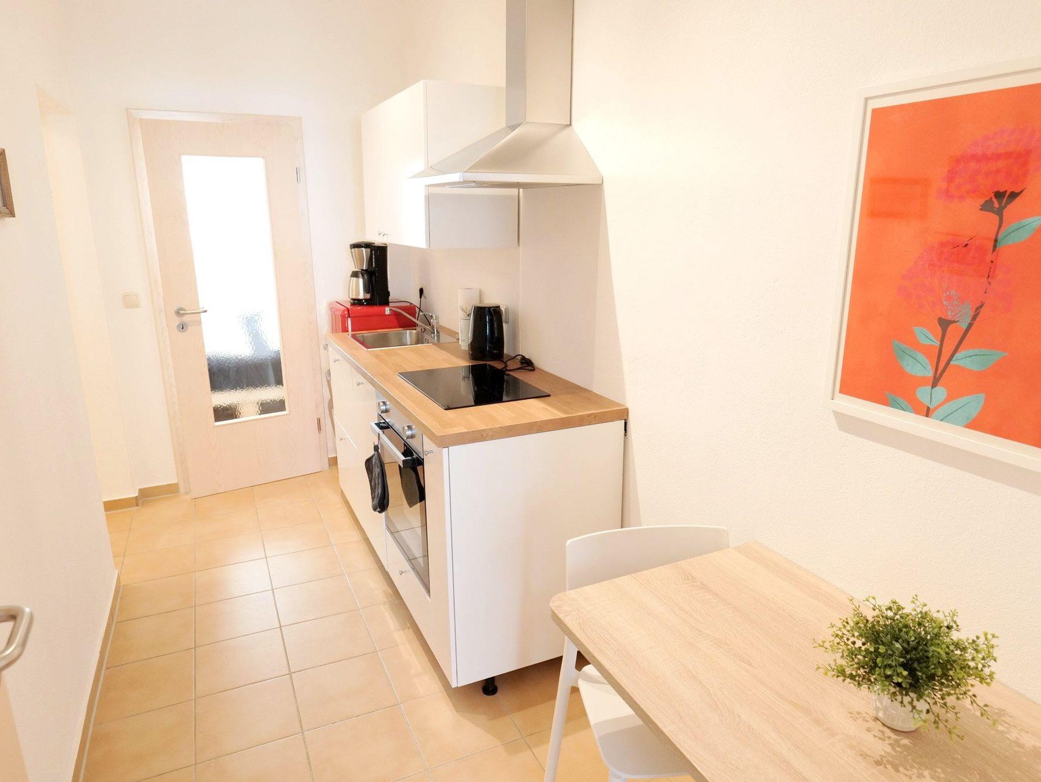 - Küche ausgestattet mit Geschirrspüler, Backofen, 2-Platten-Ceranfeld, Kühlschrank, Kaffeemaschine, Wasserkocher, Geschirr, Besteck, Gläser uvm.