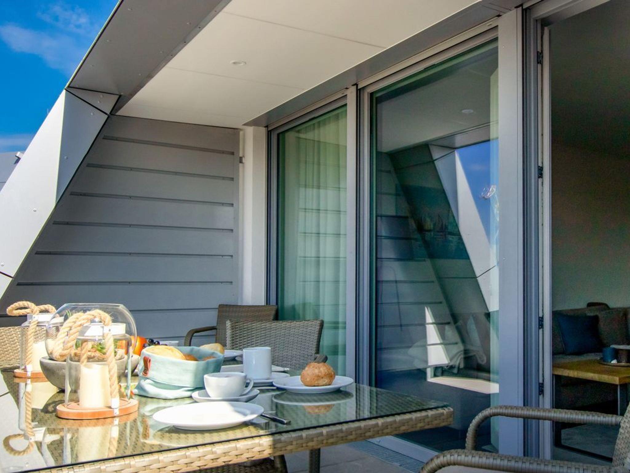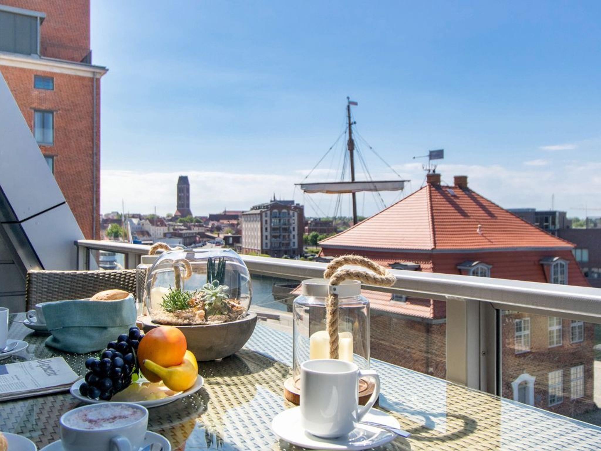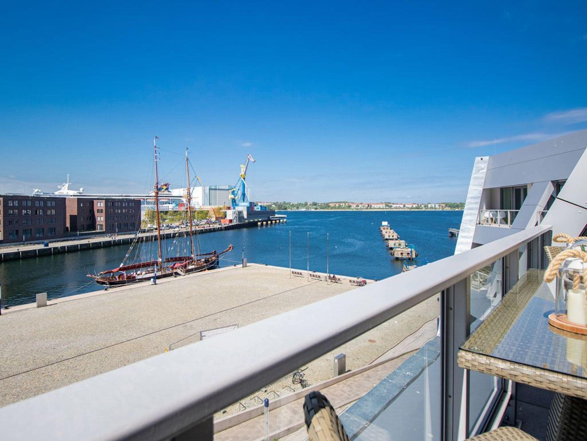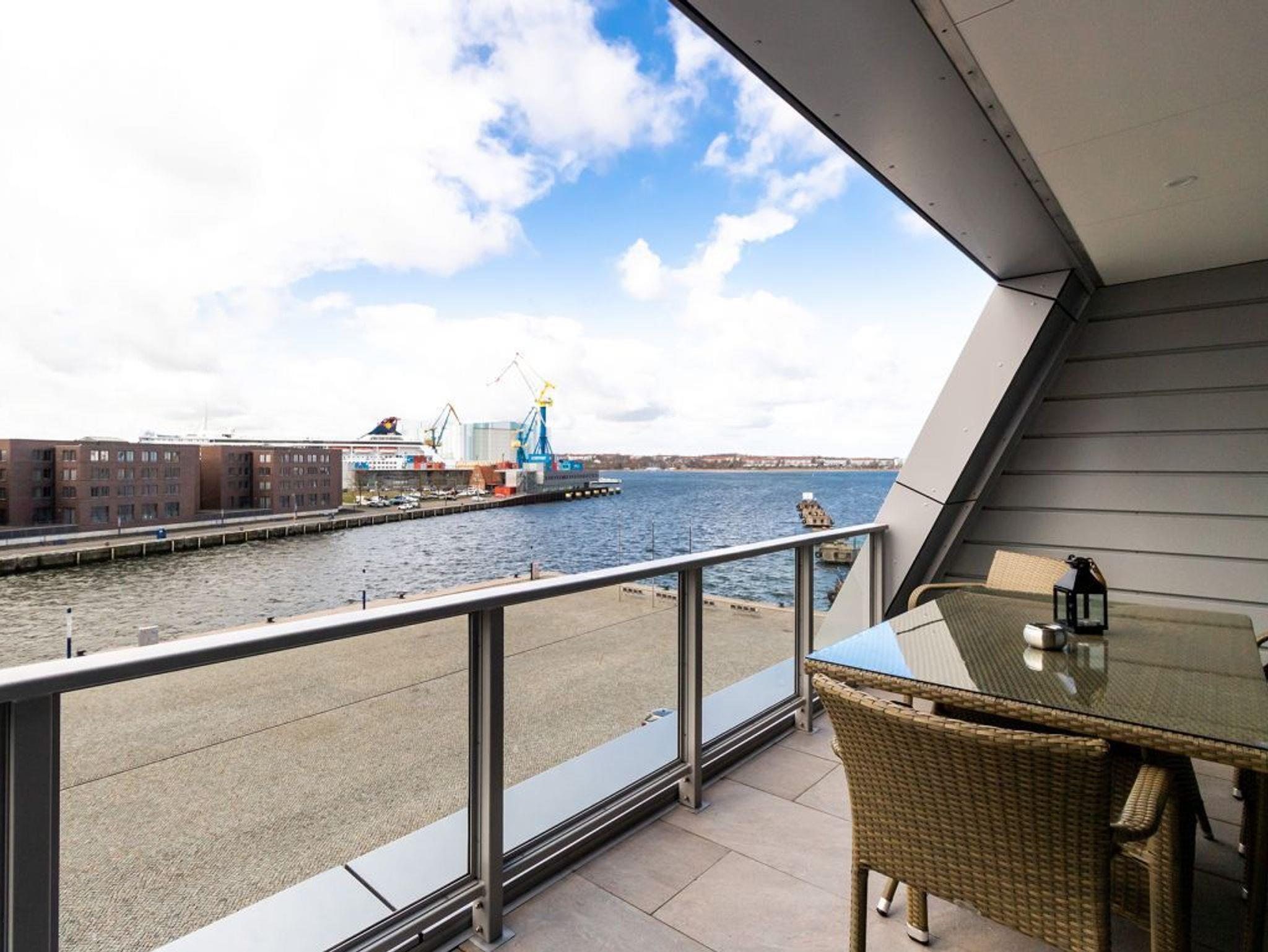 Luxuriöses 3-Zimmer-Appartement Hafenspitze 34 mit Hafenblick in Wismar, moderne Ausstattung und Balkon für bis zu 4 Personen.