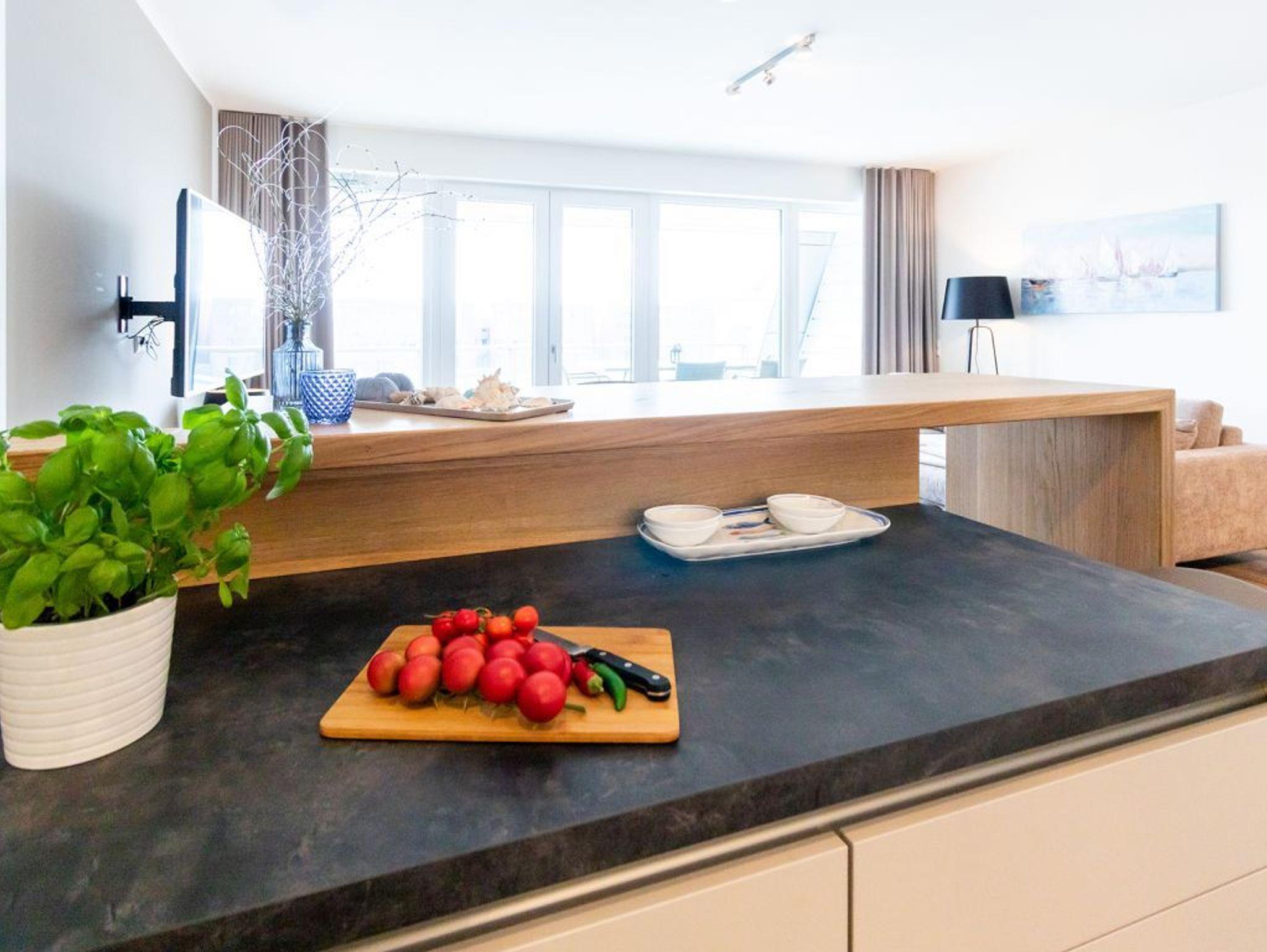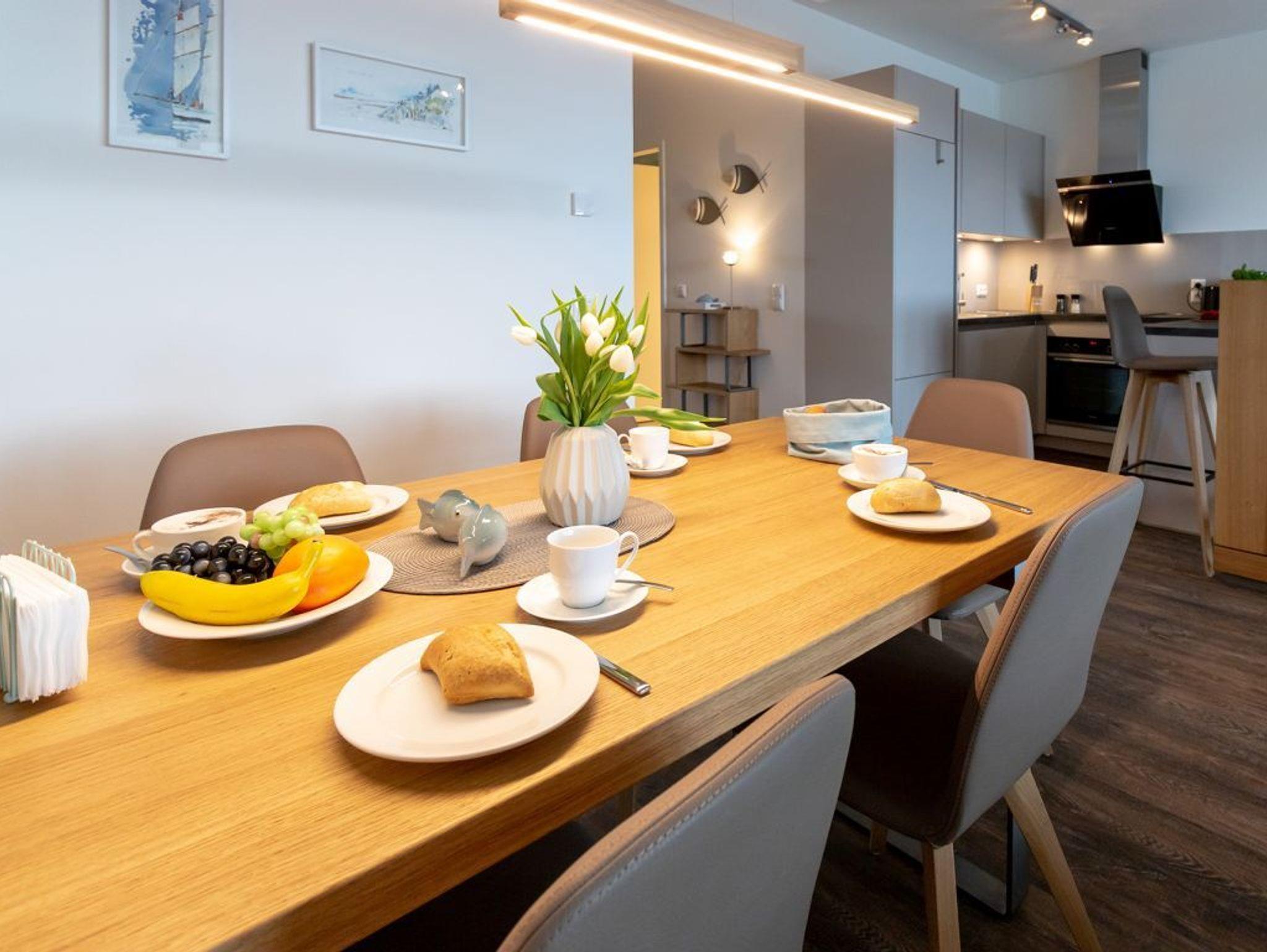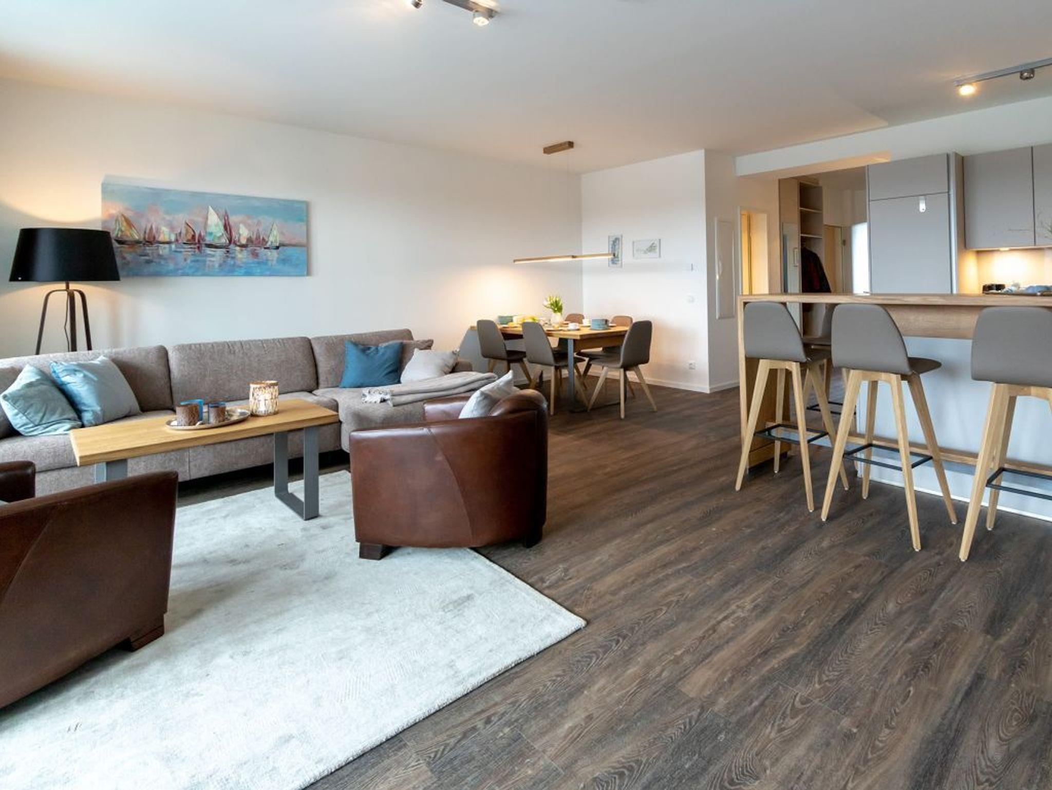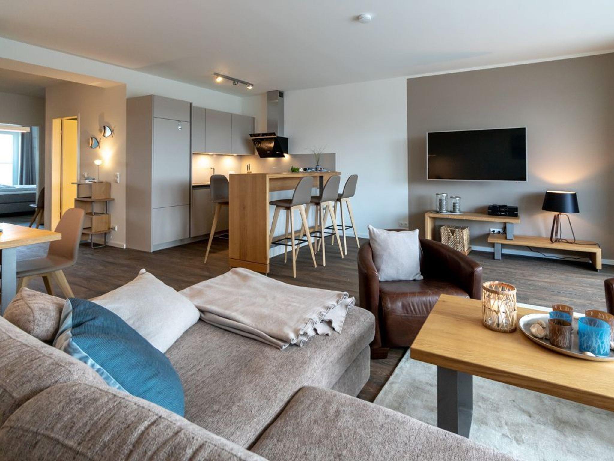 Für unsere Gäste mit gehobenem Anspruch ist die 3-Zimmer-Maisonetten-Wohnung Hafenspitze 34 ein ideales Urlaubsziel. Insbesondere bietet die geräumige Wohnfläche mit 93qm ideale Bedingungen auch für einen längeren Aufenthalt mit bis zu 4 Personen. Ein Fahrstuhl gleitet hinauf in das 2. Obergeschoss. Über eine separate, in der Wohnung liegende Treppe gelangen Sie in den sehr hochwertig möblierten Wohn-/Essbereich mit integrierter Wohnküchenzeile, wo Sie zudem eine bequeme Sitzgarnitur sowie ein großer Esstisch, wie auch Flachbild Fernseher und Internetradio mit Hotelmodus erwarten. Der Internetzugang über WLAN steht kostenfrei bereit.