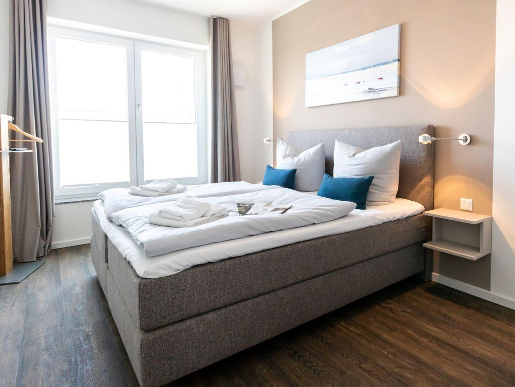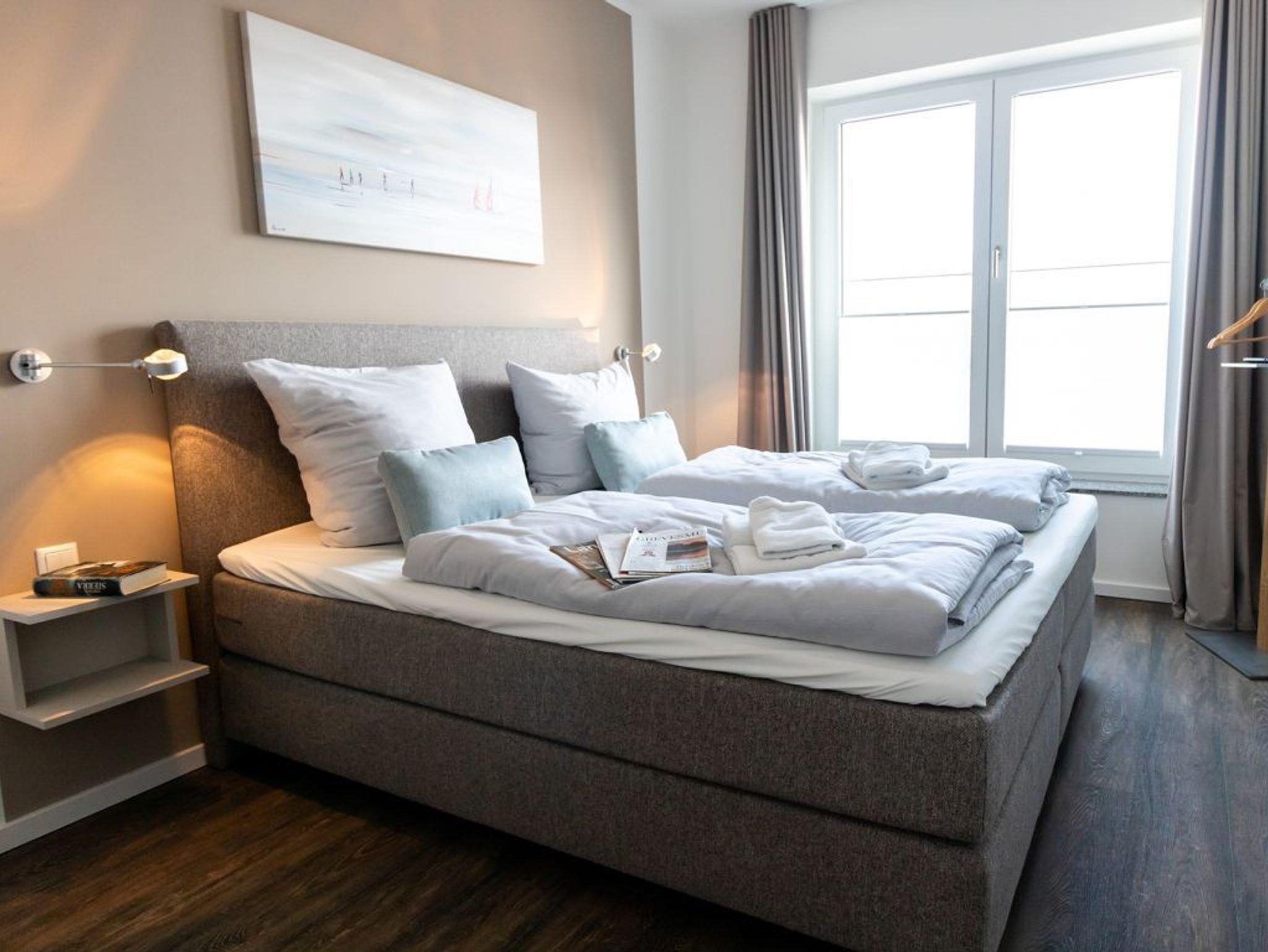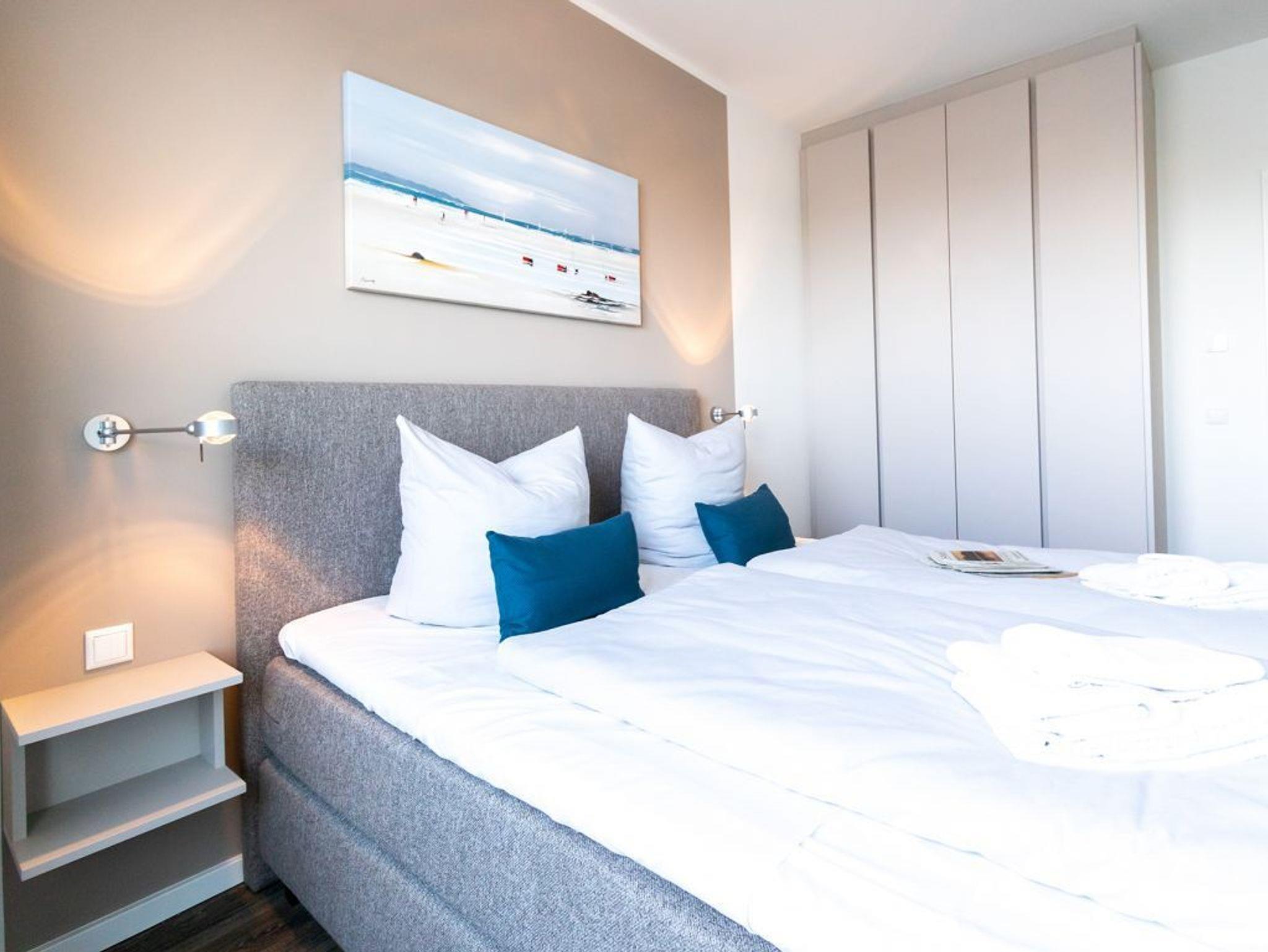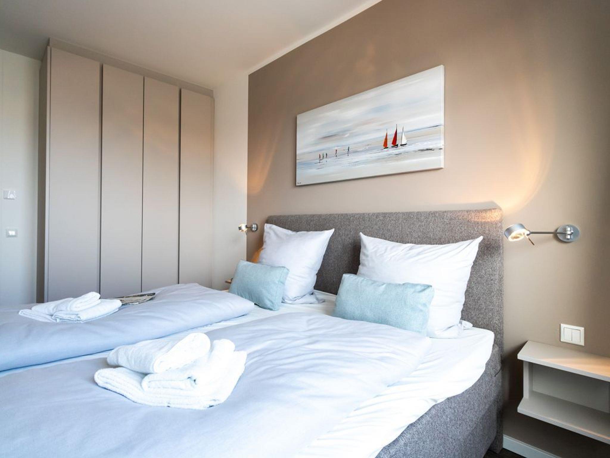 Vom Wohnbereich aus betreten Sie die großzügige Loggia, von wo aus Sie eine wundervolle Aussicht auf den Hafen und die Ostsee genießen können. Für sommerlichen Wärmeschutz sind im Wohnbereich elektrisch bedienbare Außenrollos vorhanden. Entspannte Nächte verbringen Sie in zwei separaten Schlafzimmern, wo Sie Ihre Urlaubsgarderobe in komfortablen Garderobenschränken unterbringen.