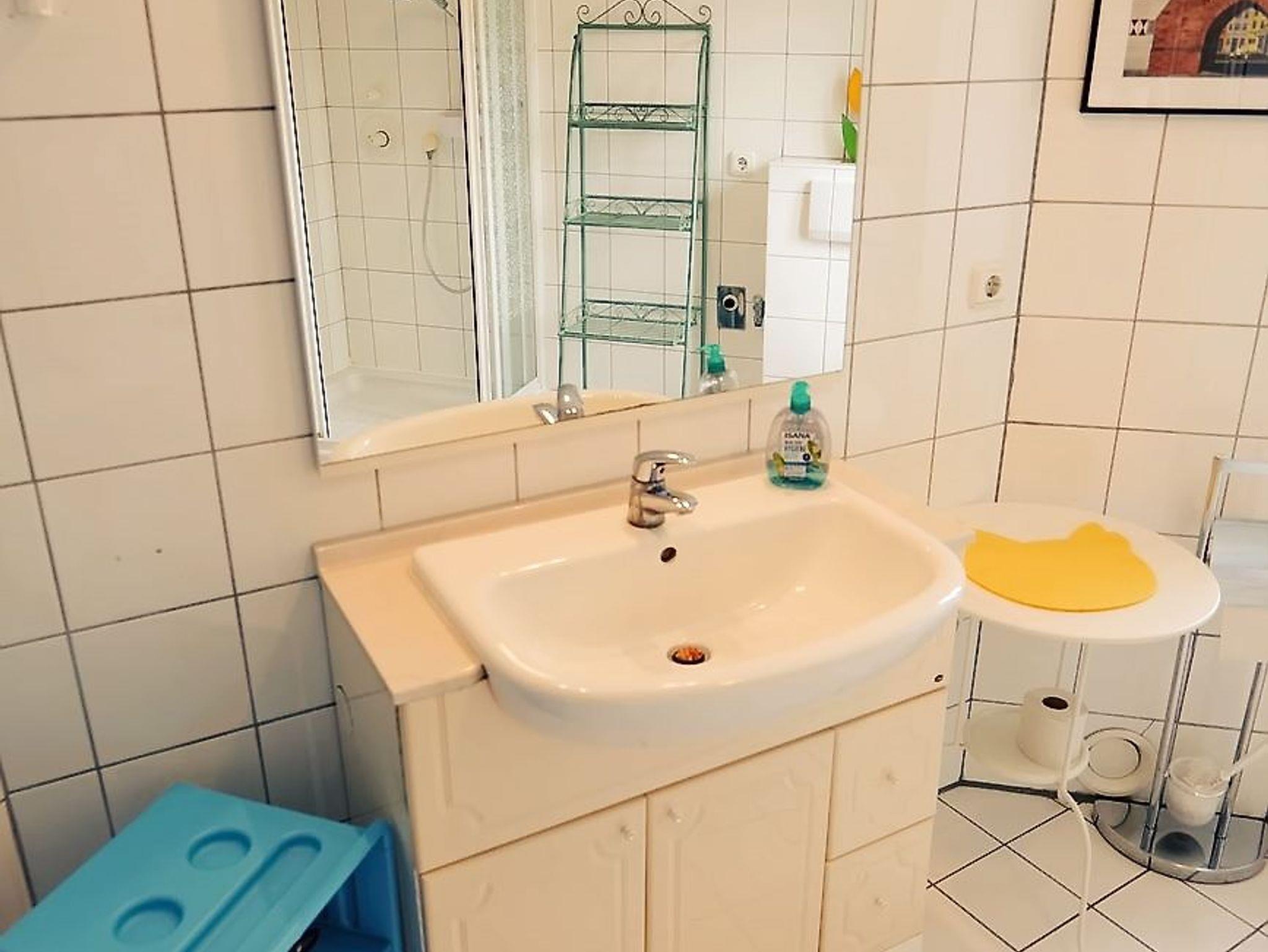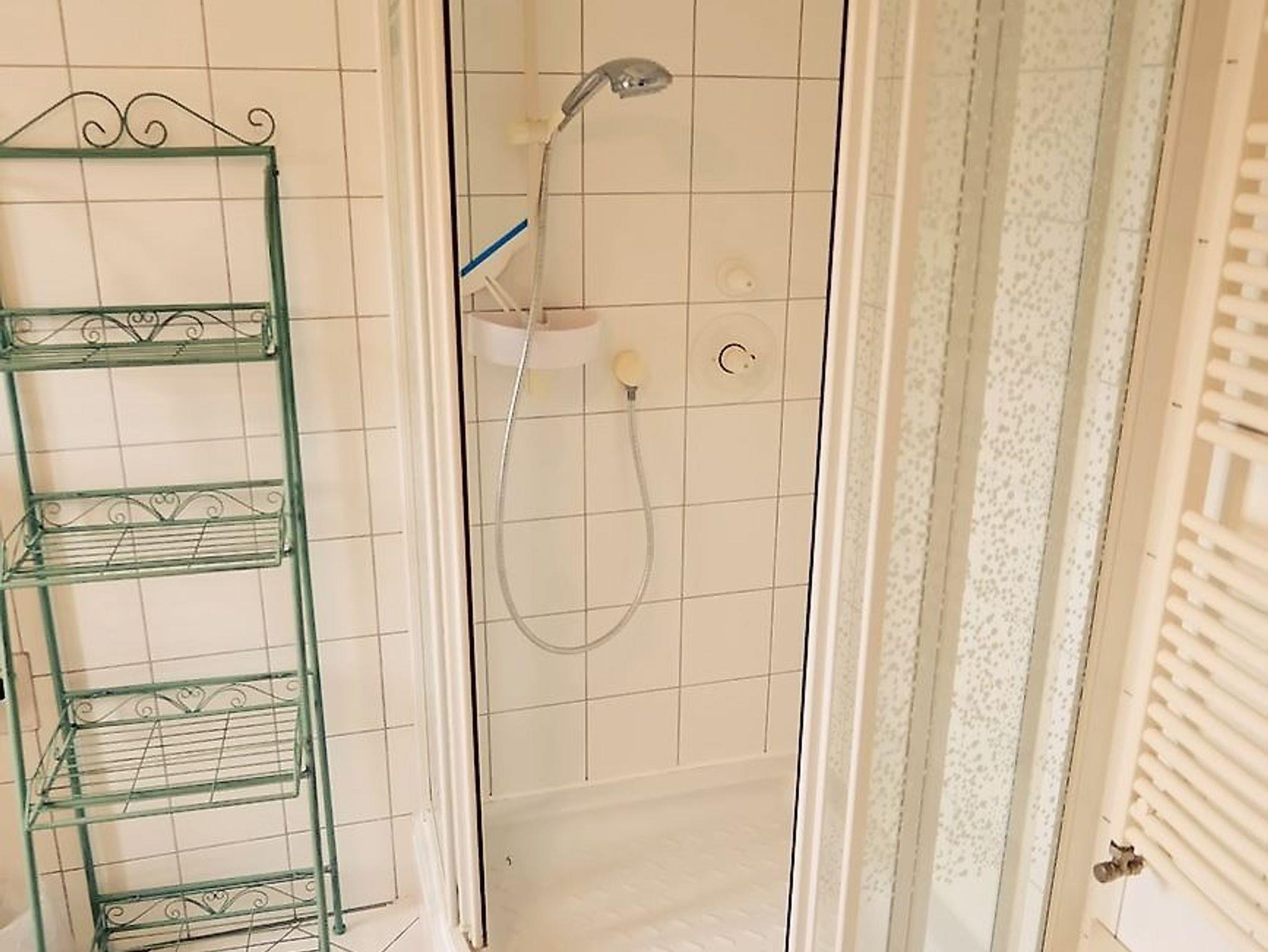 - Badezimmer mit Dusche, WC, Waschmaschine und Trockner, Spiegel und Ablage (Fön)