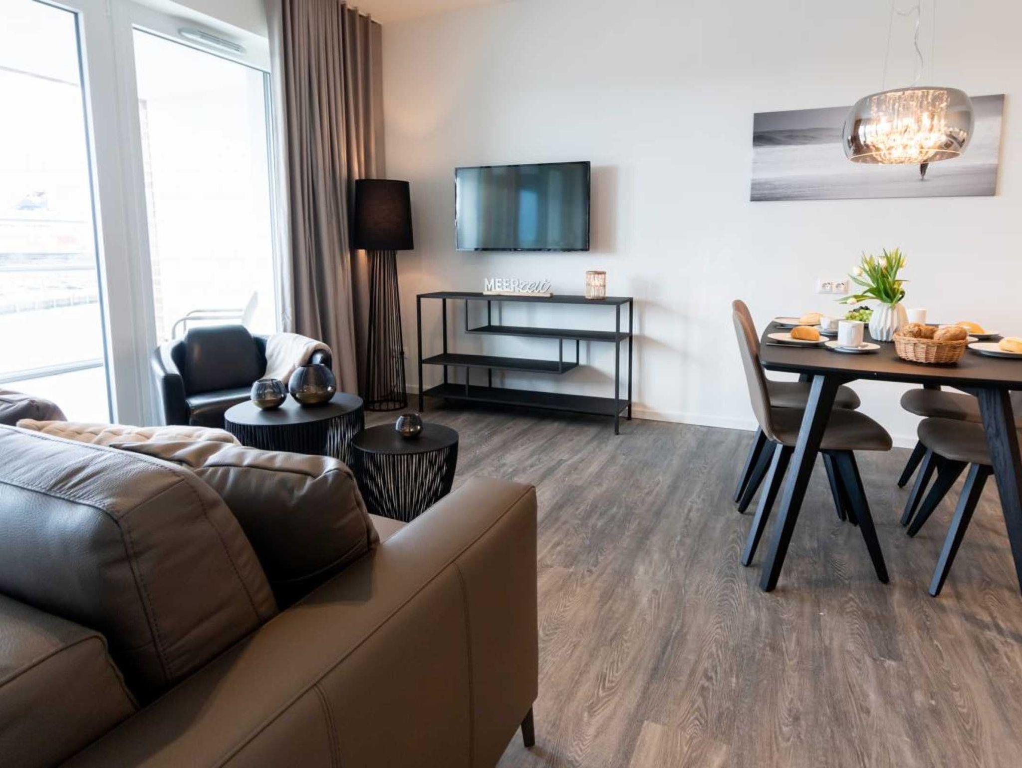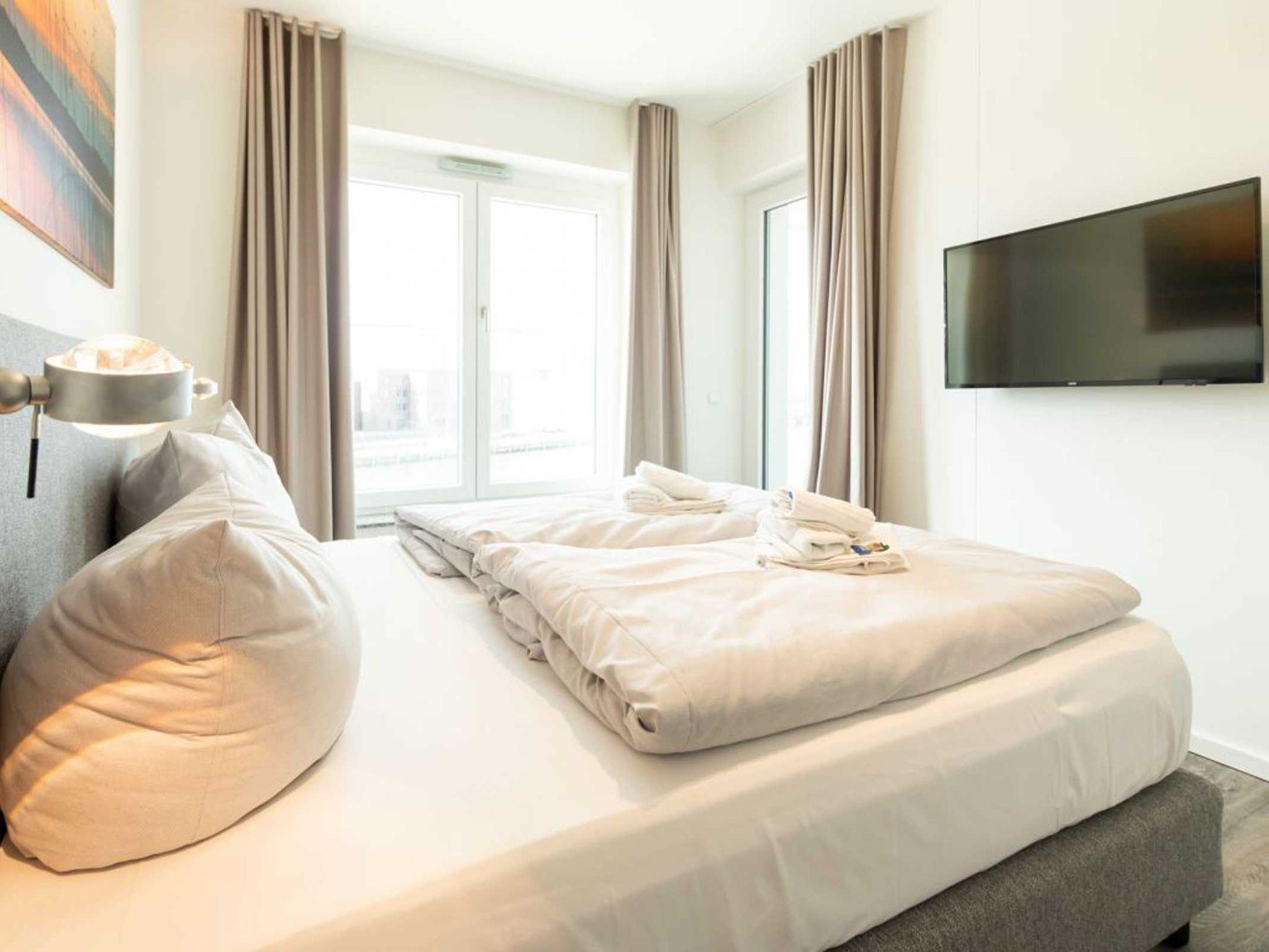 In der 3. Wohnebene befindet sich das lichtdurchflutete 2-Zimmer-Appartement in der Hafenspitze 39, welches bequem mit dem Fahrstuhl erreichbar ist und ideale Voraussetzungen für einen Urlaub mit gehobenen Ansprüchen bietet. Die vorteilhaft unterteilte Wohnfläche ermöglicht mit 66qm eine Belegung mit bis zu 4 Personen. Begeistern wird Sie auch die großzügige, saisonal möblierte Hafenblick Loggia, die sowohl vom Wohnbereich als auch vom Schlafzimmer aus begehbar ist. Der behaglich möblierte Wohn-Essbereich verfügt über ein hochwertiges Schlafsofa mit zwei Schlafgelegenheiten, einen Esstisch sowie Flachbild Fernseher und Internetradio mit Hotelmodus. Kostenfrei steht für Sie die Nutzung des hauseigenen WLAN-Anschluss bereit.