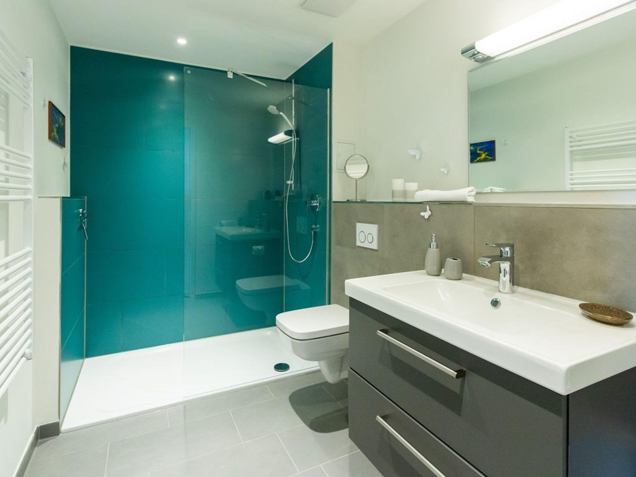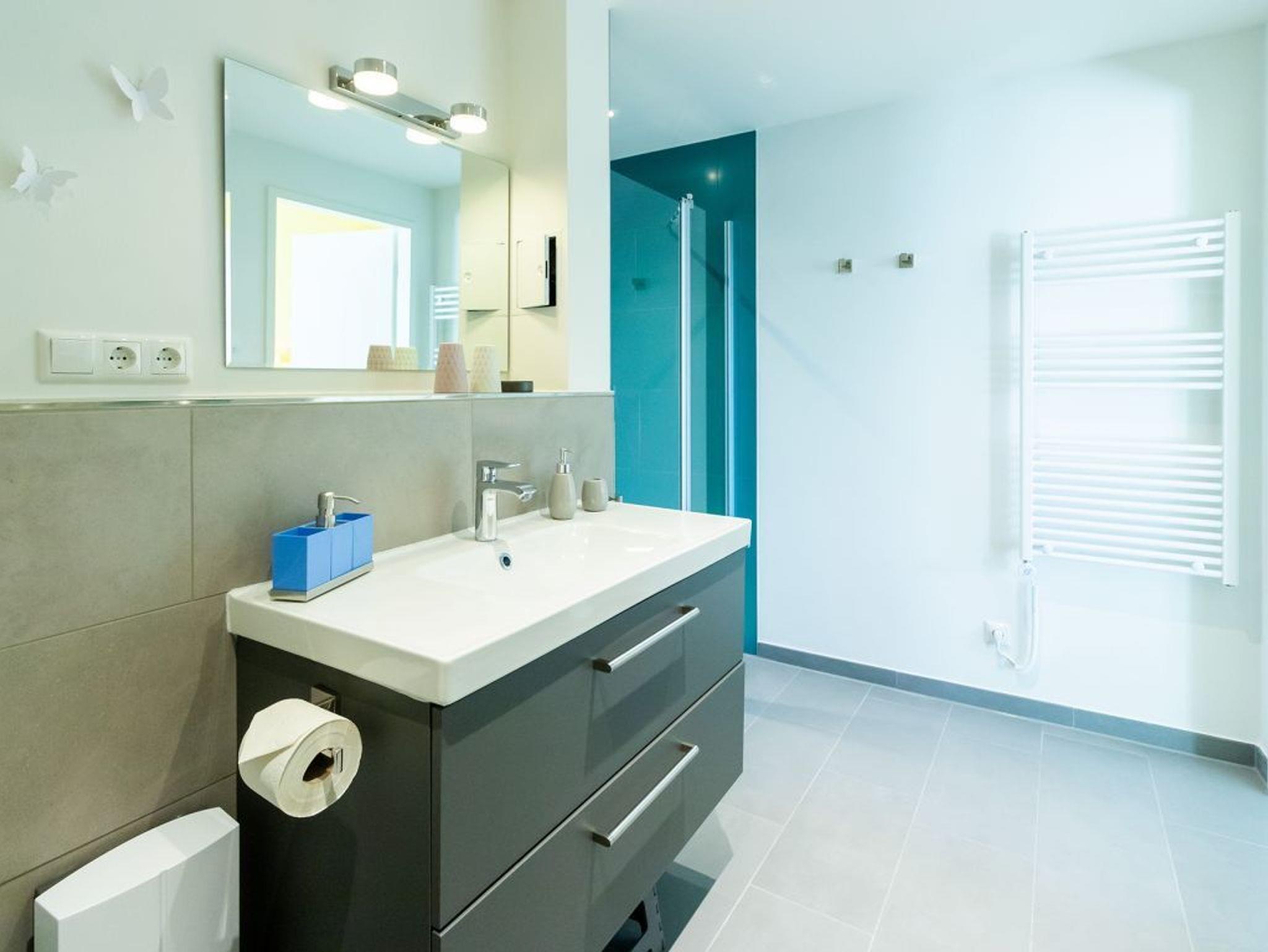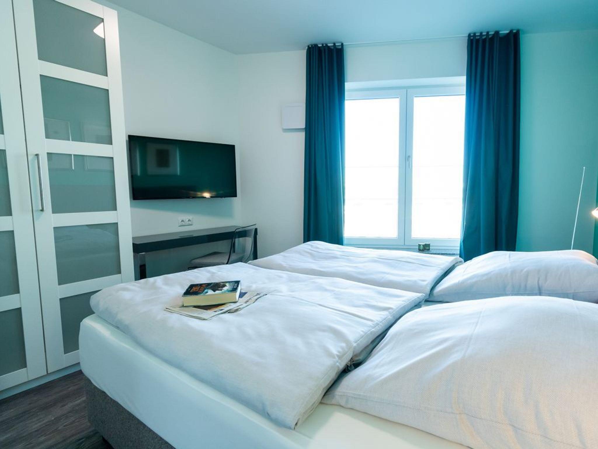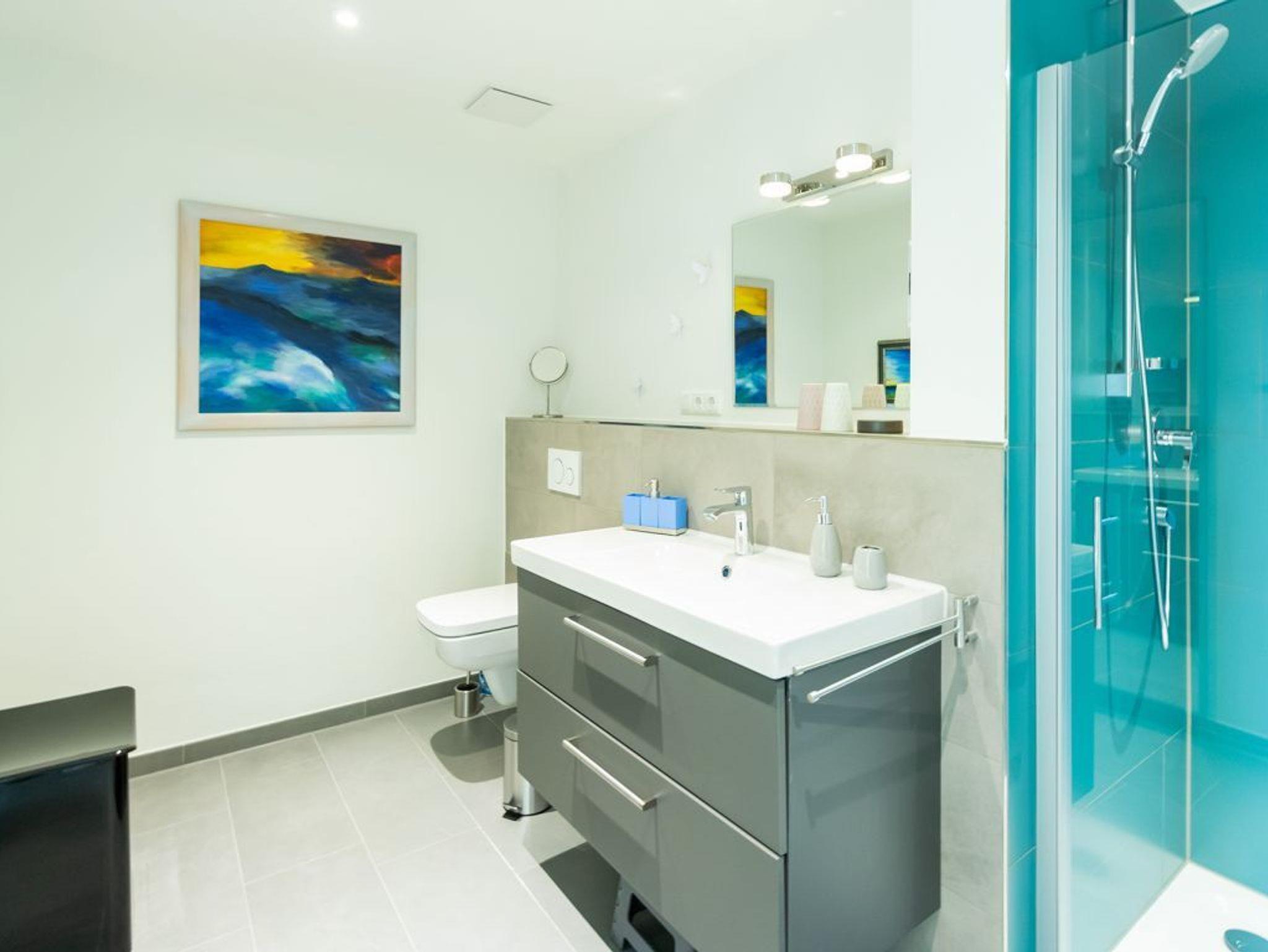 Im hellen Wohn-Essbereich mit bodentiefen Fenstern erwartet Sie eine schicke Sitzgruppe sowie eine voll ausgestattete Einbauküchenzeile mit angrenzendem Esstisch. Internetfähiges TV /Radio mit Hotelmodus ist hier ebenso selbstverständlich, wie die kostenfreie WLAN-Nutzung. Sommerliche Beschattung ermöglichen elektrisch bedienbare Außenrollos. Das Appartement kann mit bis zu 4 Personen bewohnt werden, wofür es mit idealen Bedingungen besticht. Zwei separate Schlafzimmer sind ebenso vorhanden, wie zwei sehr moderne, innenliegende Duschbäder. Somit eignet sich diese Traumwohnung auch bestens für befreundete Paare.