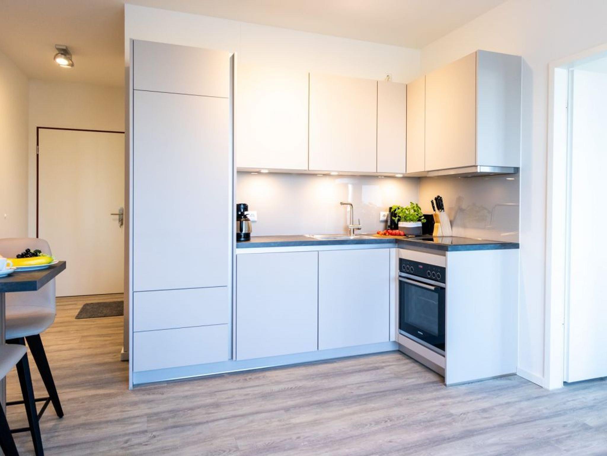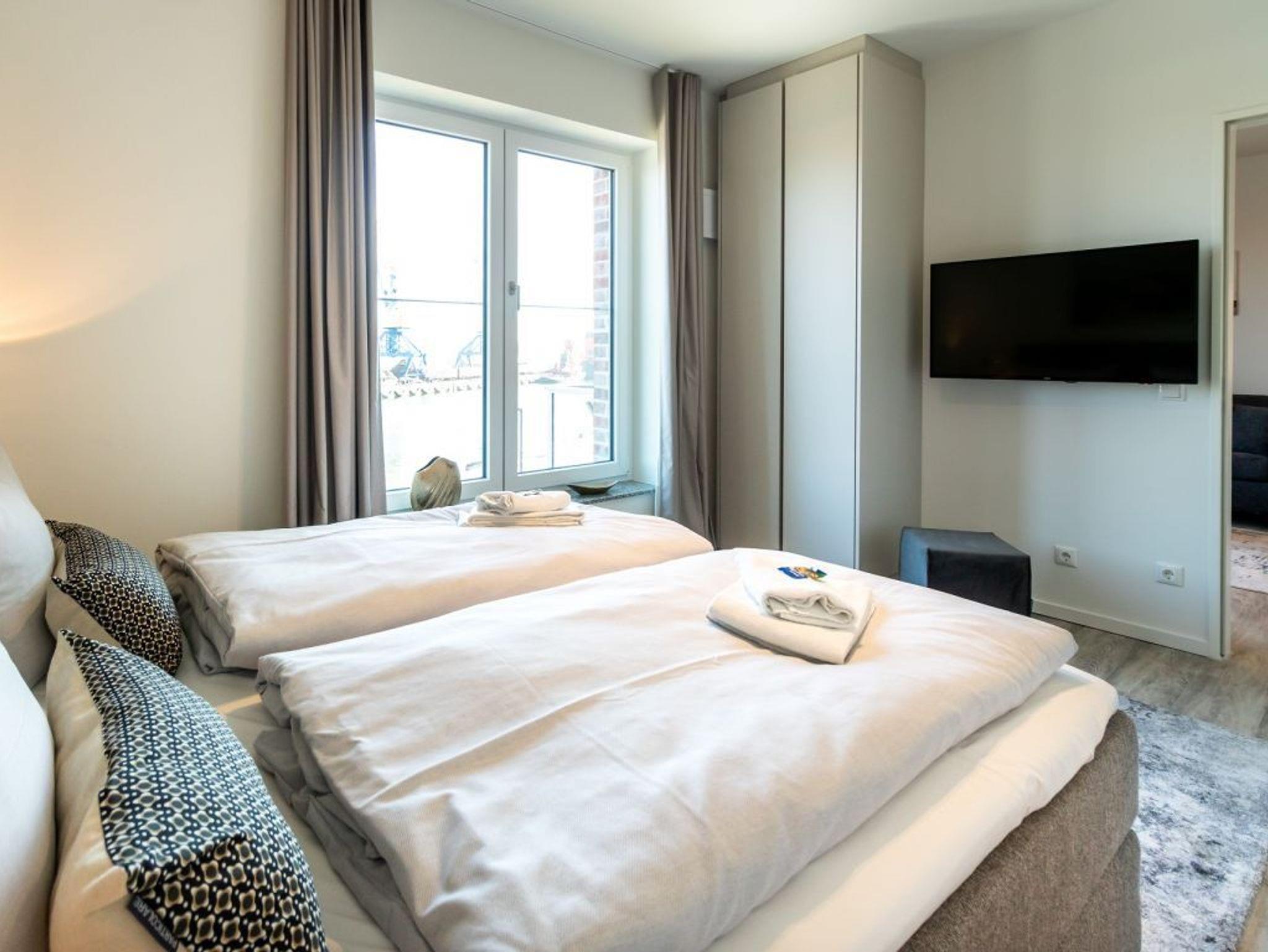 In den Wohnbereich ist eine offene Küchenzeile integriert, die technisch voll ausgestattet alles bietet, was für die Zubereitung von Urlaubsmahlzeiten benötigt wird. Ihre gemeinsamen Mahlzeiten können Sie gemütlich am Esstisch einnehmen. Für technische Unterhaltung sorgen ein TV-Gerät als Flachbildschirm mit Hotelmodus sowie Internet Radio. WLAN steht kostenfrei bereit. Geruhsame Nächte ermöglicht Ihnen ein separates Schlafzimmer mit Doppelbett und Garderobenschrank. Das innenliegende Komfort Badezimmer mit bodengleicher Dusche und Handtuchheizkörper lasst Sie gut in jeden Tag starten. Als inklusive Leistung sind bei Anreise die Betten für 2 Personen bereits für Sie bezogen und Hand/Duschtücher liegen bereit. Weitere Wäschepakete können kostenpflichtig zu gebucht werden. Bitte beachten Sie, dass es sich um eine Nichtraucherwohnung handelt. PKW-Stellplätze befinden sich kostenpflichtig im Parkhaus am Hafen in ca. 300 Meter.