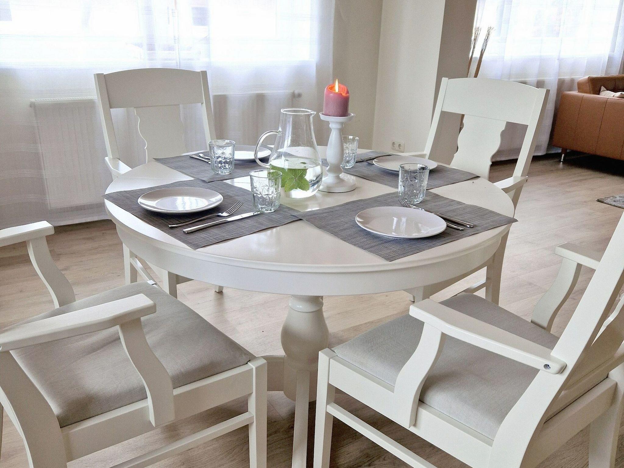 - großes Wohnzimmer (Sofa, Tisch, TV) mit offener Küche (vollausgestattet u.a. mit Geschirrspüler, Backofen, Ceranfeld, Kaffeemaschine, Geschirr, Besteck, Gläser, Kühlschrank u. v. m.), sowie Essbereich für 4 Personen