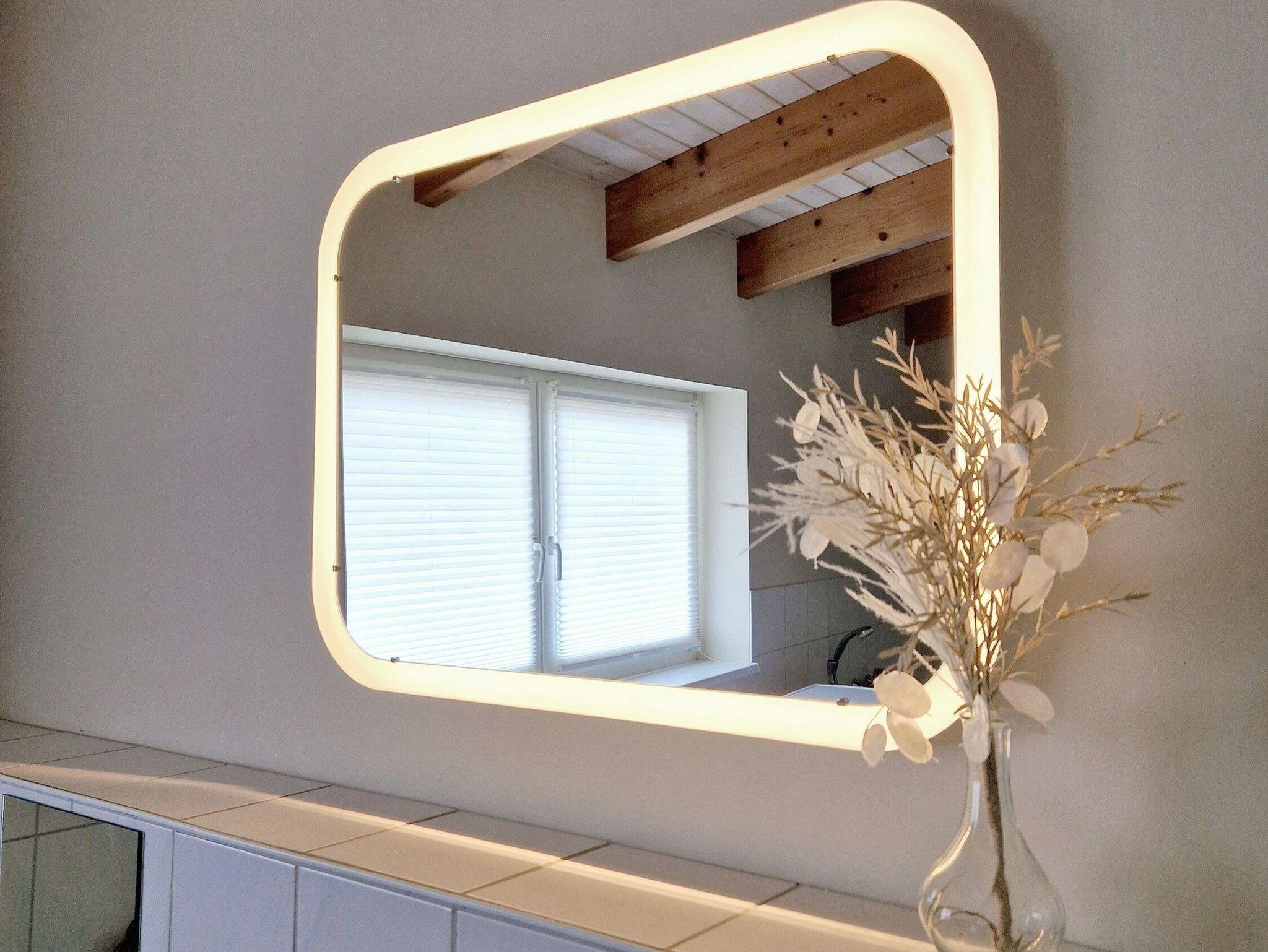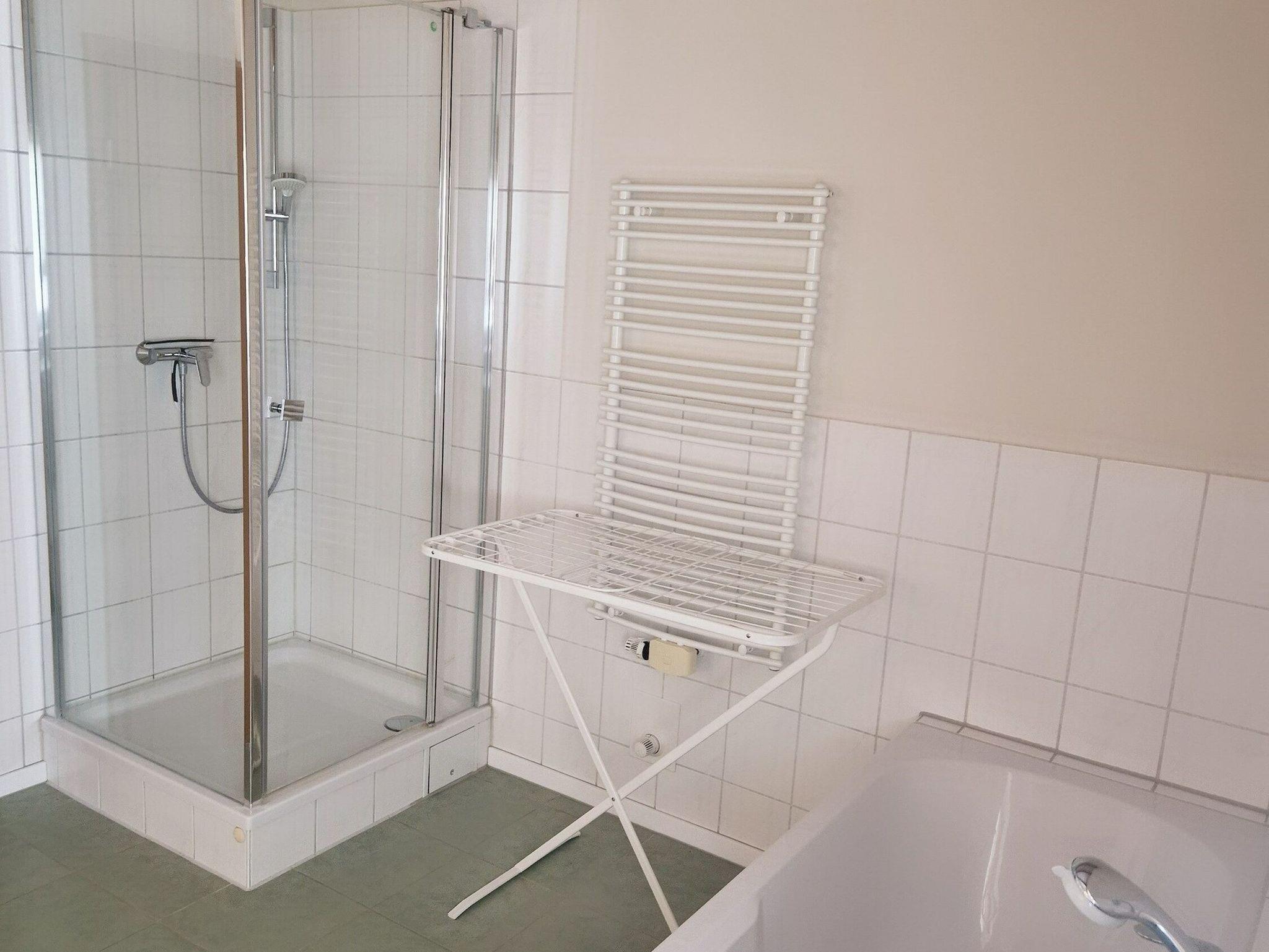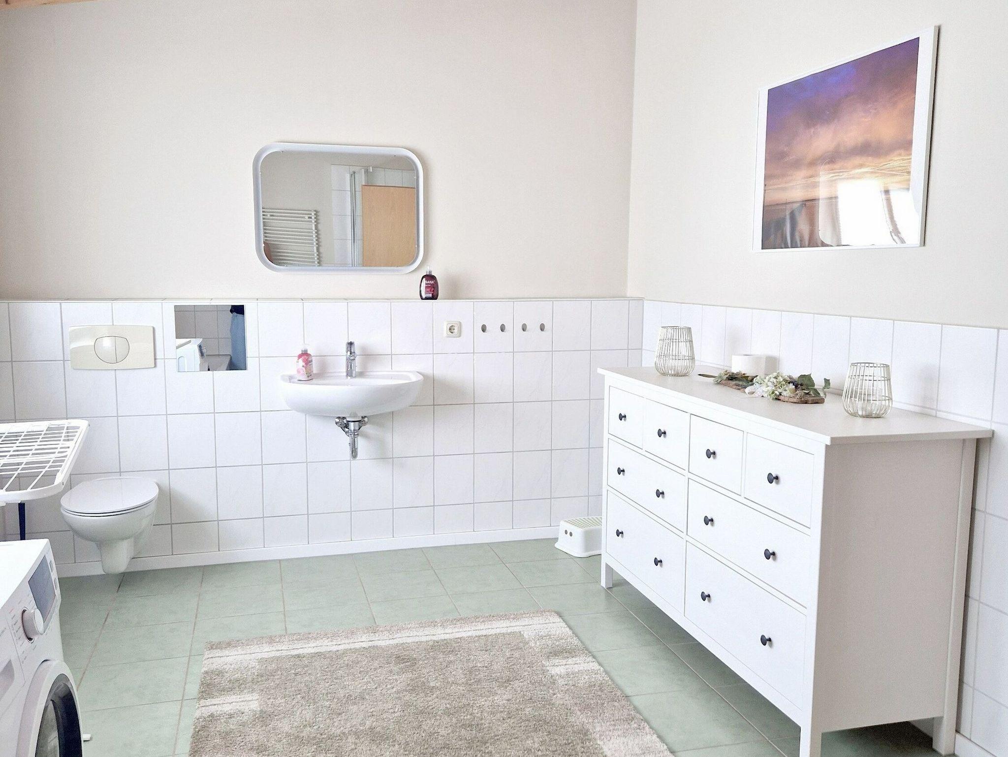- Badezimmer mit Badewanne und Dusche, WC, Spiegelschrank, Waschmaschine und Wäscheständer