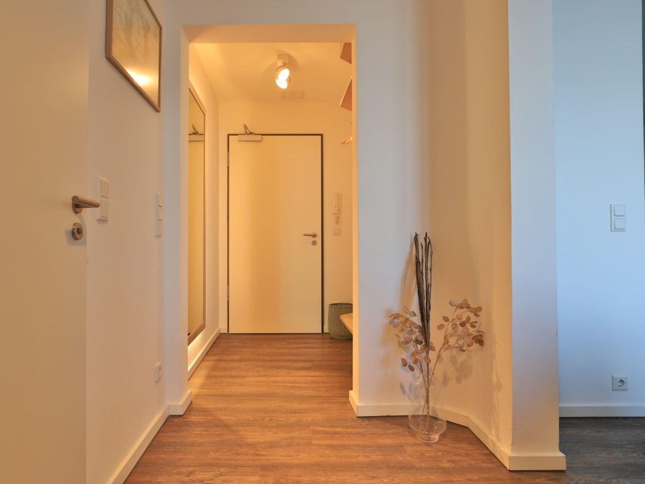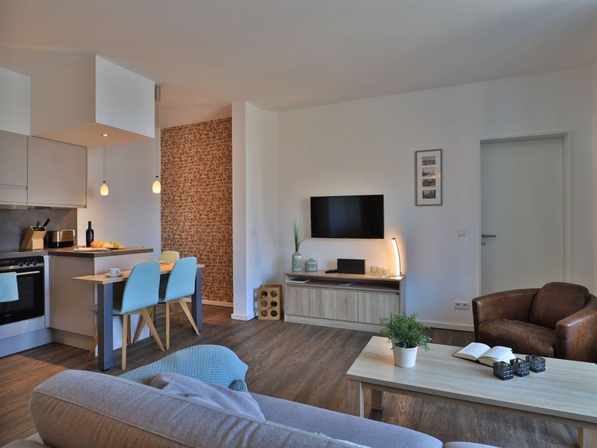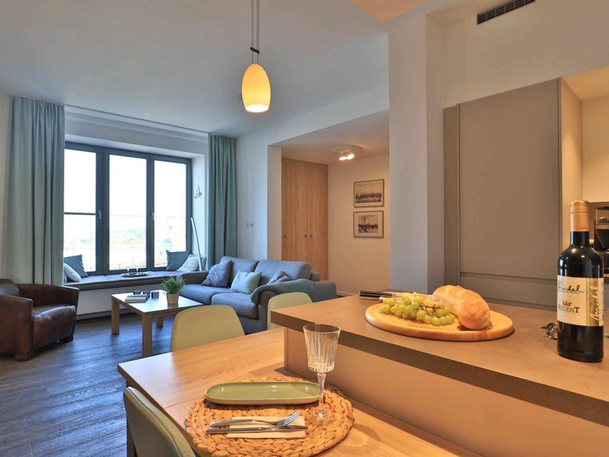 Appartementhaus mit 48 Appartements. Mit 58 m² Wohnfläche bietet das exklusive 2-Zimmer-Appartement Platz für 2 Personen. Über den Lift lässt sich das Appartement in der 5. Etage leicht erreichen. Der kombinierte Wohn- und Essbereich mit einem TV- Gerät mit integrierter Küchenzeile lässt keine Wünsche offen. Das moderne Schlafzimmer mit Doppelbett in Überlänge und einem weiteren TV-Gerät bietet direkten Zugang auf den nach Nord/ West gelegenen Balkon. Hier genießen Sie einen zauberhaften Hafenblick. Weiterhin steht Ihnen ein hochwertig eingerichtetes Duschbad zur Verfügung. Bei Anreise sind 2 Betten bezogen und Handtücher liegen für Sie bereit. WLAN steht Ihnen kostenfrei zur Verfügung. In unmittelbarer Nähe sind öffentliche Parkplätze vorhanden.