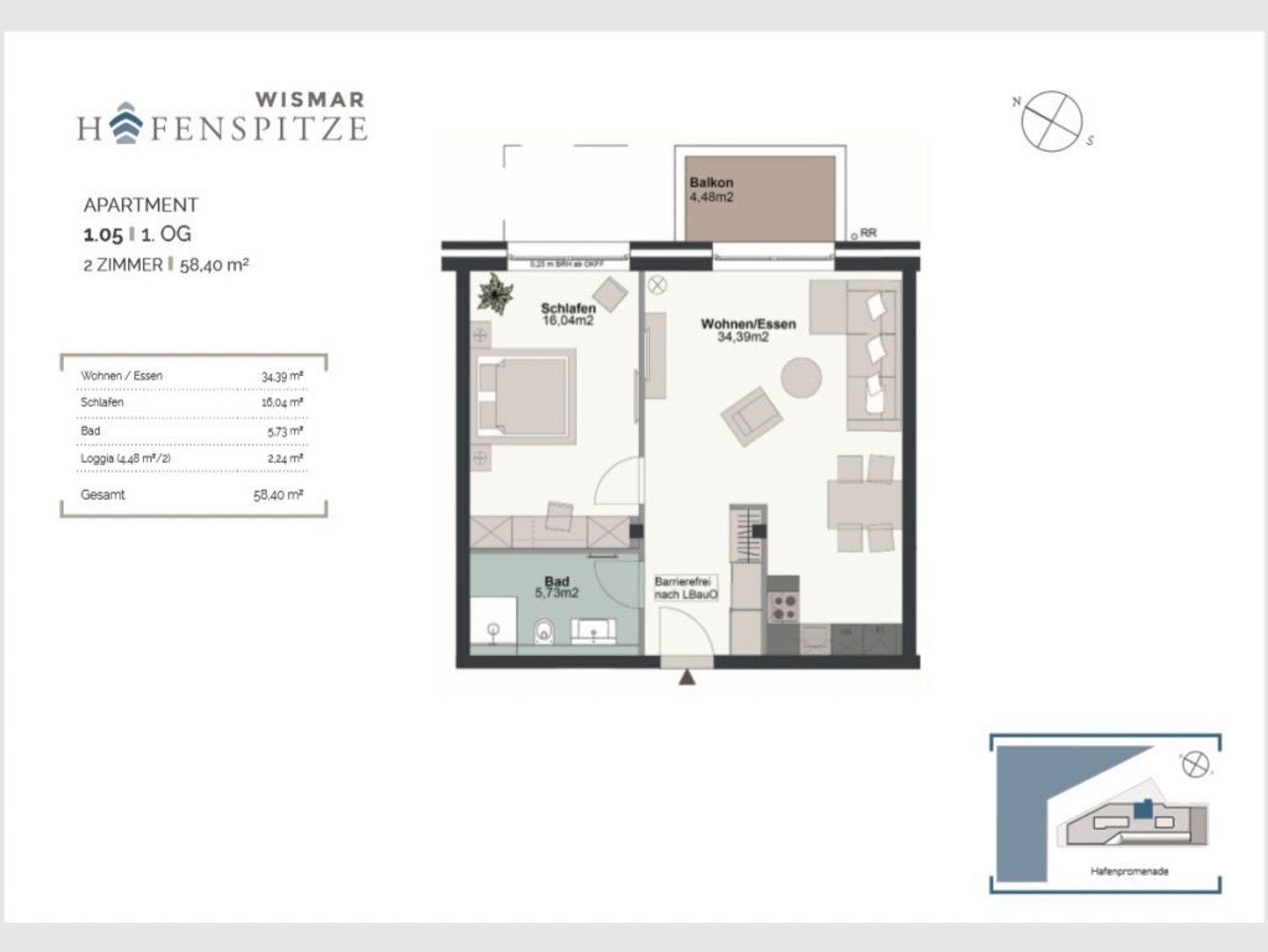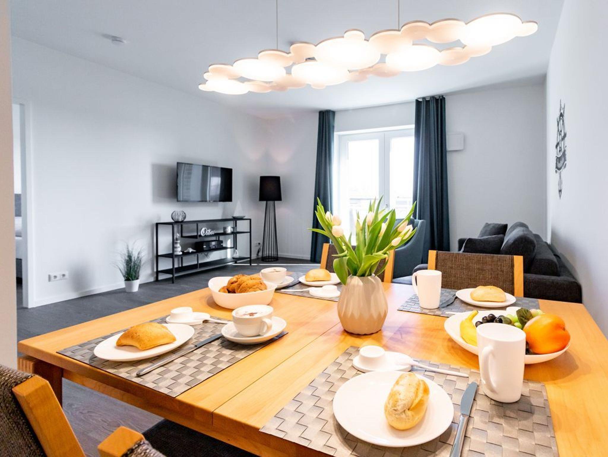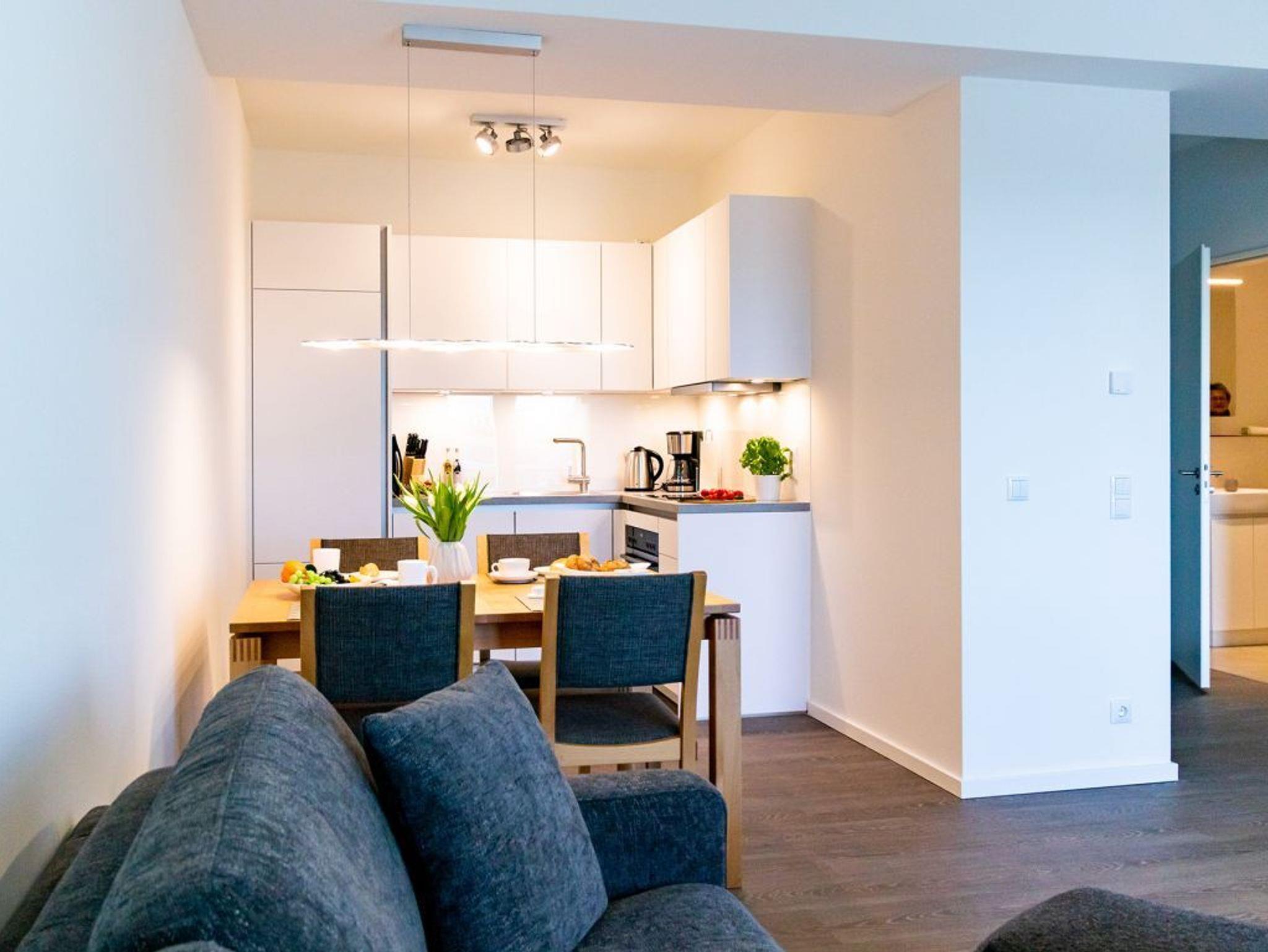 Freuen Sie sich auf einen erholsamen und erlebnisreichen Urlaub in direkter Hafenlage. Mit hochwertiger Ausstattung empfängt Sie das 2-Zimmer-Appartement Hafenspitze 5, welches sich in der 1. Etage befindet und mit dem Fahrstuhl bequem erreicht werden kann. Der zugehörige Balkon in Nord/ Ost Ausrichtung bietet die Aussicht auf den Holzhafen und die Ostsee. Die großzügige Wohnfläche von 59qm ist vorgesehen für eine Belegung mit maximal 4 Personen. Das gesamte Appartement verwöhnt zudem mit einer Fußbodenheizung. Machen Sie es sich gemütlich in dem modern möblierten Wohn-Essbereich mit bodentiefen Fenstern, in dem auch ein internetfähiger Fernseher, Internetradio und kostenfreies WLAN vorhanden sind. Die offene Küchenzeile ist in den Wohnbereich integriert und vollständig ausgestattet, so dass Sie sich gerne auch selbst versorgen können.