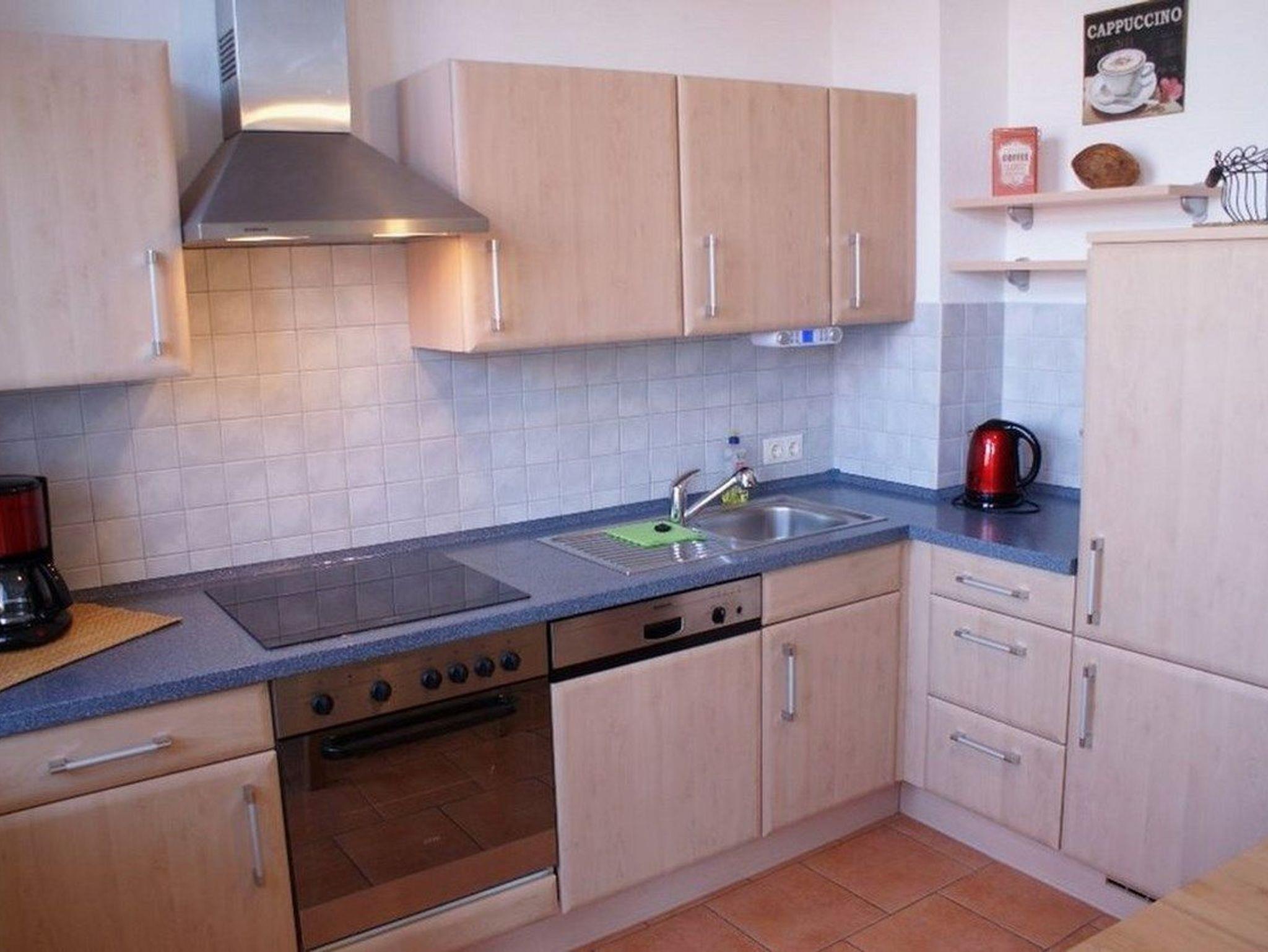 Zur Ferienwohnung gehört eine moderne gut ausgestattete Einbauküche mit Kühl ? Gefrierkombi, Geschirrspüler, Spüle, Ceran E- Herd mit Backofen, Abzugshaube, Kaffeemaschine, Toaster, Wasserkocher, sowie ein Esstisch und Stühle. Der Balkon bietet den Blick auf den Wismarer Seehafen.