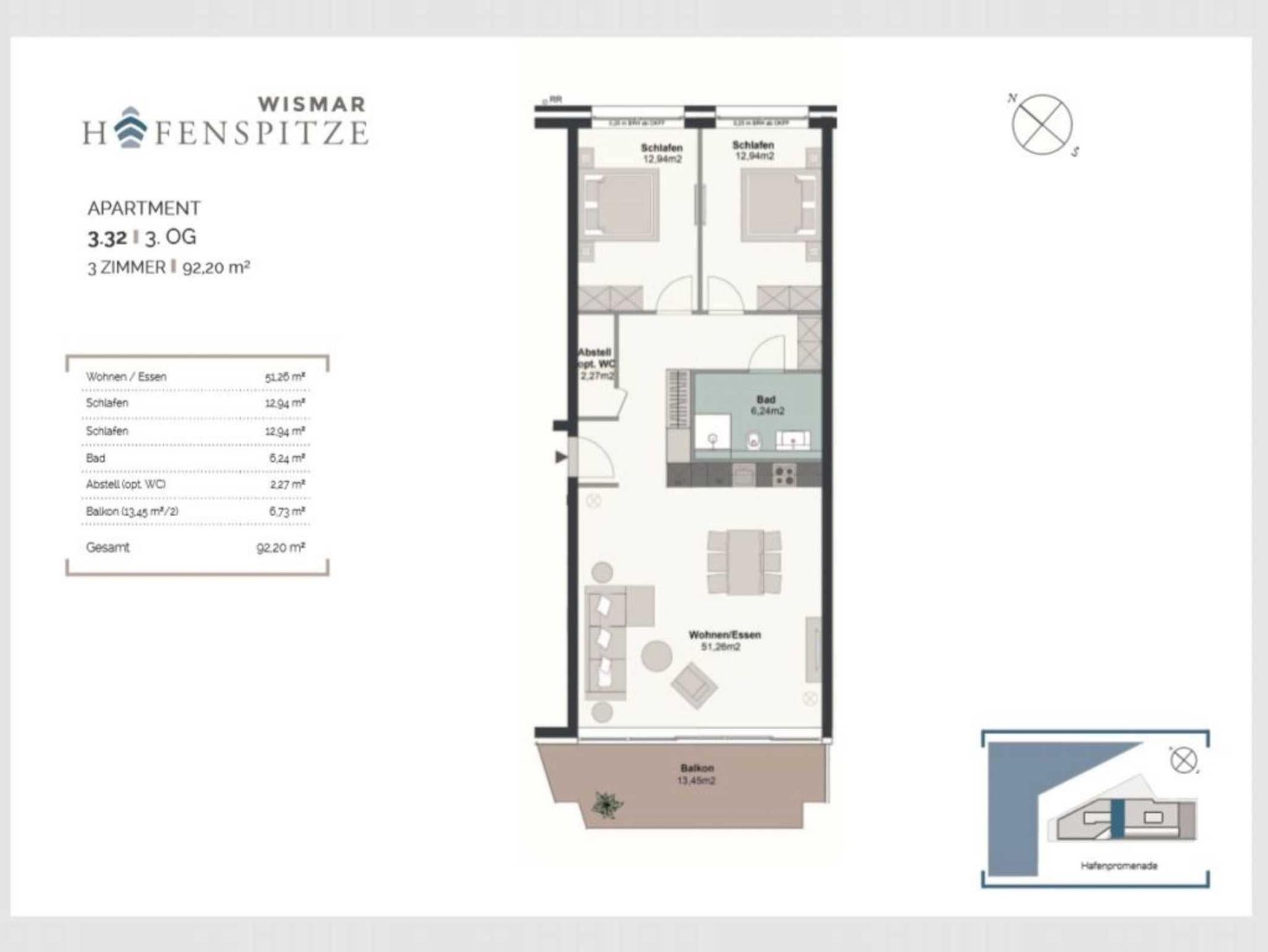 Das perfekte Urlaubsdomizil für unsere Gäste, die Wert auf großzügiges, luxuriöses Wohnen legen. Das 3-Zimmer-Appartement Hafenspitze 32 verwöhnt Sie mit einer Wohnfläche von 93qm. Eine Belegung ist mit bis zu 4 Personen möglich. Die Ferienwohnung besitzt zudem eine sonnige Loggia im Hafenblick, wobei elektrisch bedienbare Außenrollos für sommerlichen Wärmeschutz sorgen. Der einladende Wohn-Essbereich bietet eine komfortable Möblierung mit bequemer Sitzgarnitur und einem Esstisch.