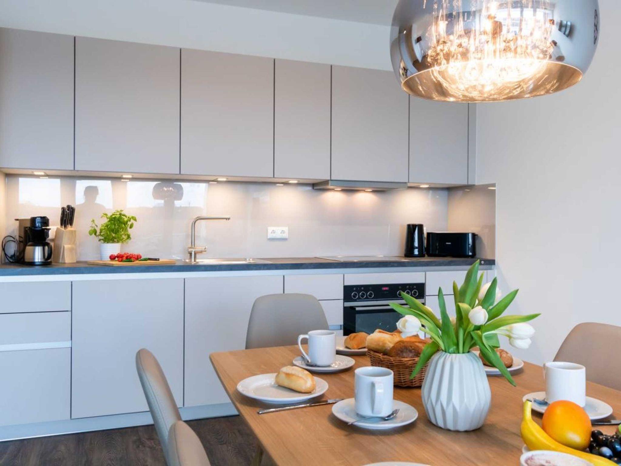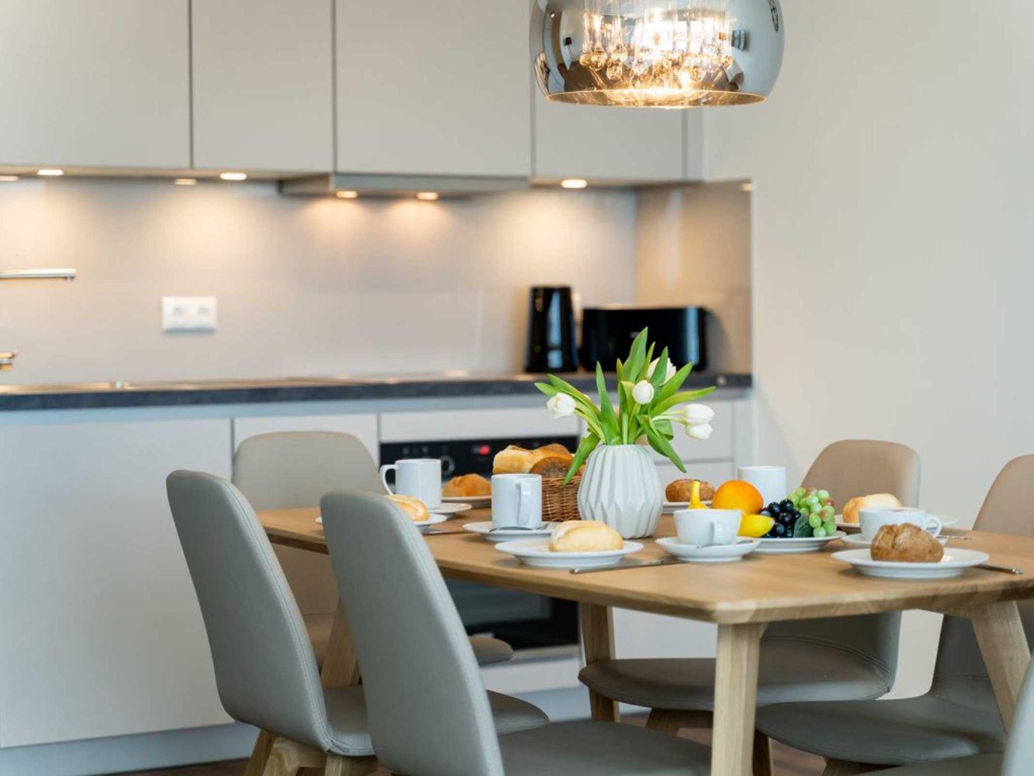 Die in den Wohnbereich integrierte Küchenzeile ist offen und mit hochwertigen technischen Geräten ausgestattet, die für die Zubereitung von Urlaubsmahlzeiten benötigt werden. Technische Unterhaltungselektronik bieten Flachbild Fernseher mit Hotelmodus sowie Internetradio und kostenfreies WLAN. Zwei separate Schlafzimmer mit jeweils 2 Schlafgelegenheiten sowie Garderobenschränke für Ihre Urlaubsgarderobe ermöglichen entspannte Nächte.