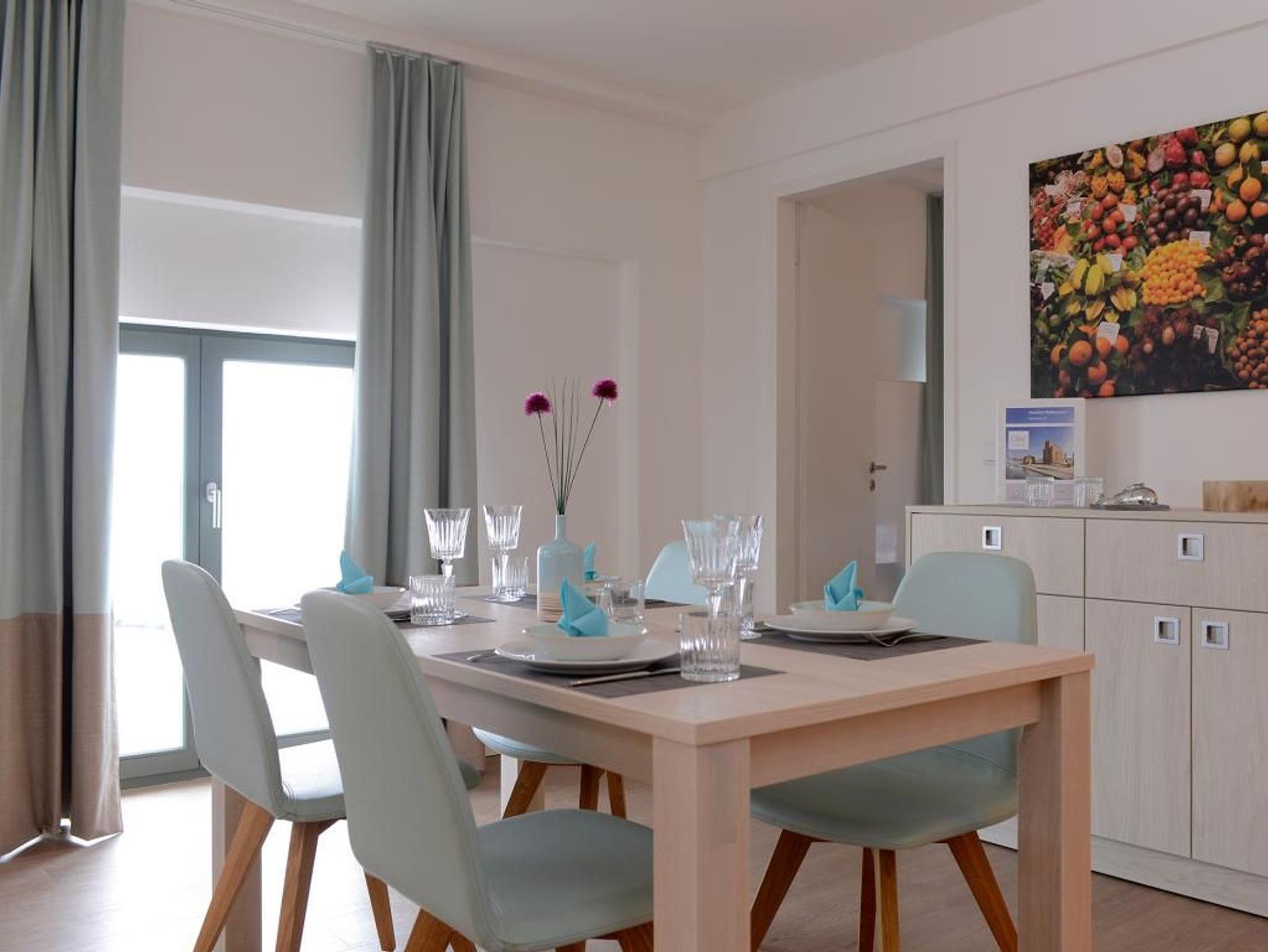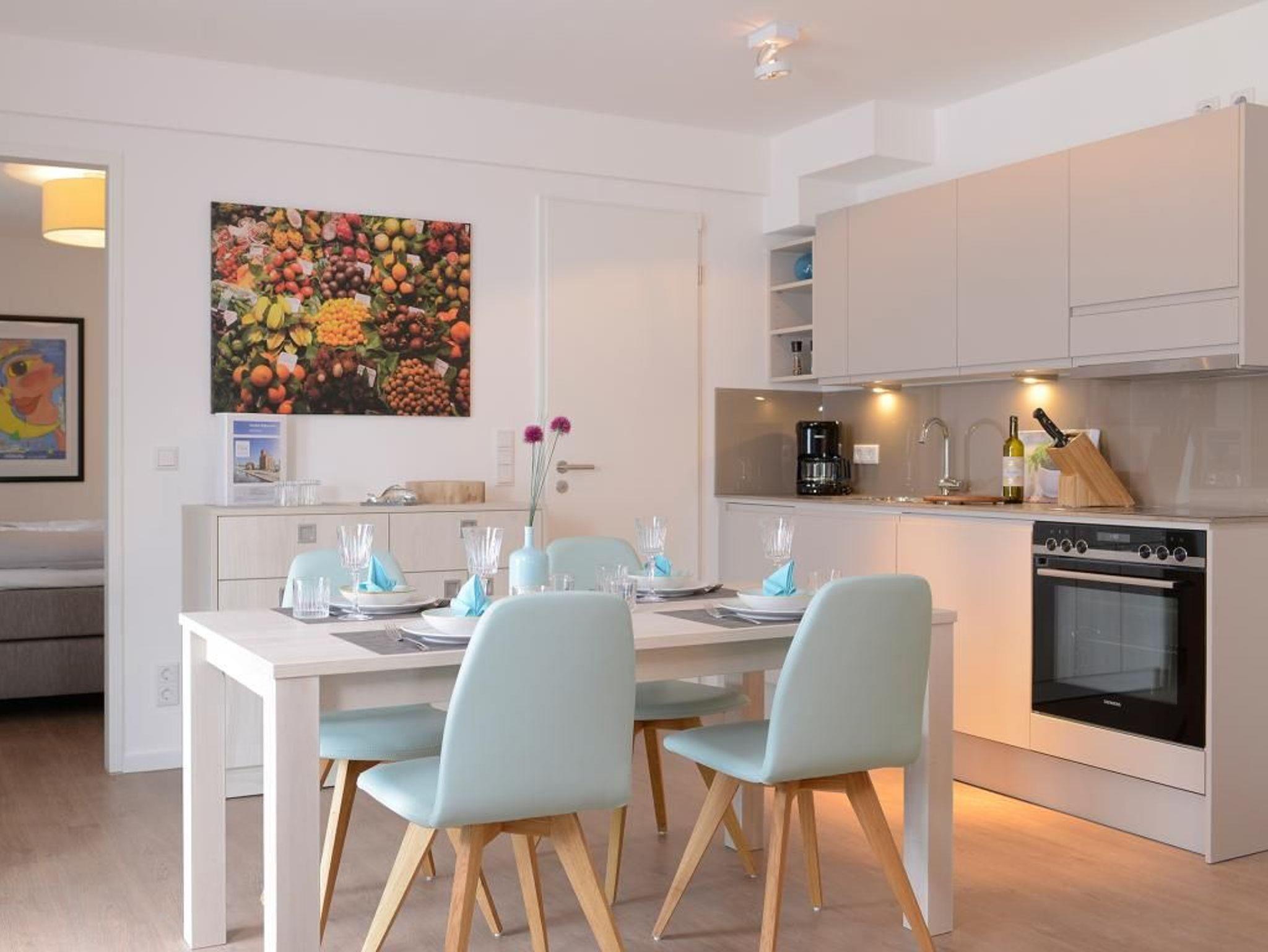 Appartementhaus mit 48 Appartements. Auf 62 m² können hier bis zu 4 Personen einen traumhaften Urlaub verbringen. Mit dem Lift erreichen Sie das wunderschöne Appartement in der 6. Etage ganz einfach. Der exklusiv eingerichtete Wohn- und Essbereich mit einer Essecke und einem TV-Gerät lädt zum Verweilen ein. Die geschickt integrierte voll ausgestattete Küchenzeile sorgt für alle Annehmlichkeiten. Zwei separate Schlafzimmer, mit jeweils einem Doppelbett sorgen für erholsamen Schlaf. Des Weiteren verfügt dieses Appartement über ein modernes Duschbad sowie ein Gäste WC. Bei Anreise sind 2 Betten bezogen und Handtücher liegen für Sie bereit. WLAN steht Ihnen kostenfrei zur Verfügung. In unmittelbarer Nähe sind öffentliche Parkplätze vorhanden.