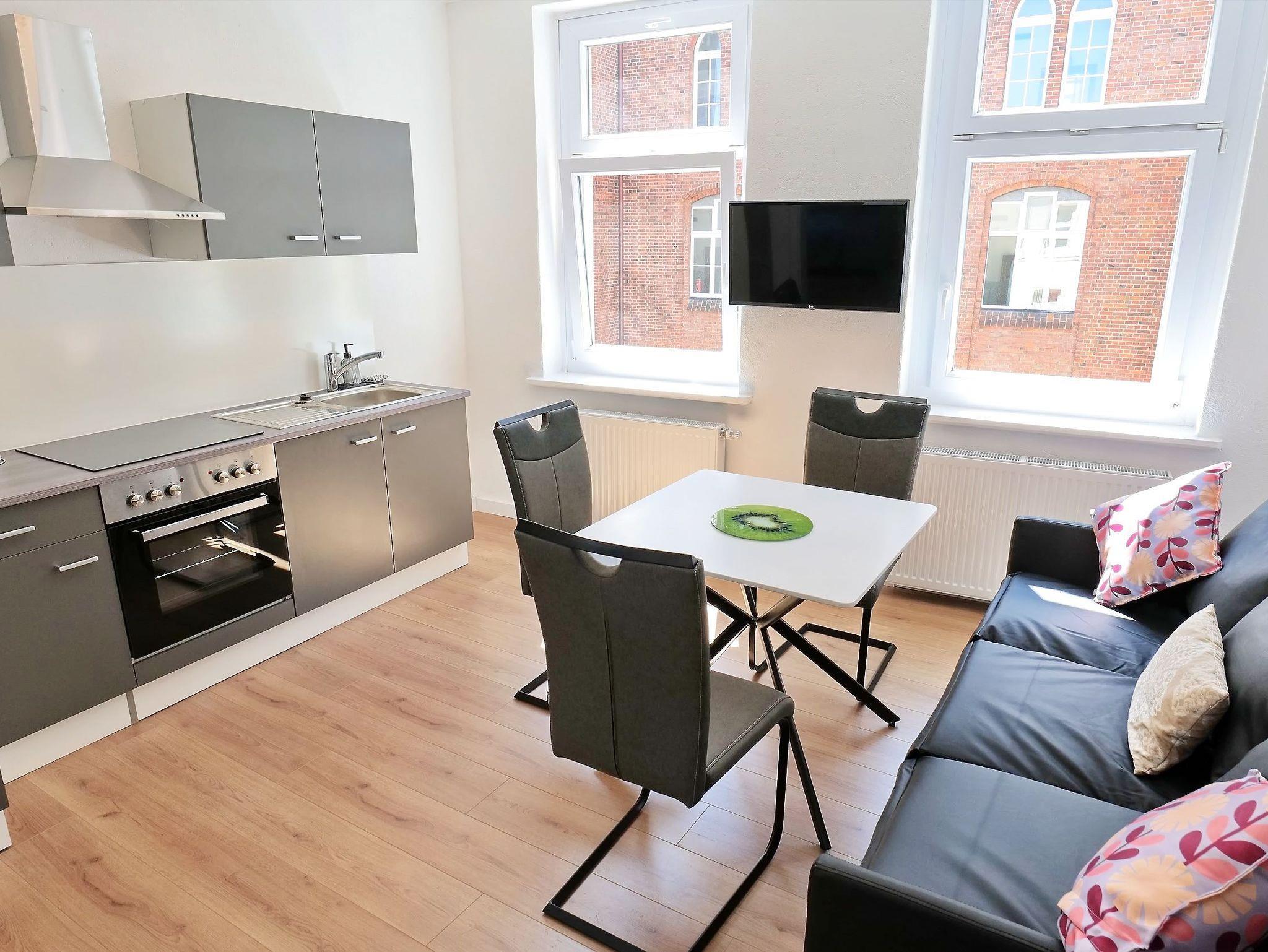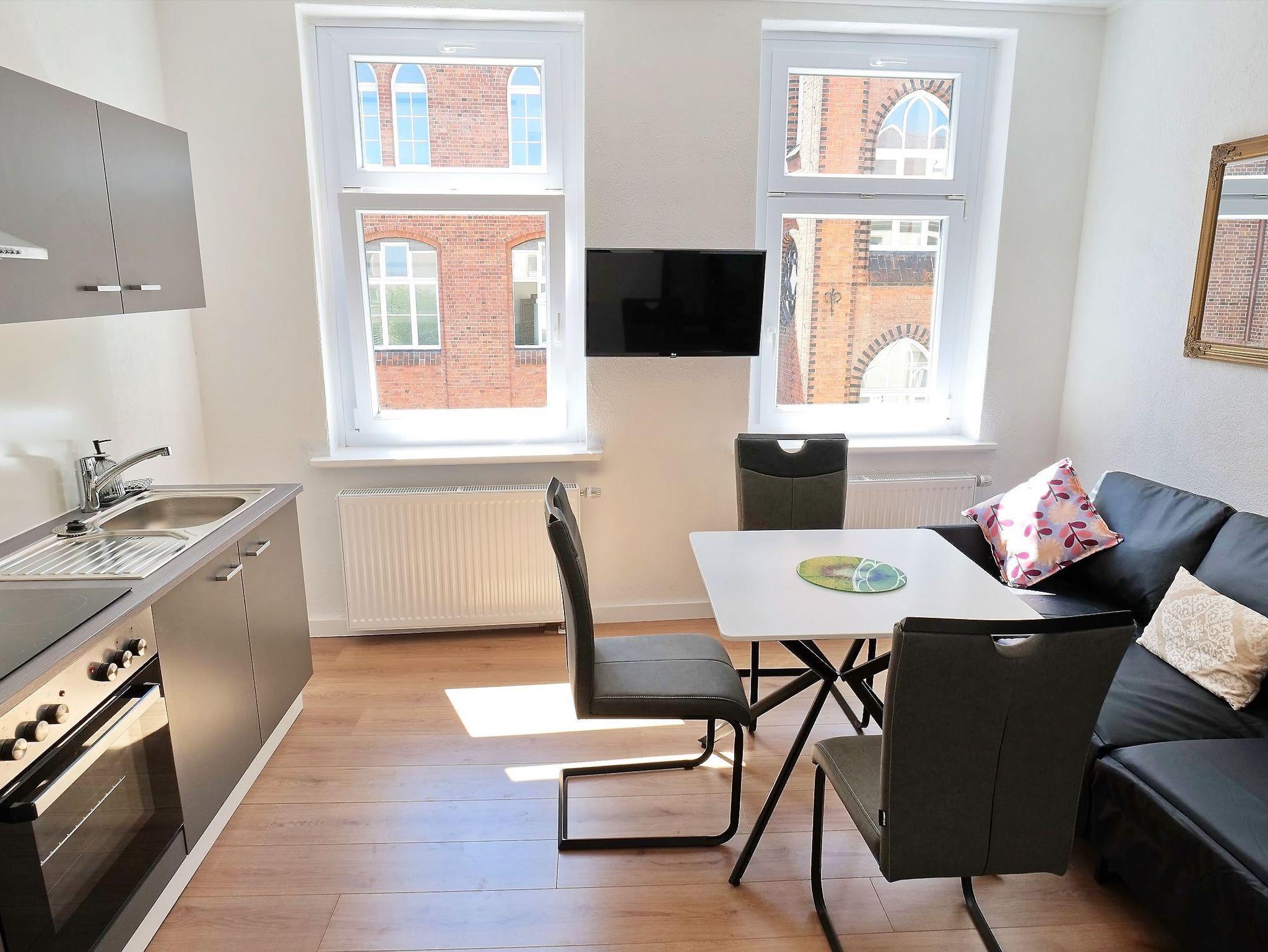 Modernes Apartment nahe Wismarer Marktplatz mit offener Küche und WLAN, ideal für entspannte Städtereisen.