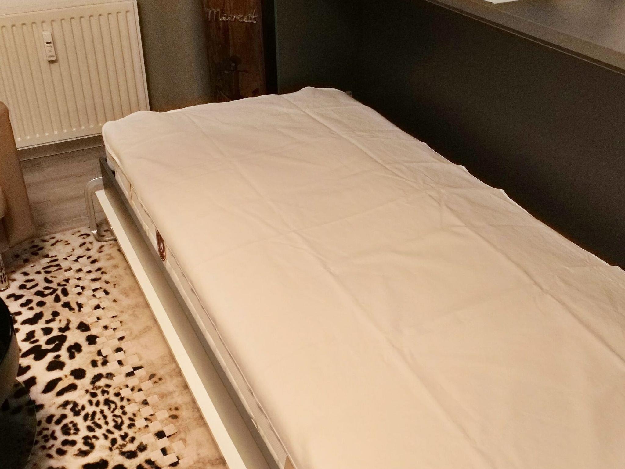 • 1 Schlafzimmer getrennt durch große Tür vom Wohnzimmer mit großem Boxspringbett (1,80 x 2,00 m), sowie ausreichend Stauraum für Ihre Kleidung. Hochwertige Biobettdecken und Kopfkissen allergikergeeignet.