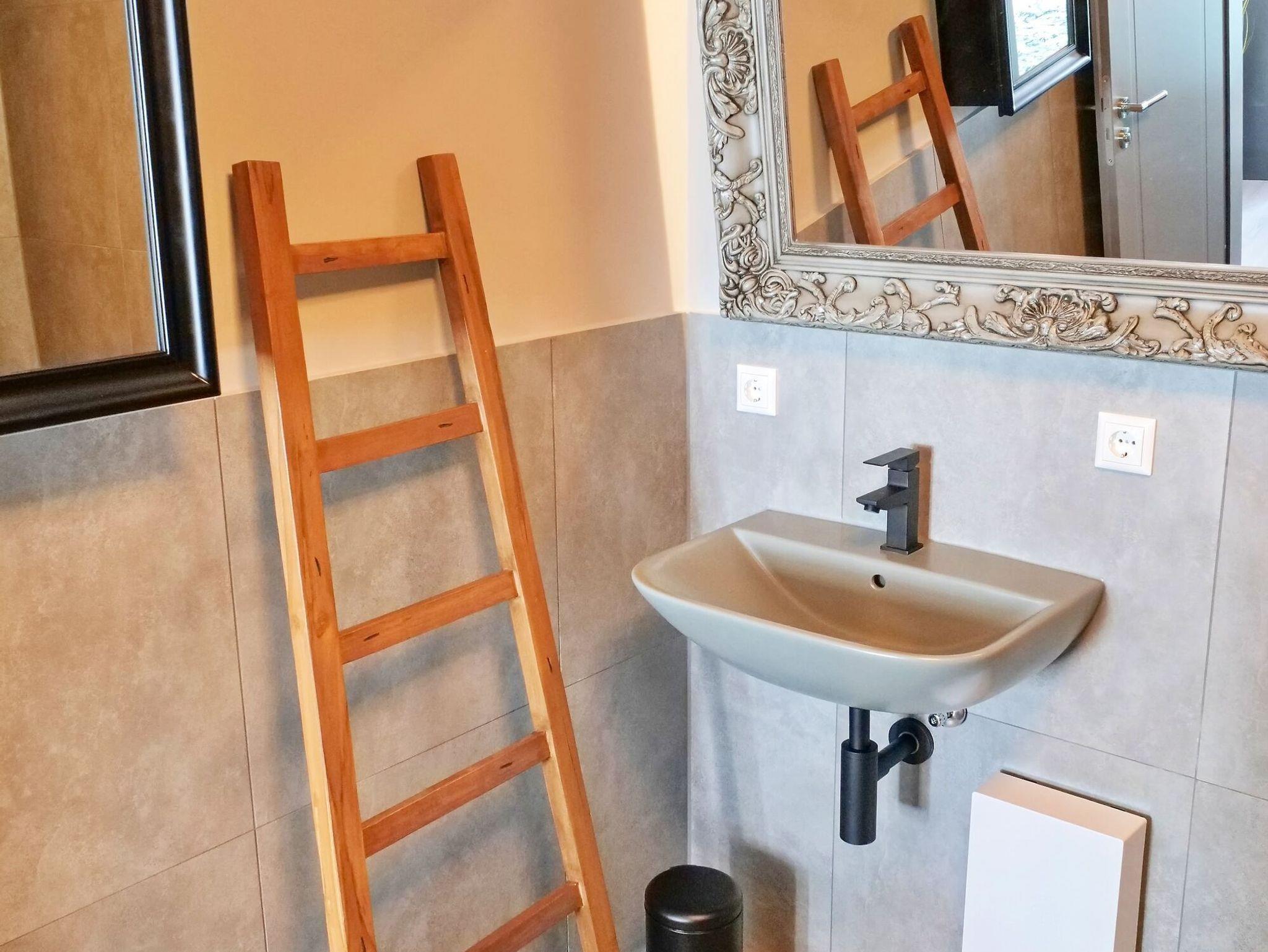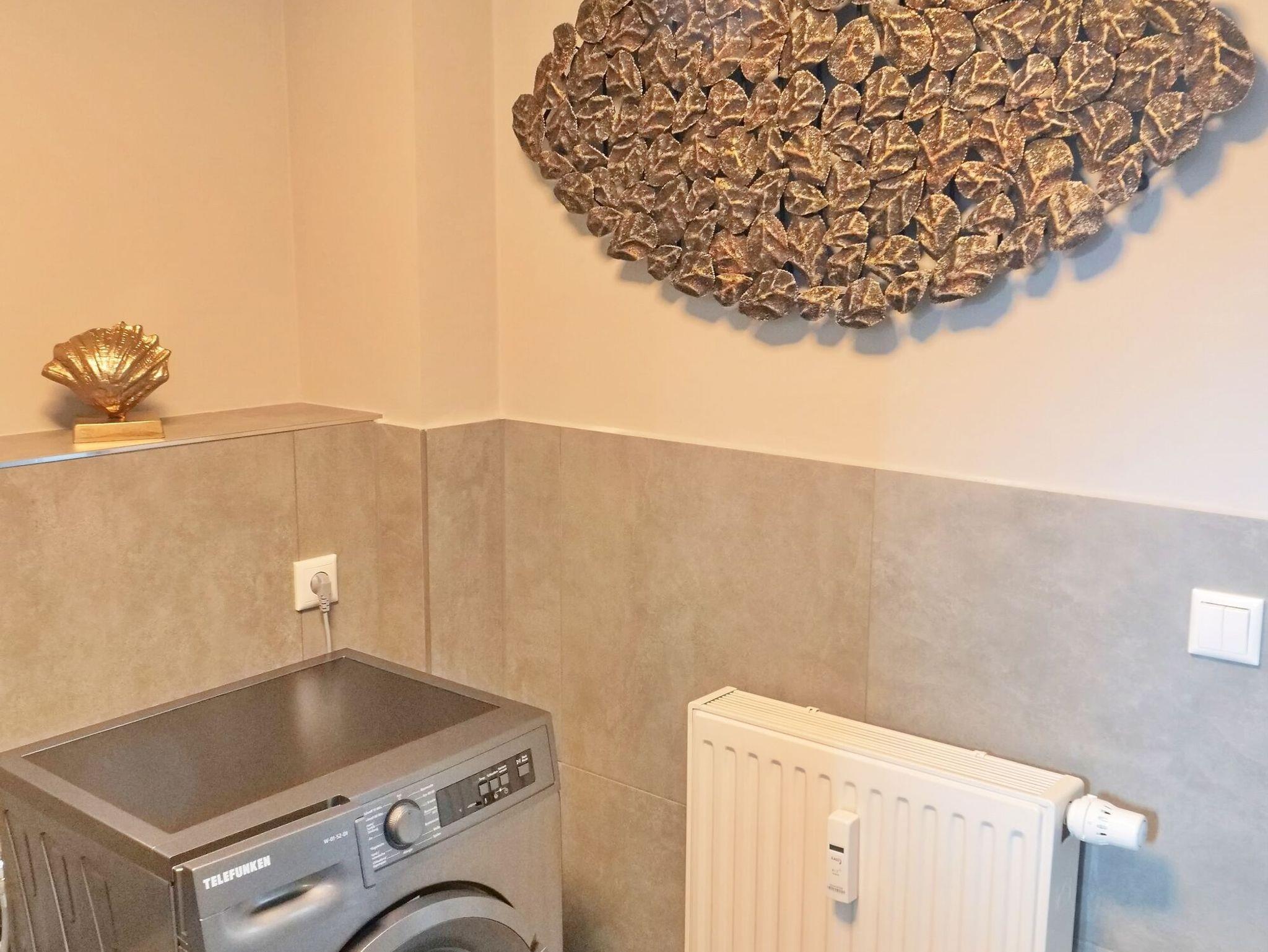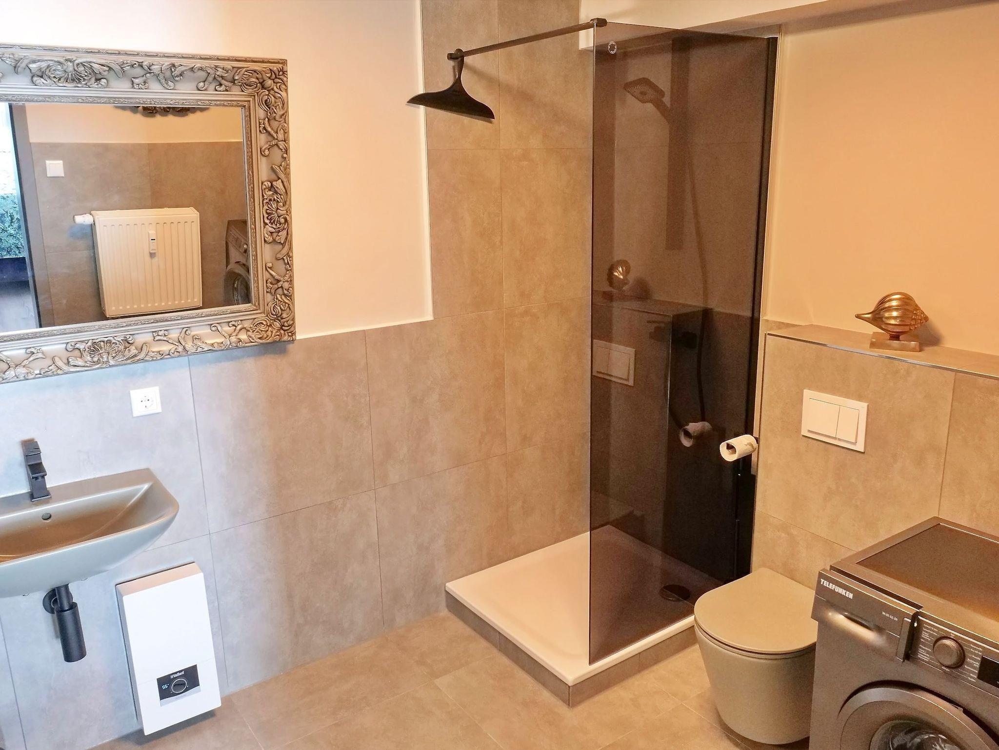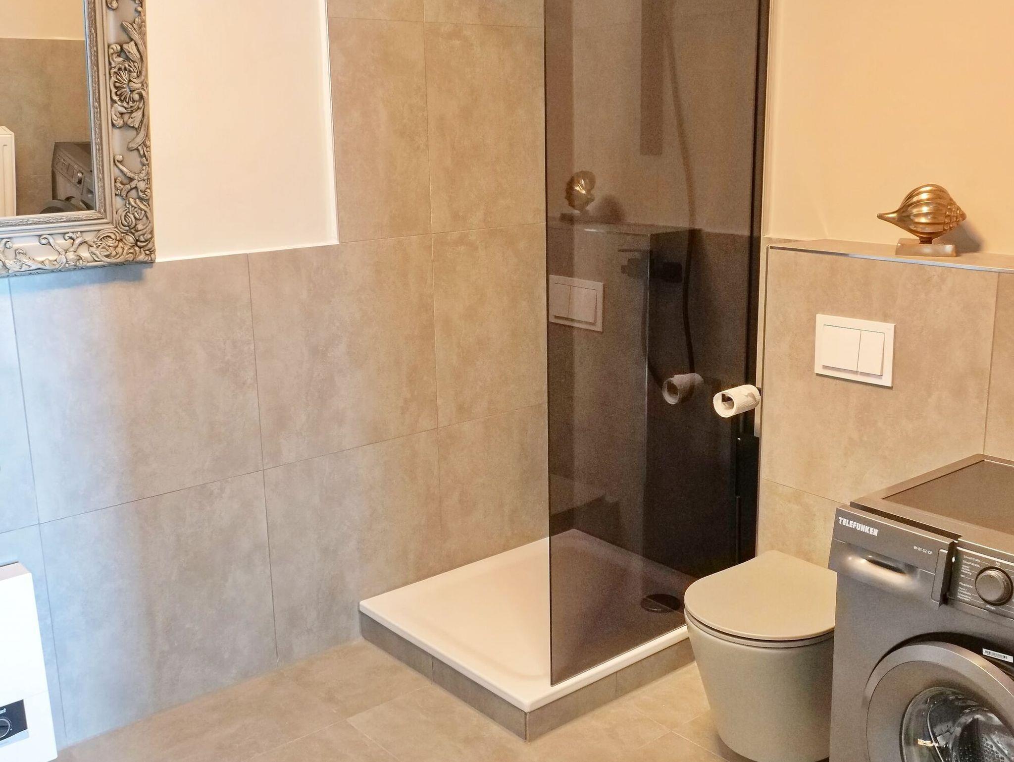 • Schickes Badezimmer mit Dusche, WC, Spiegel und ausreichend Ablagefläche für Ihre Beautyutensilien. Eine Waschmaschine und ein Wäscheständer sind vorhanden.