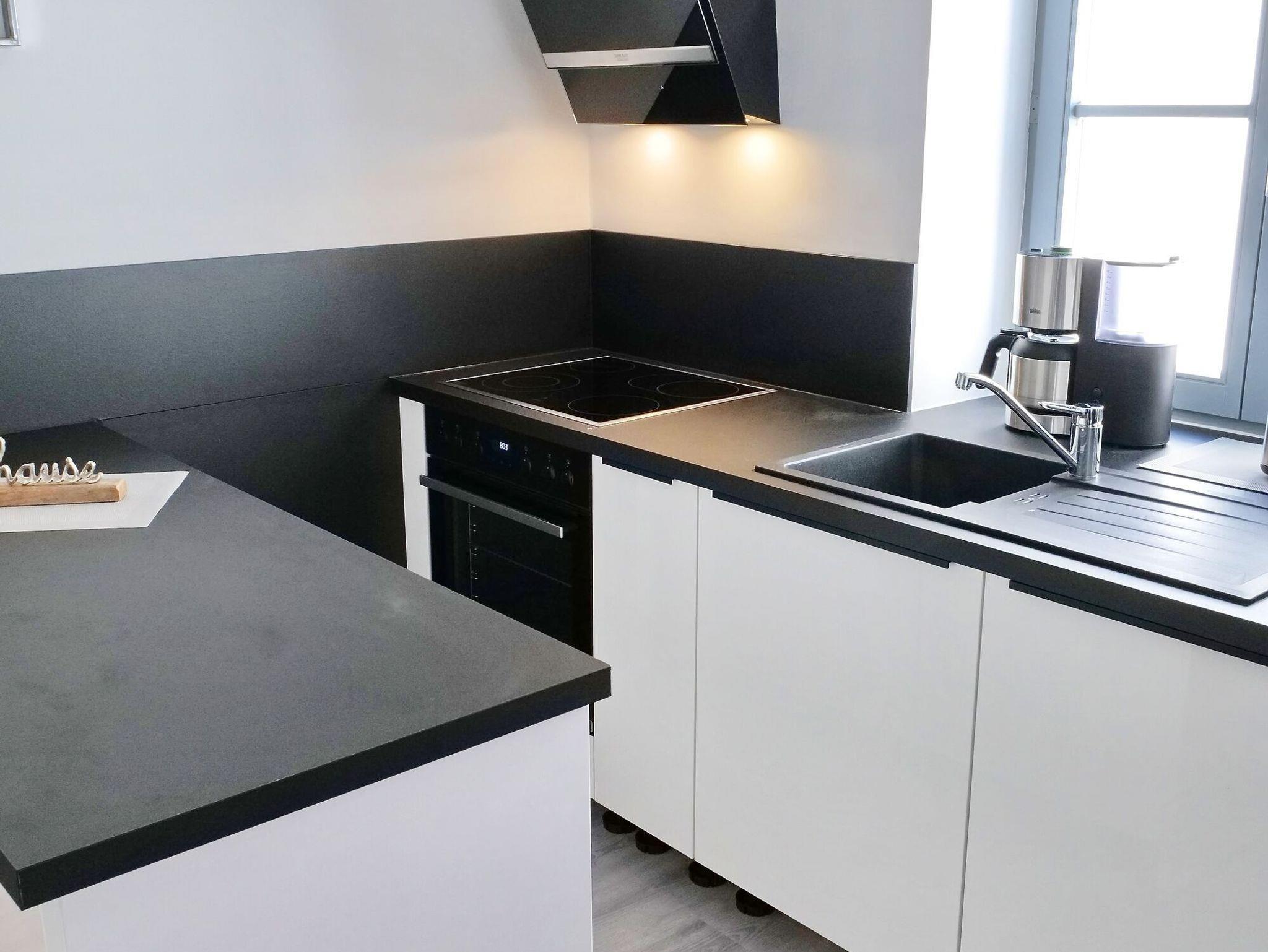 • Moderne Küche mit Backofen, Ceranherd, Wasserkocher, Kaffeemaschine, Geschirrspüler, Kühlschrank, Toaster, Geschirr, Gläser, Besteck uvm..